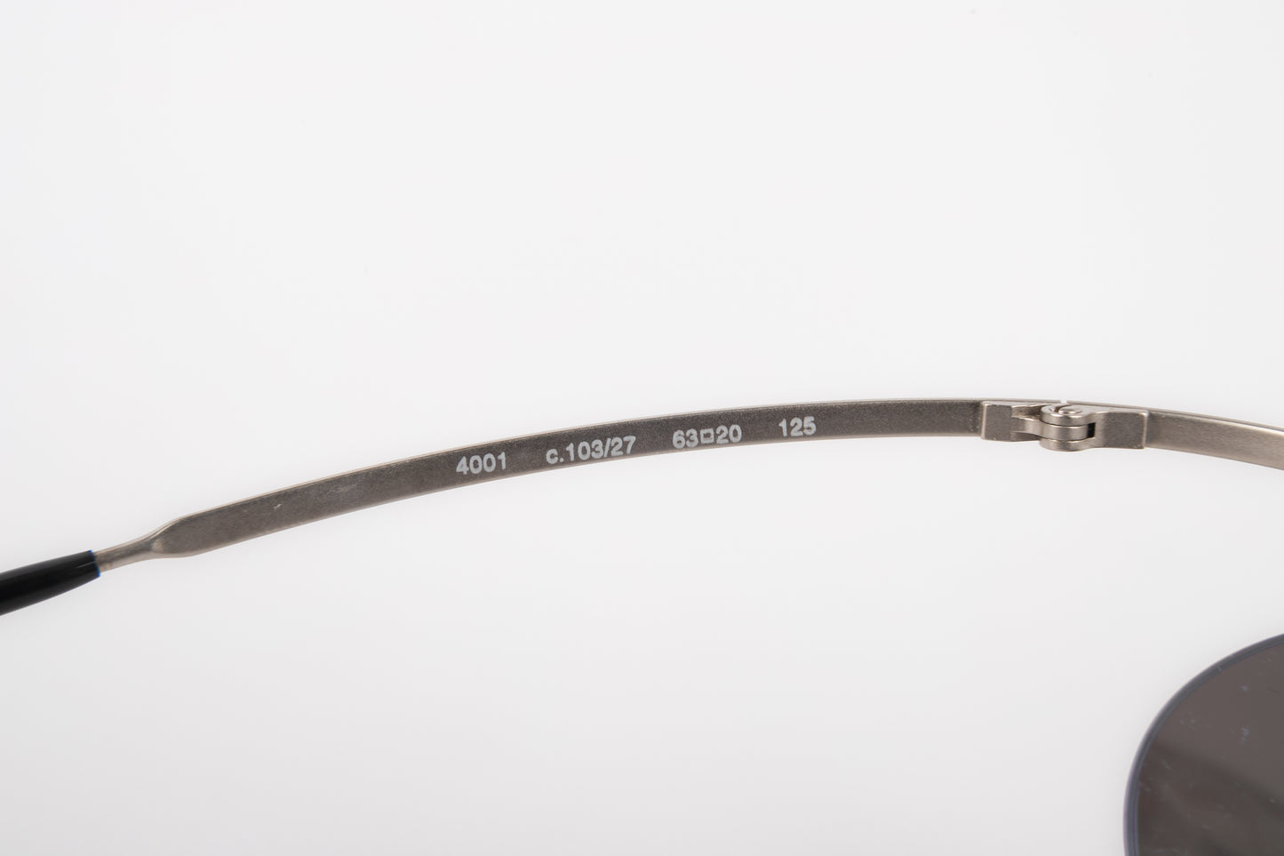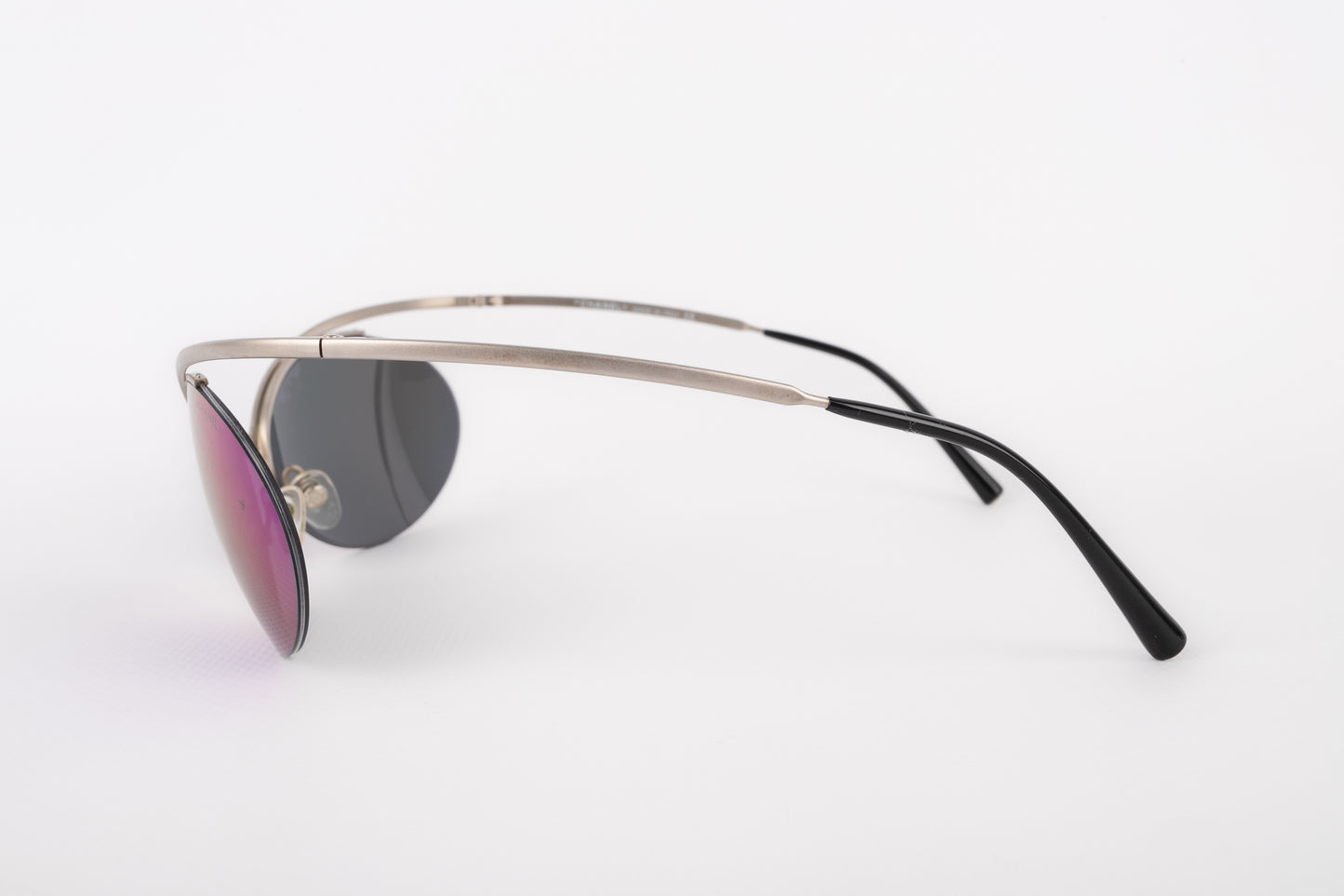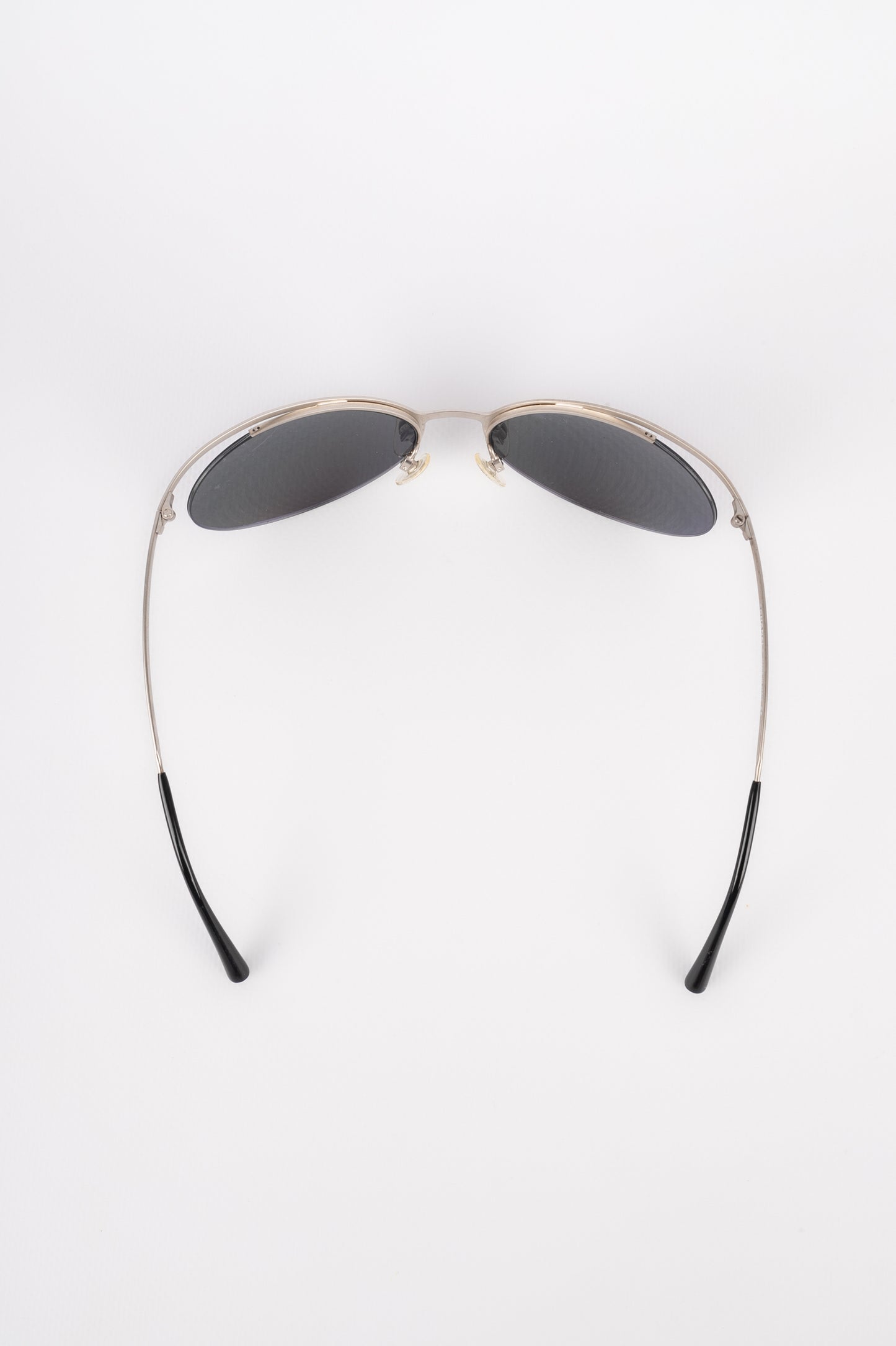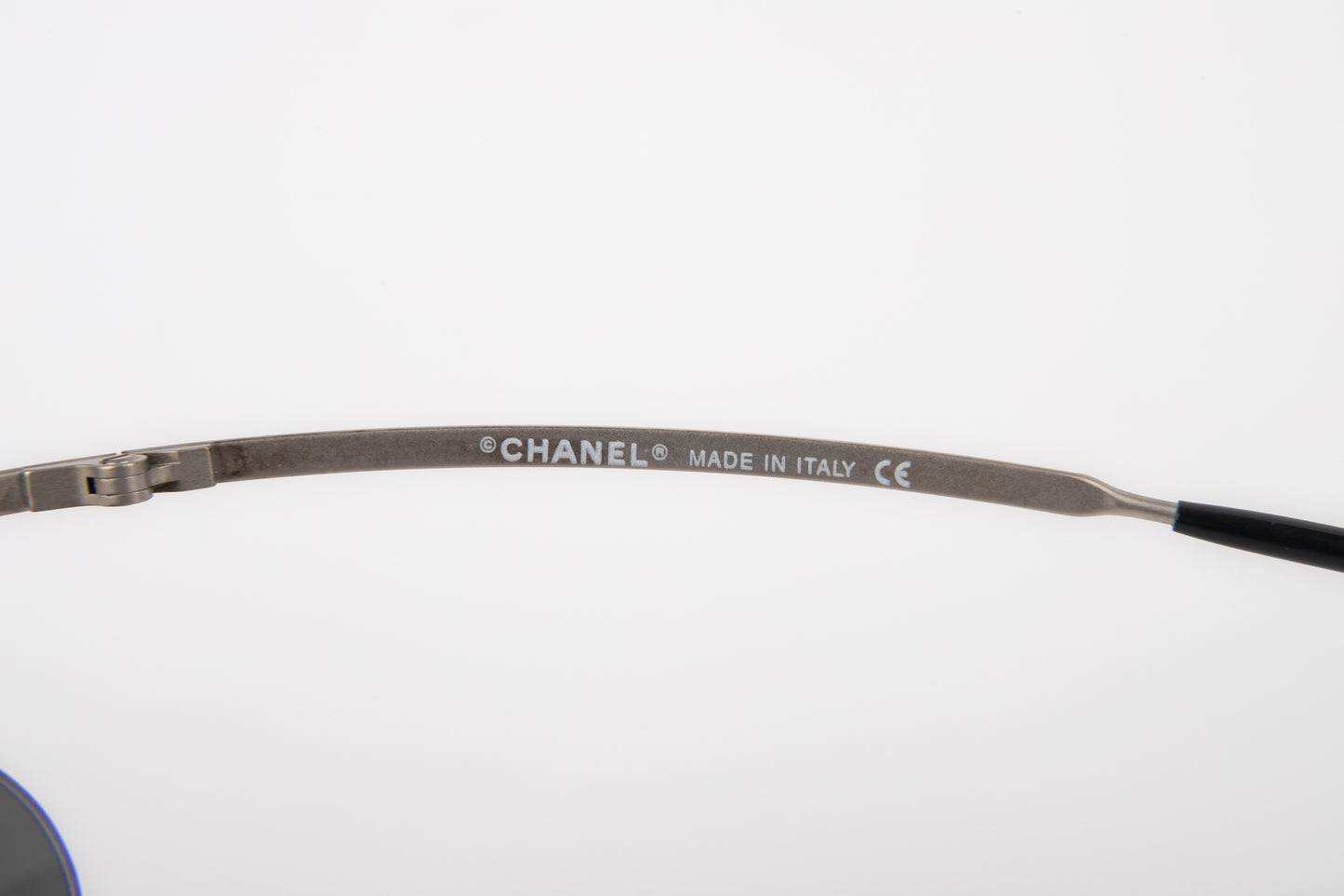 CHANEL -(Made in Italy) Lunettes de soleil en métal argenté, verres teintés dans les tons de bleu et de violet.