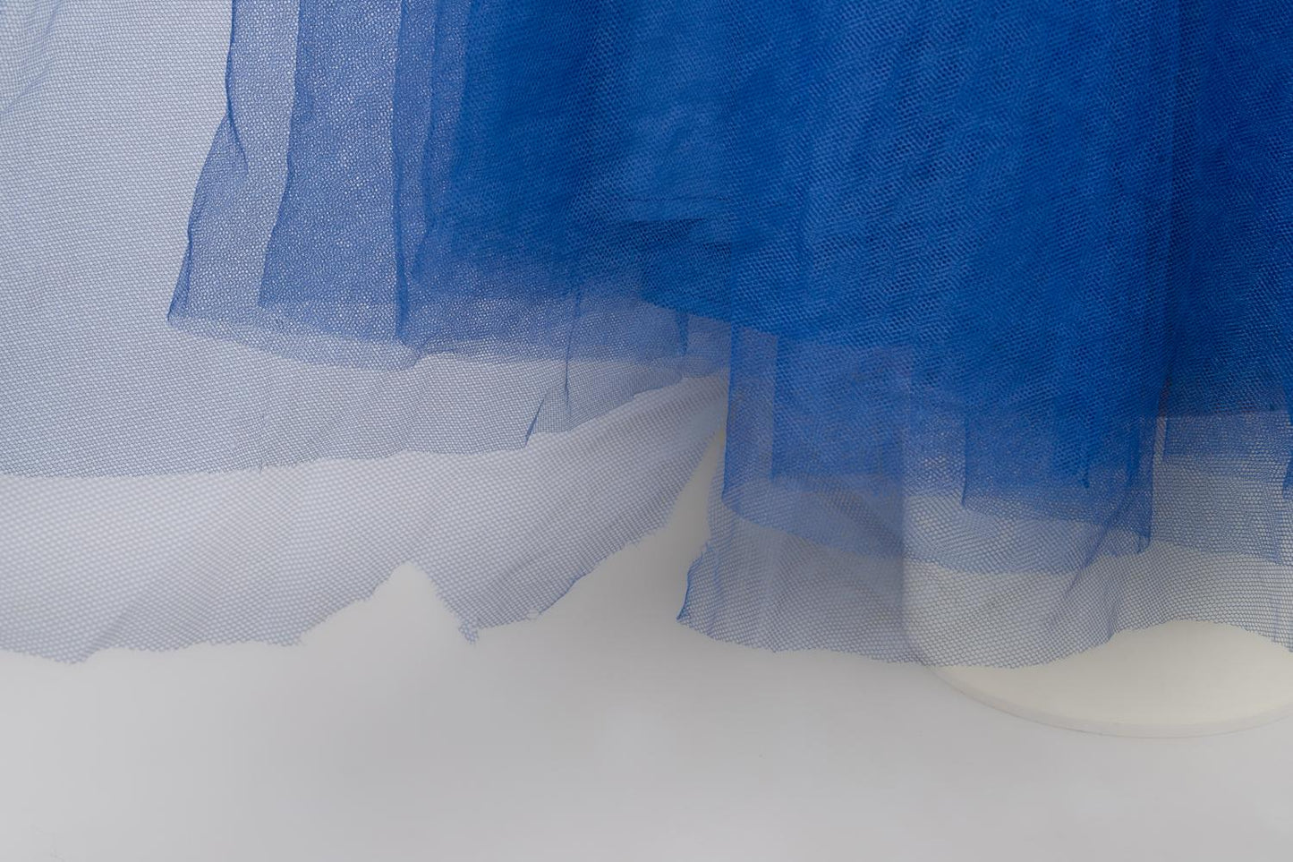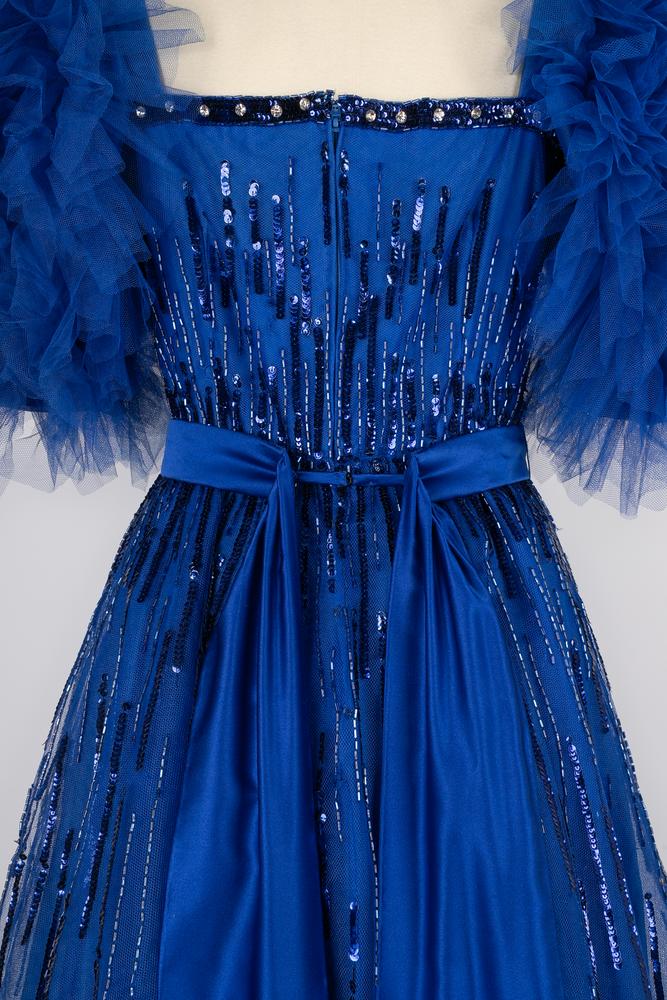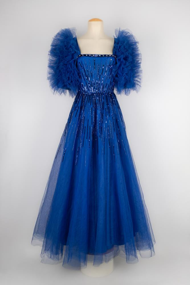 LOUIS FERAUD -(Made in France) Robe grand soir en satin et tulle bleu roi. Le bustier est brodé de sequins bleus. Les manches trois-quarts sont en volants de tulle. Etiquettes de composition et de taille absentes, elle convient à un 40FR.