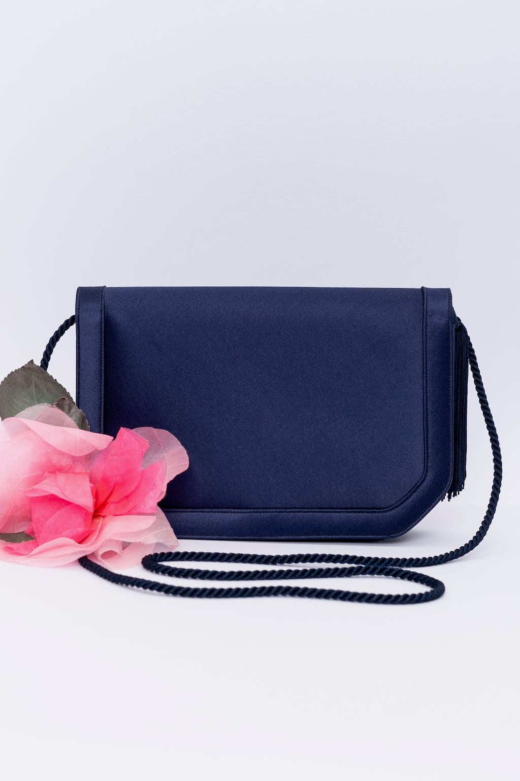 RENAUD PELLEGRINO (Made in France) Pochette du soir en satin bleu foncé agrémenté d'un pompon en passementerie. Porté épaule, il dispose d'une anse.