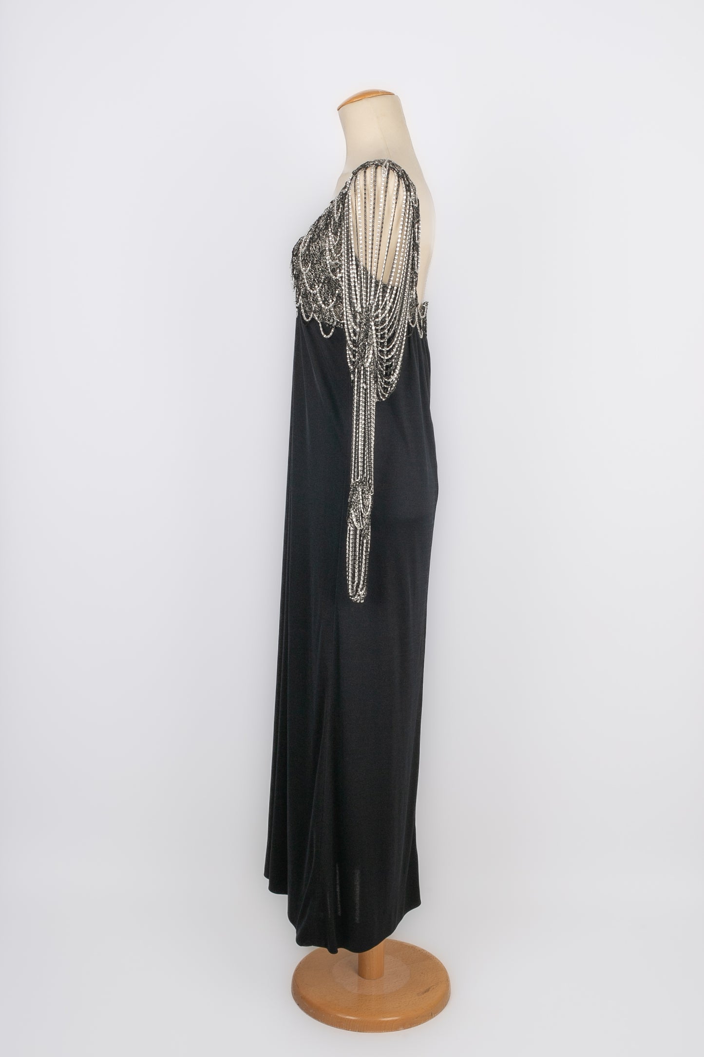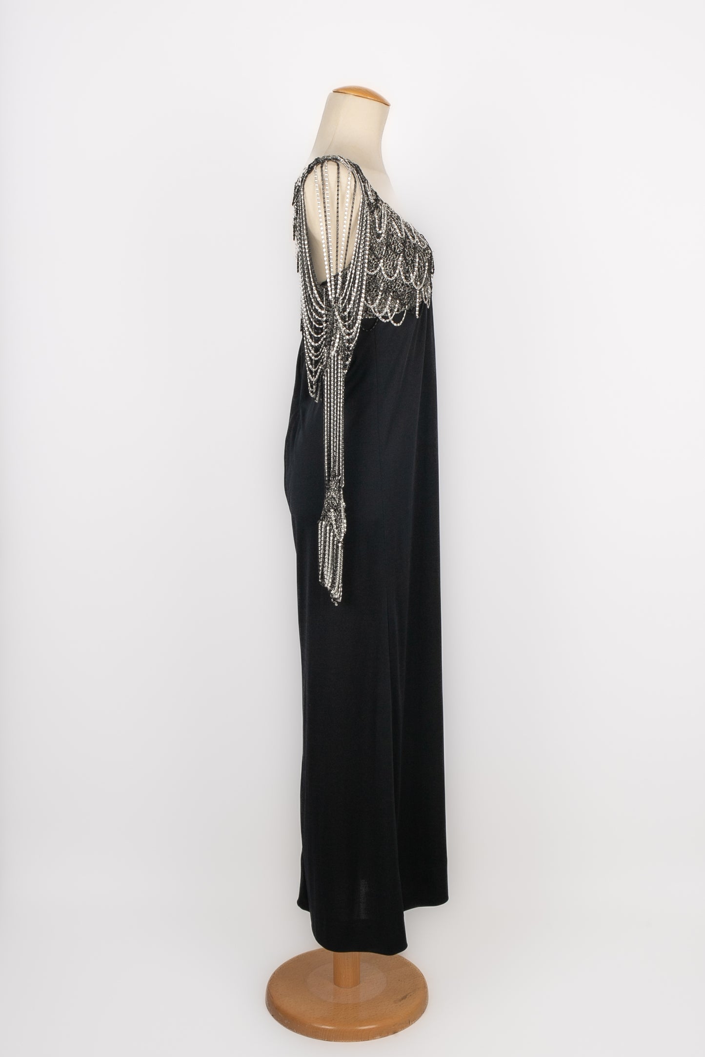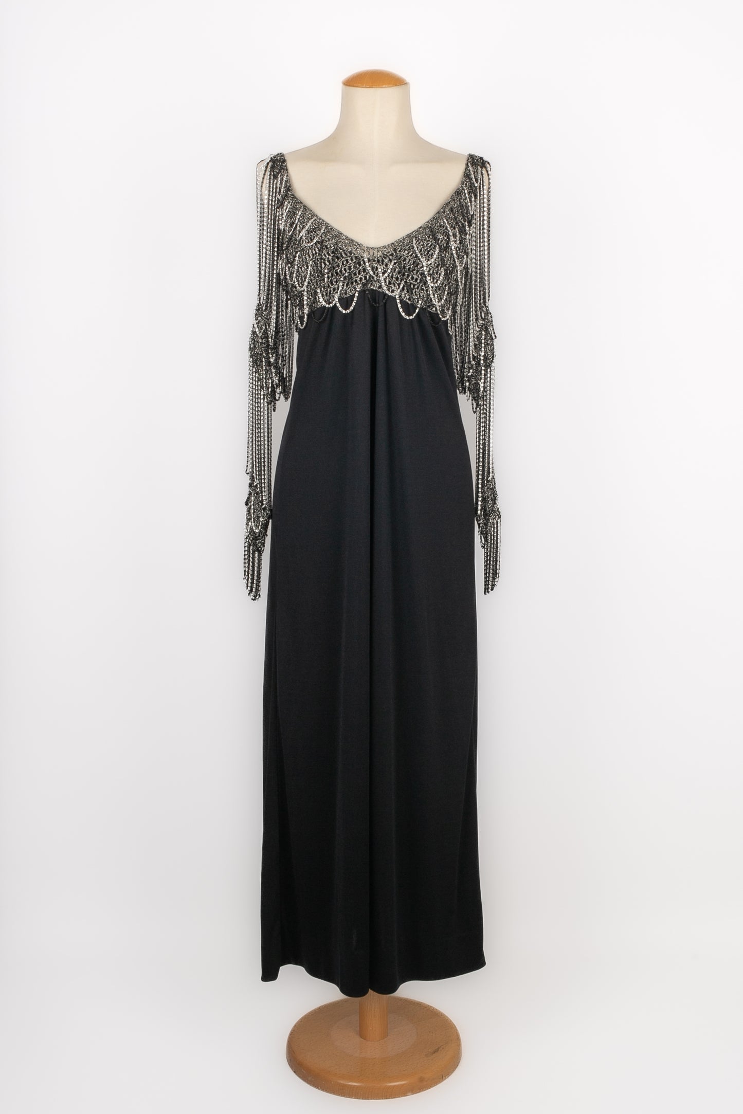 AZZARO -(Made in France) Longue robe en jersey noir, lurex et chaine noire et blanche. Etiquettes de composition et de taille absentes, elle convient à un 36FR.