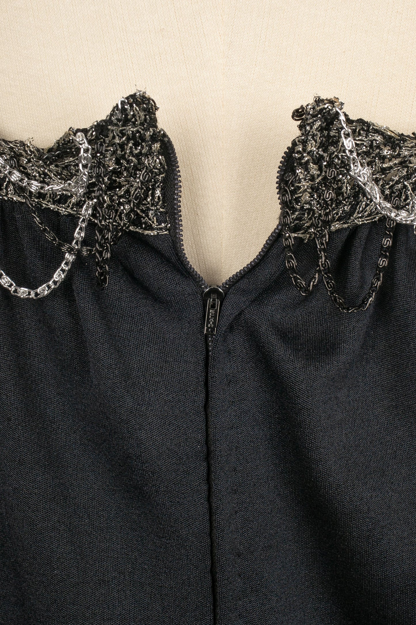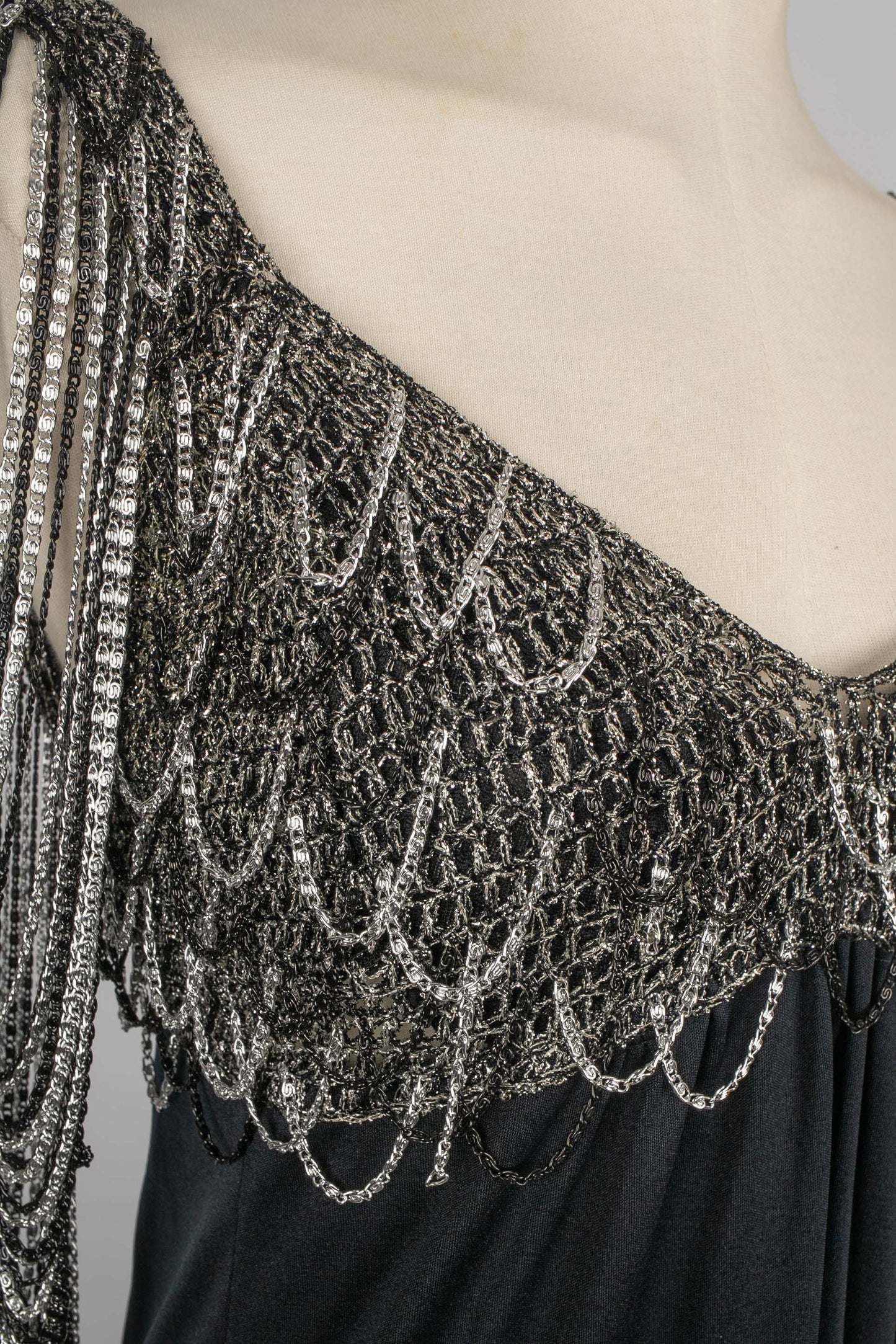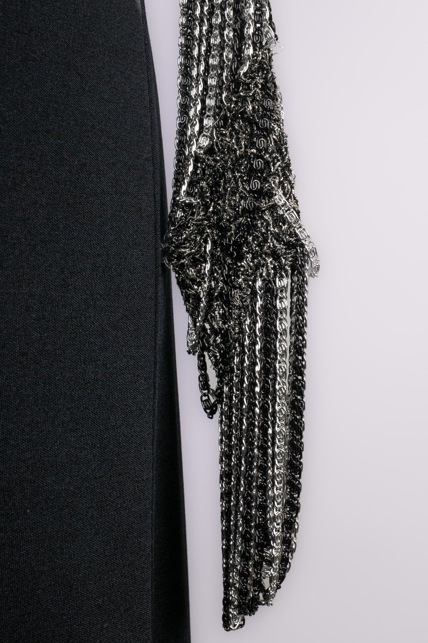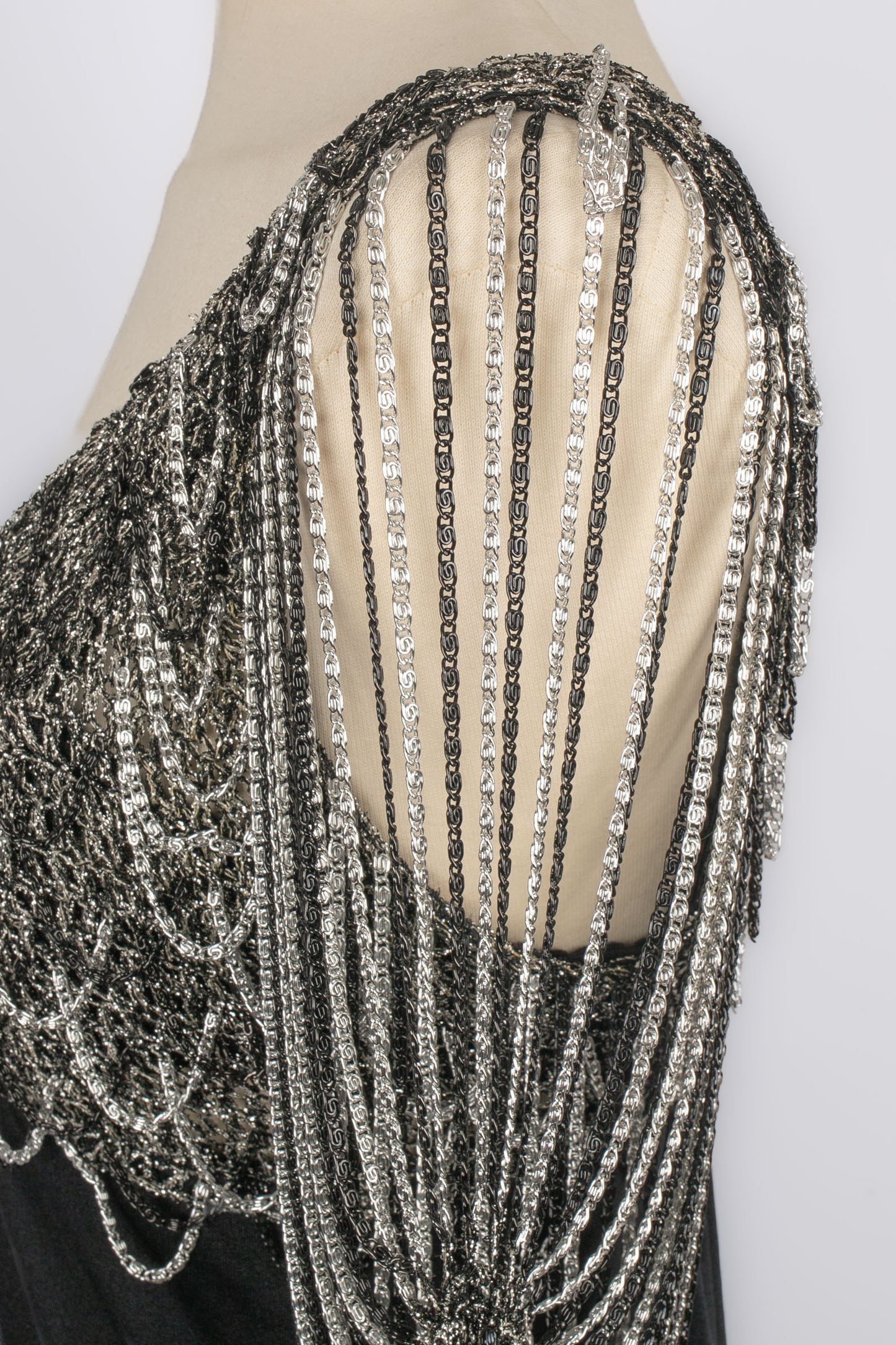 AZZARO -(Made in France) Longue robe en jersey noir, lurex et chaine noire et blanche. Etiquettes de composition et de taille absentes, elle convient à un 36FR.