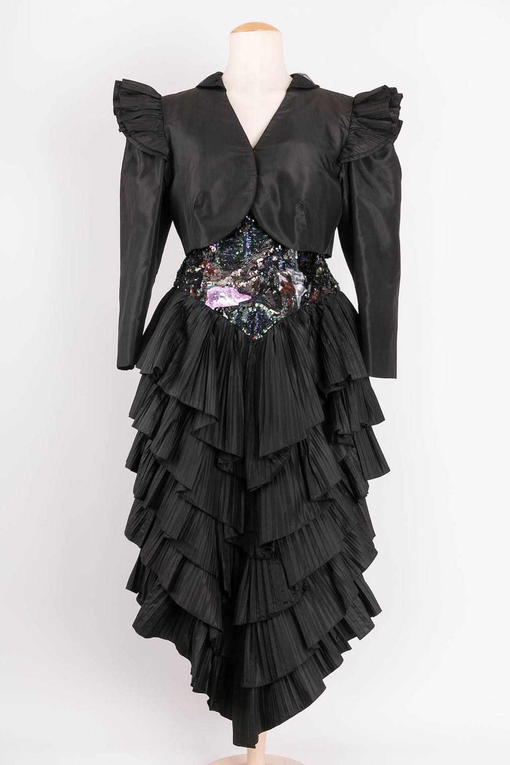 LORIS AZZARO (Made In France) Ensemble en taffetas et paillettes comprenant un boléro et une robe bustier asymétrique. Aucune étiquette de taille ou de composition, cet ensemble convient à une taille 40FR/42FR.
