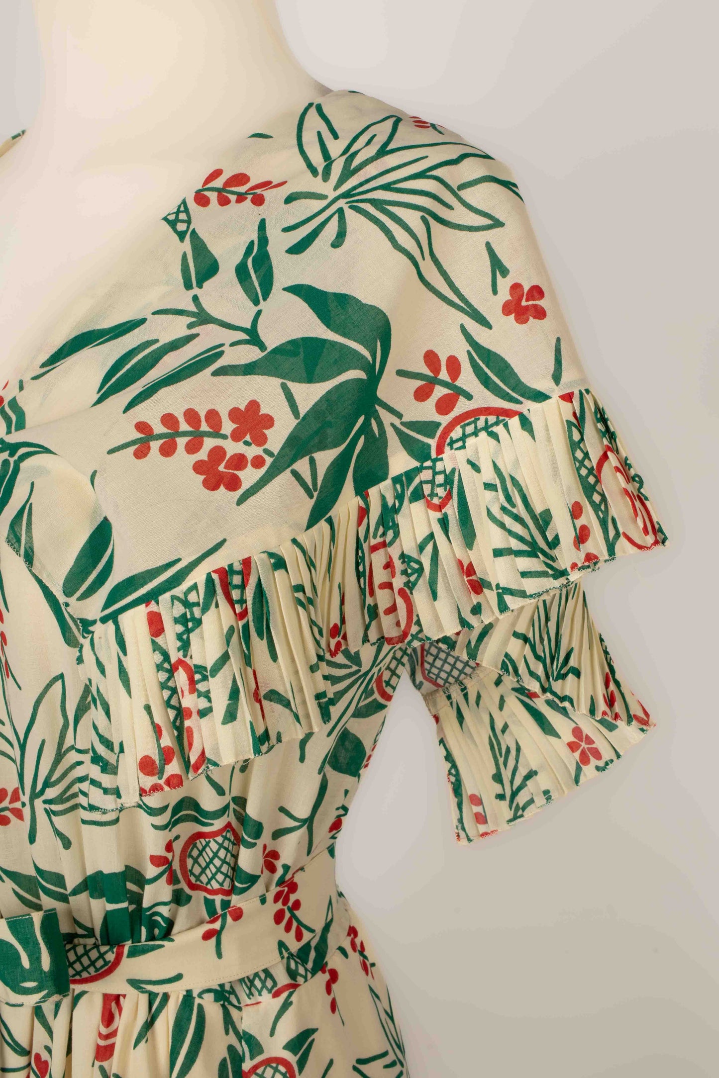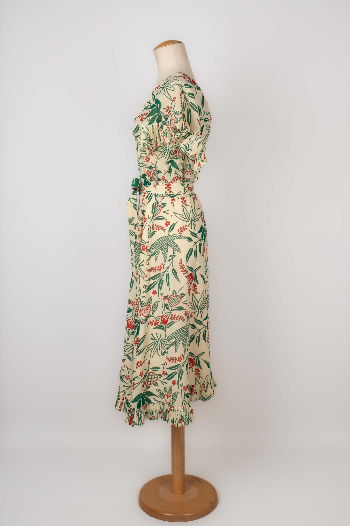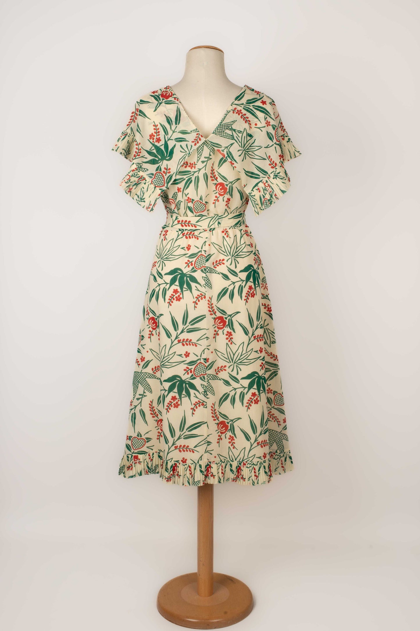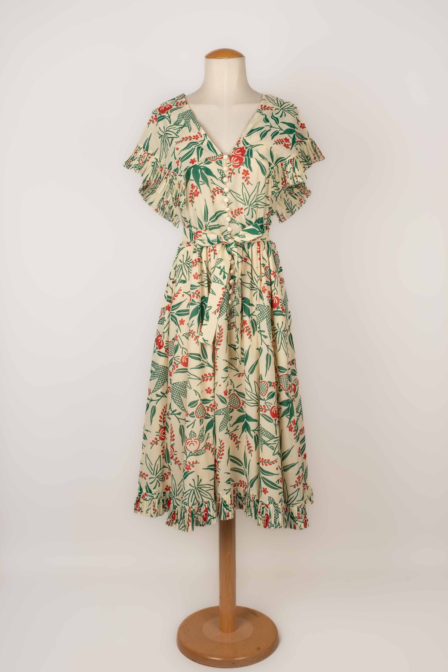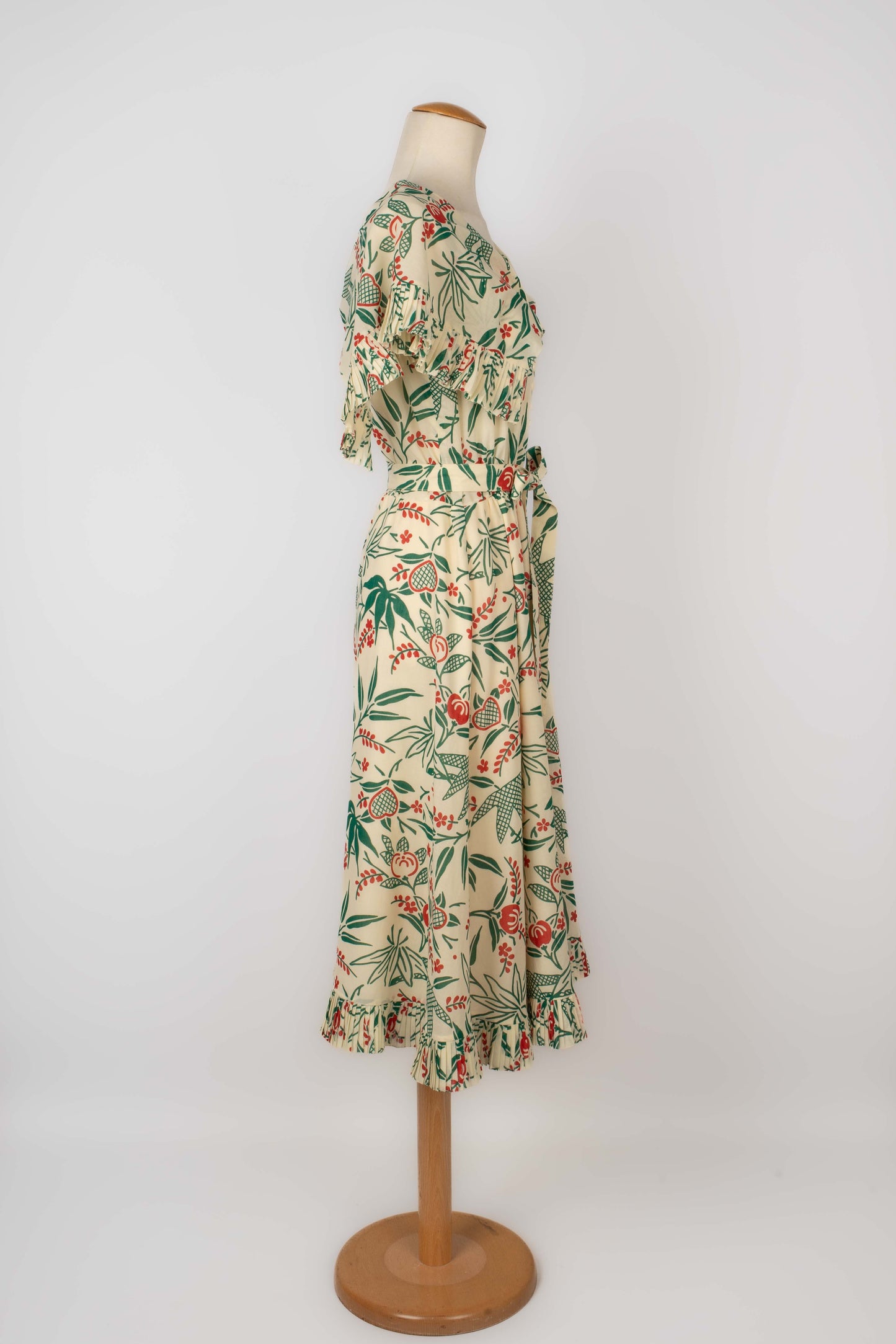 CHLOÉ -(Made in France) Robe en voile de coton crème à décor végétal rouge et vert, volant plissé au bas de la robe et aux manches. Elle est accompagnée de sa ceinture. Pas de taille indiquée, elle convient à un 38FR.