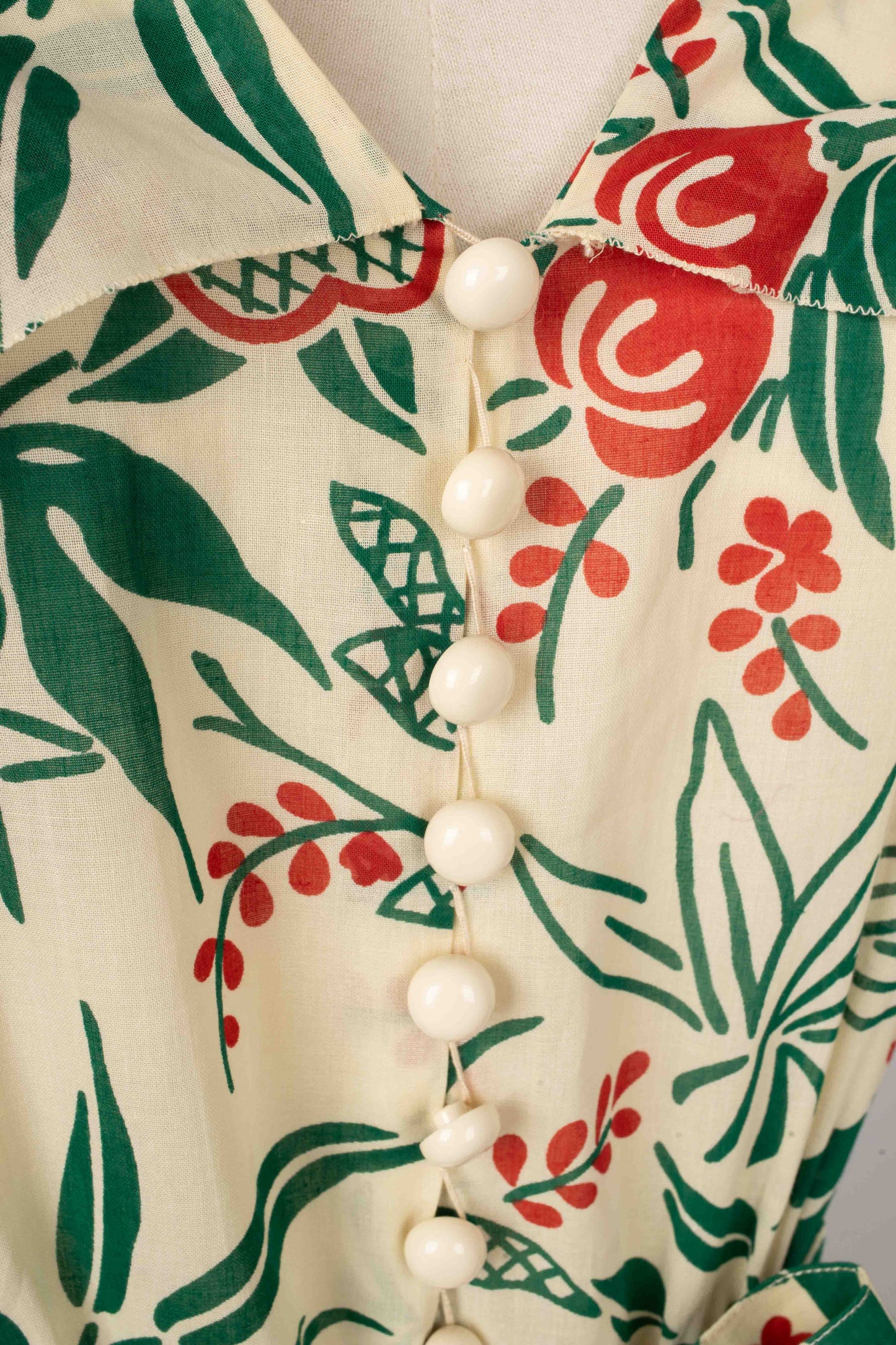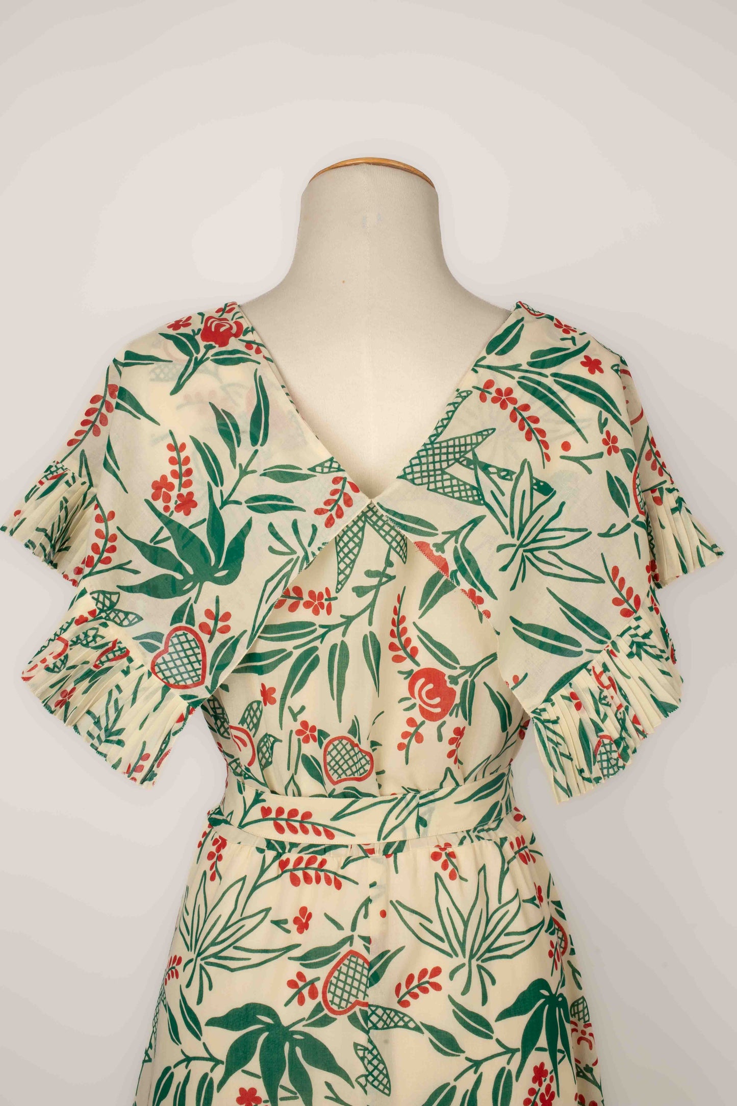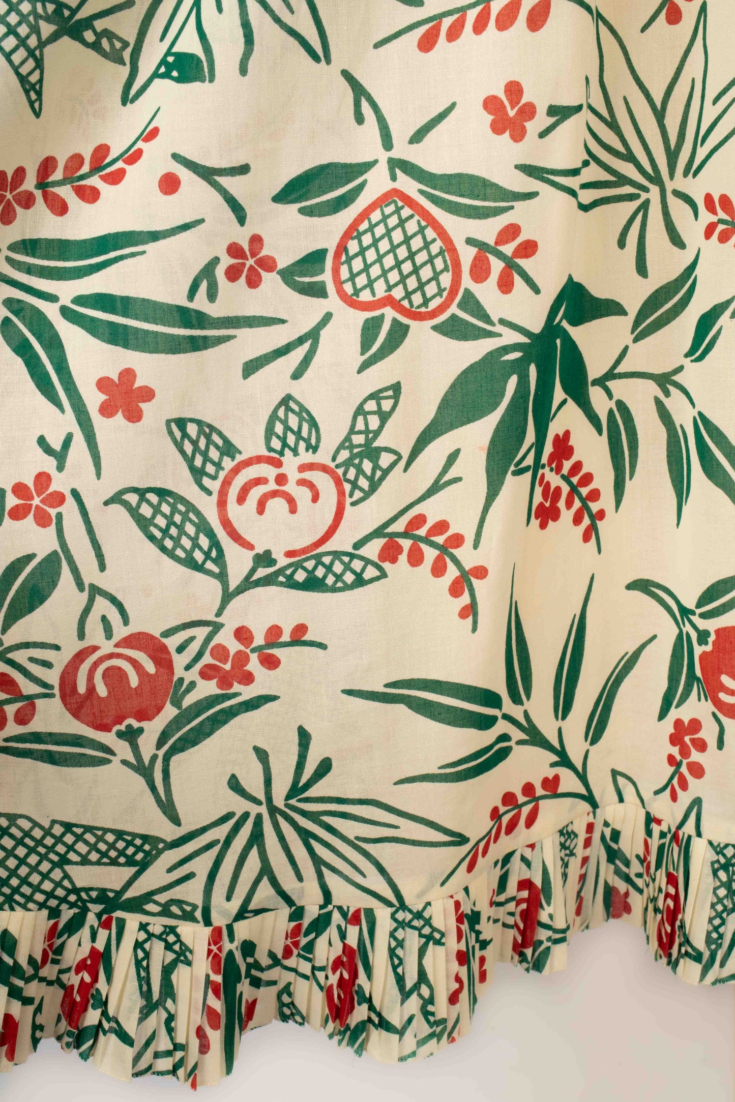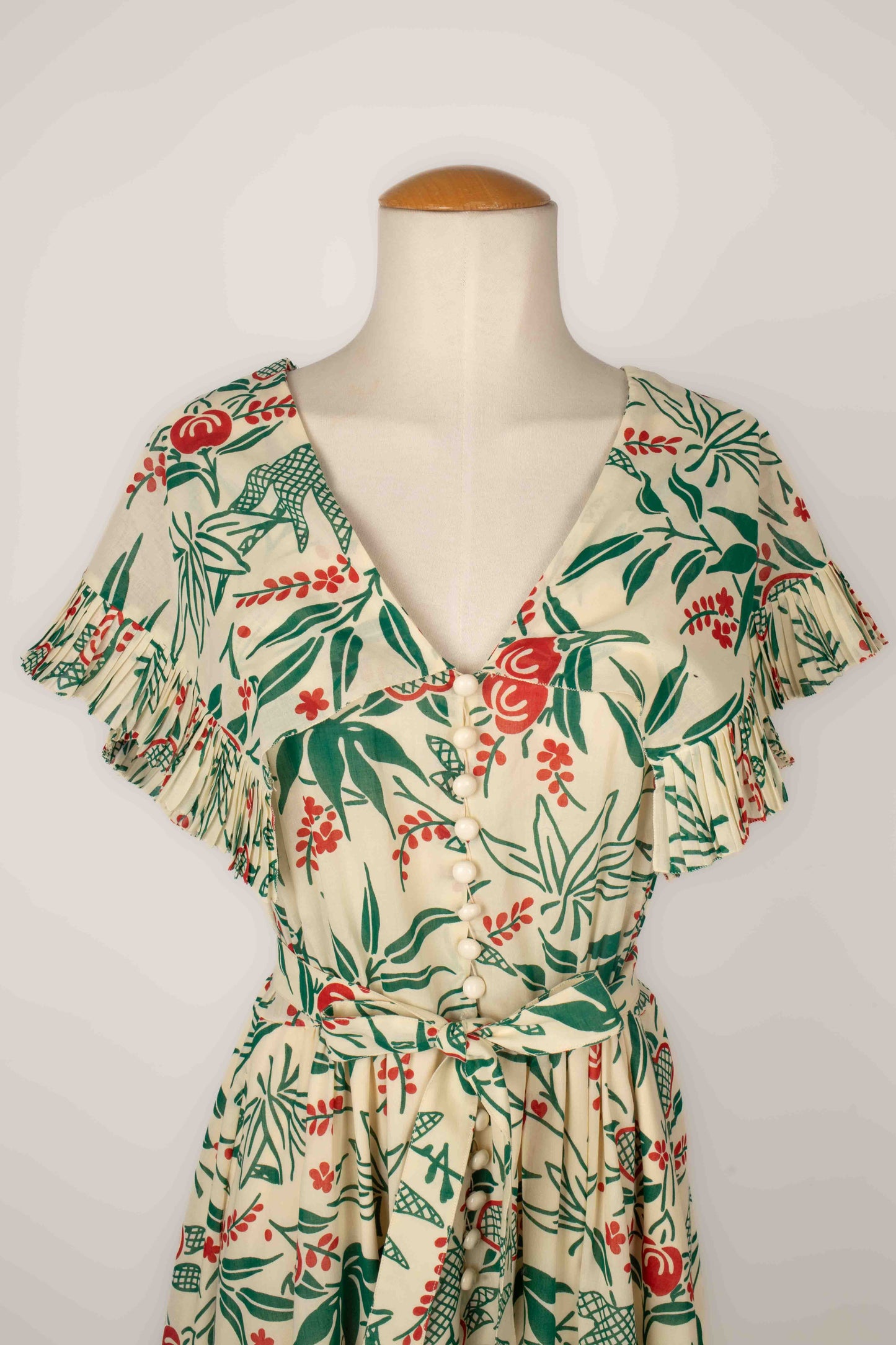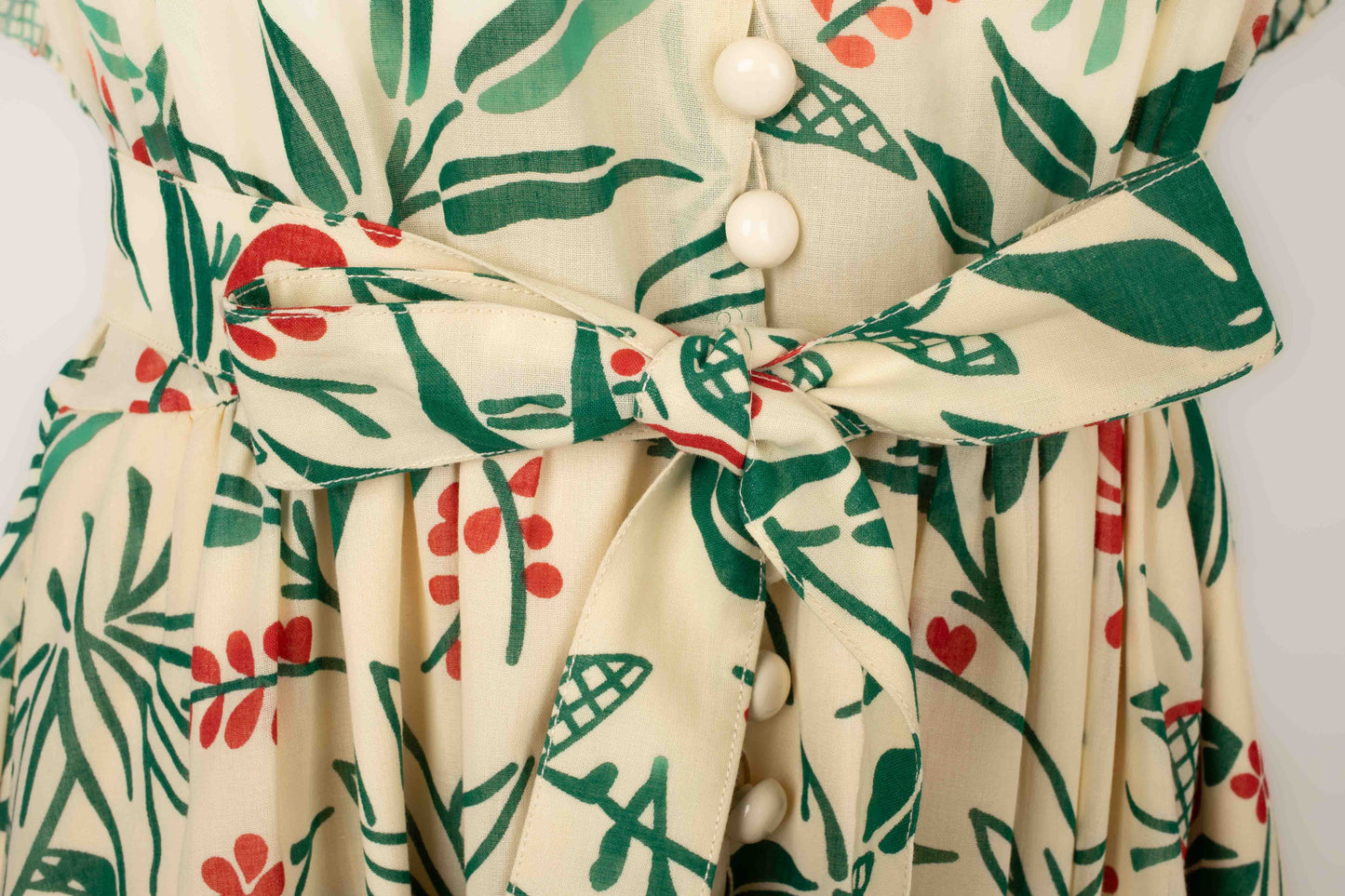 CHLOÉ -(Made in France) Robe en voile de coton crème à décor végétal rouge et vert, volant plissé au bas de la robe et aux manches. Elle est accompagnée de sa ceinture. Pas de taille indiquée, elle convient à un 38FR.