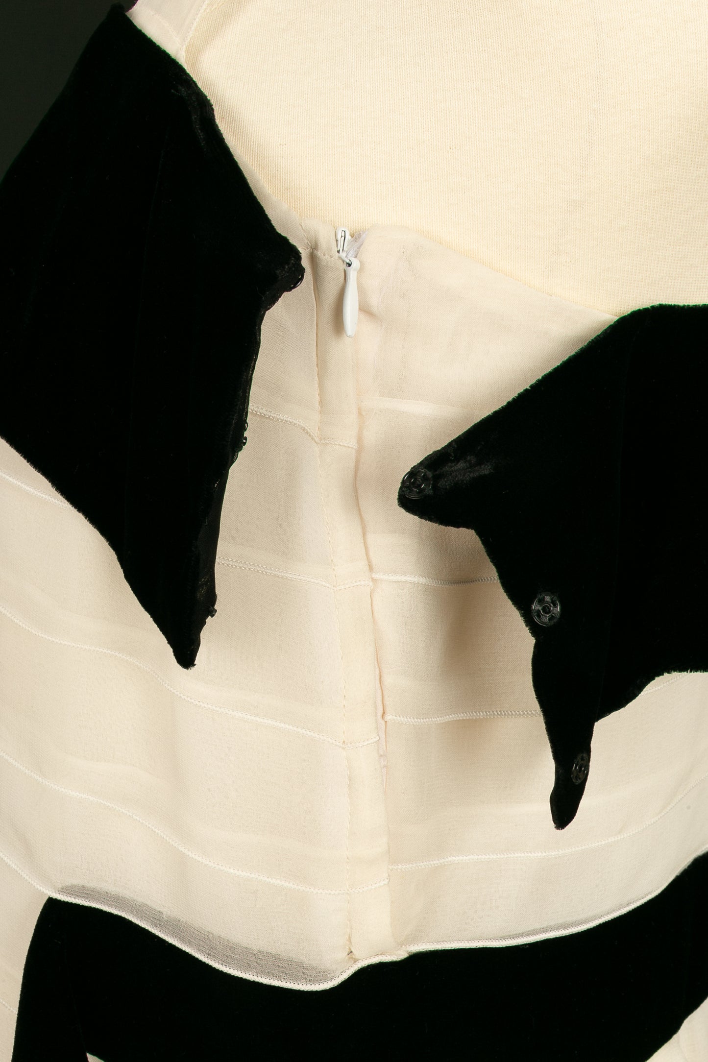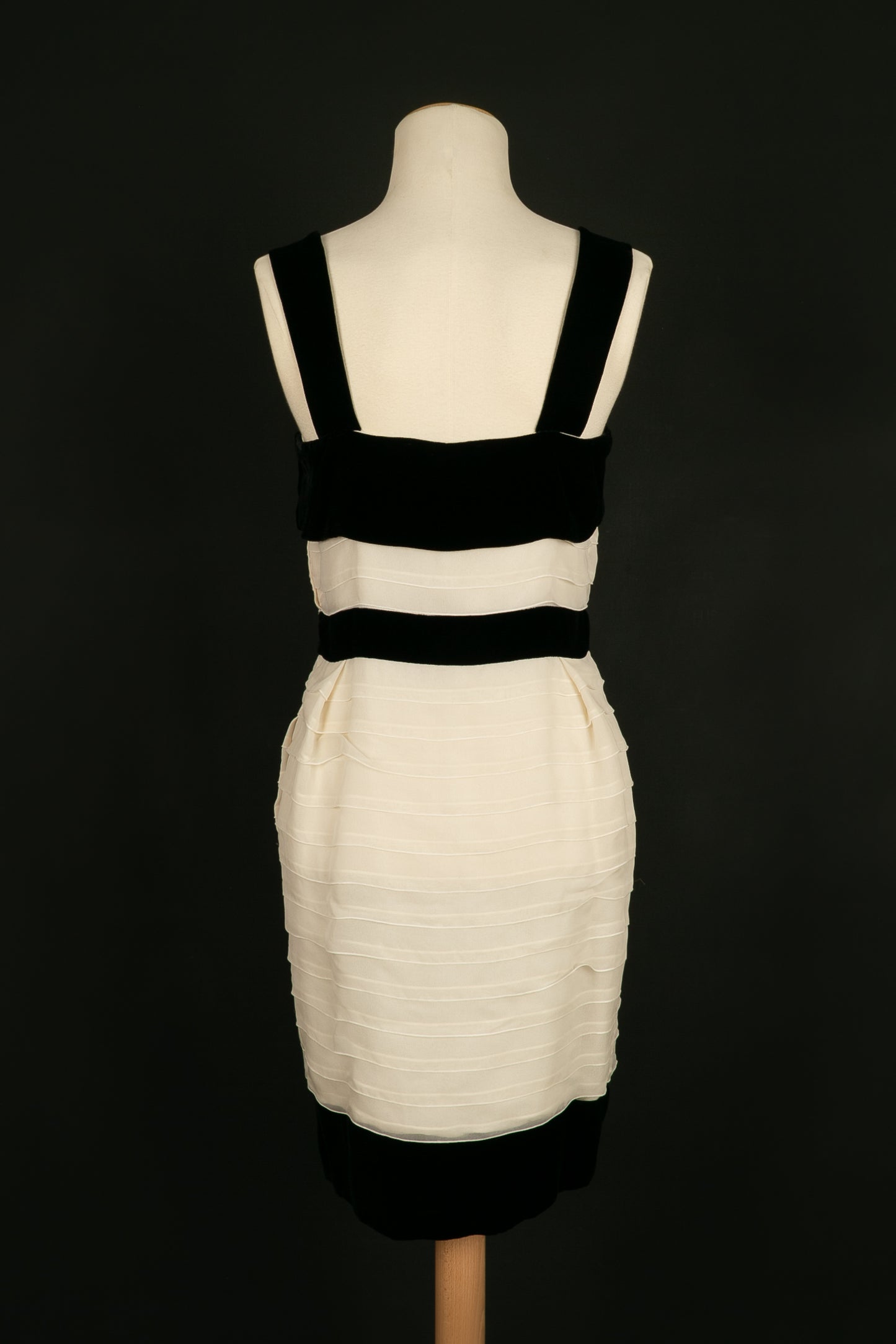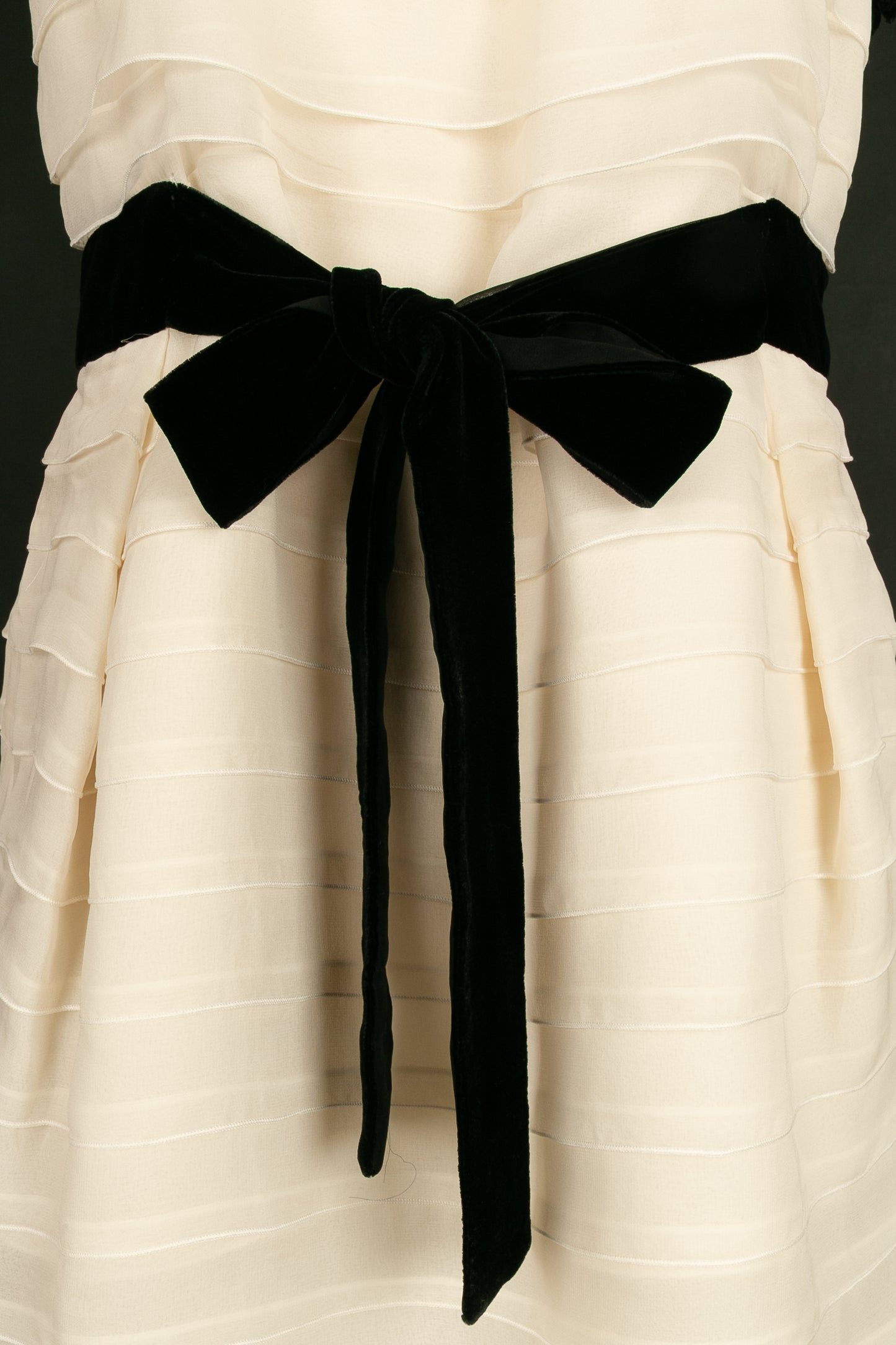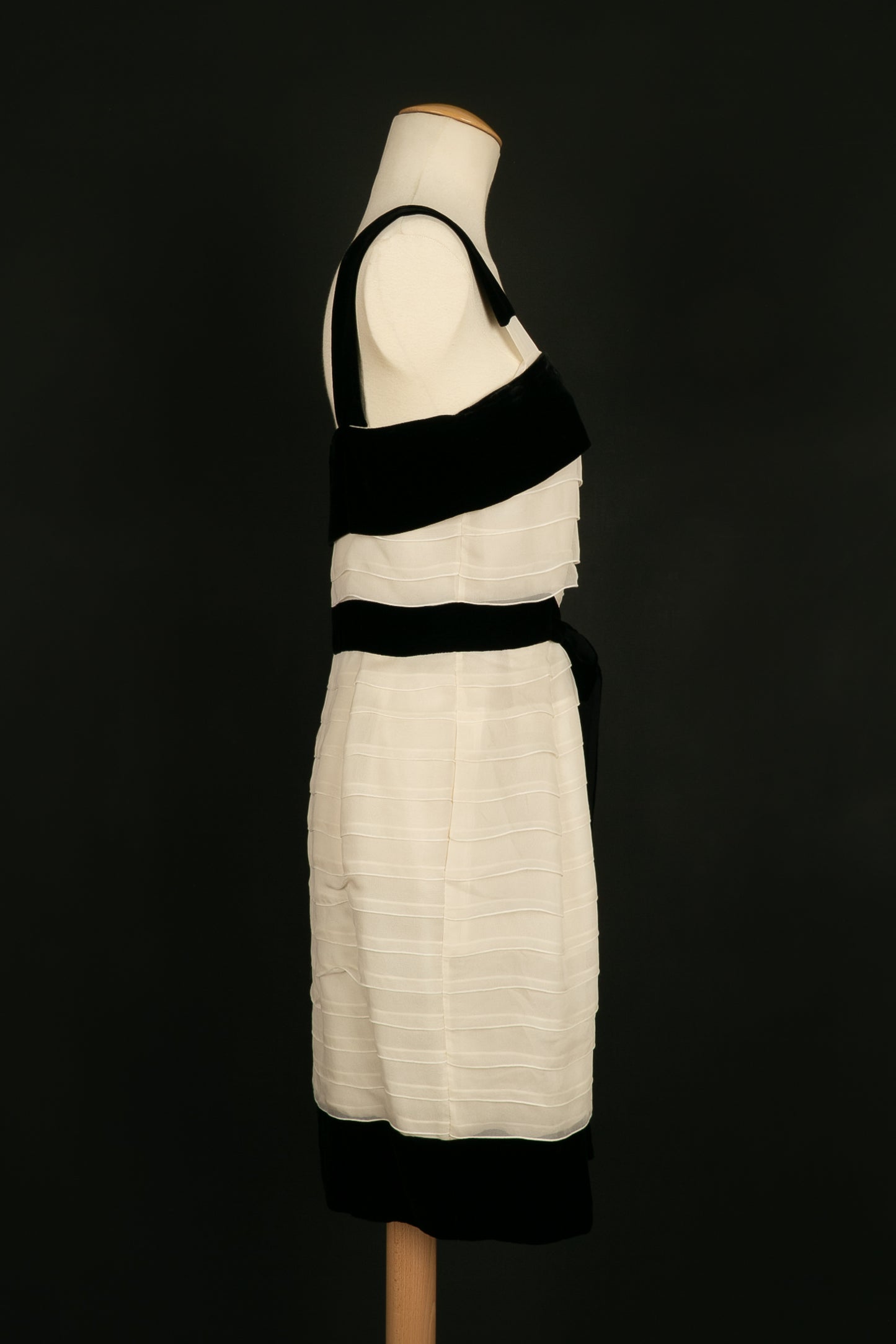 YVES SAINT LAURENT -(Made in France) Robe en mousseline de soie et velours noir. Aucune étiquette de taille, elle convient à un 36FR. A signaler, rares tâches et fils tirés dans la doublure.