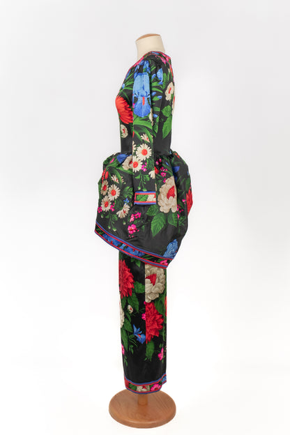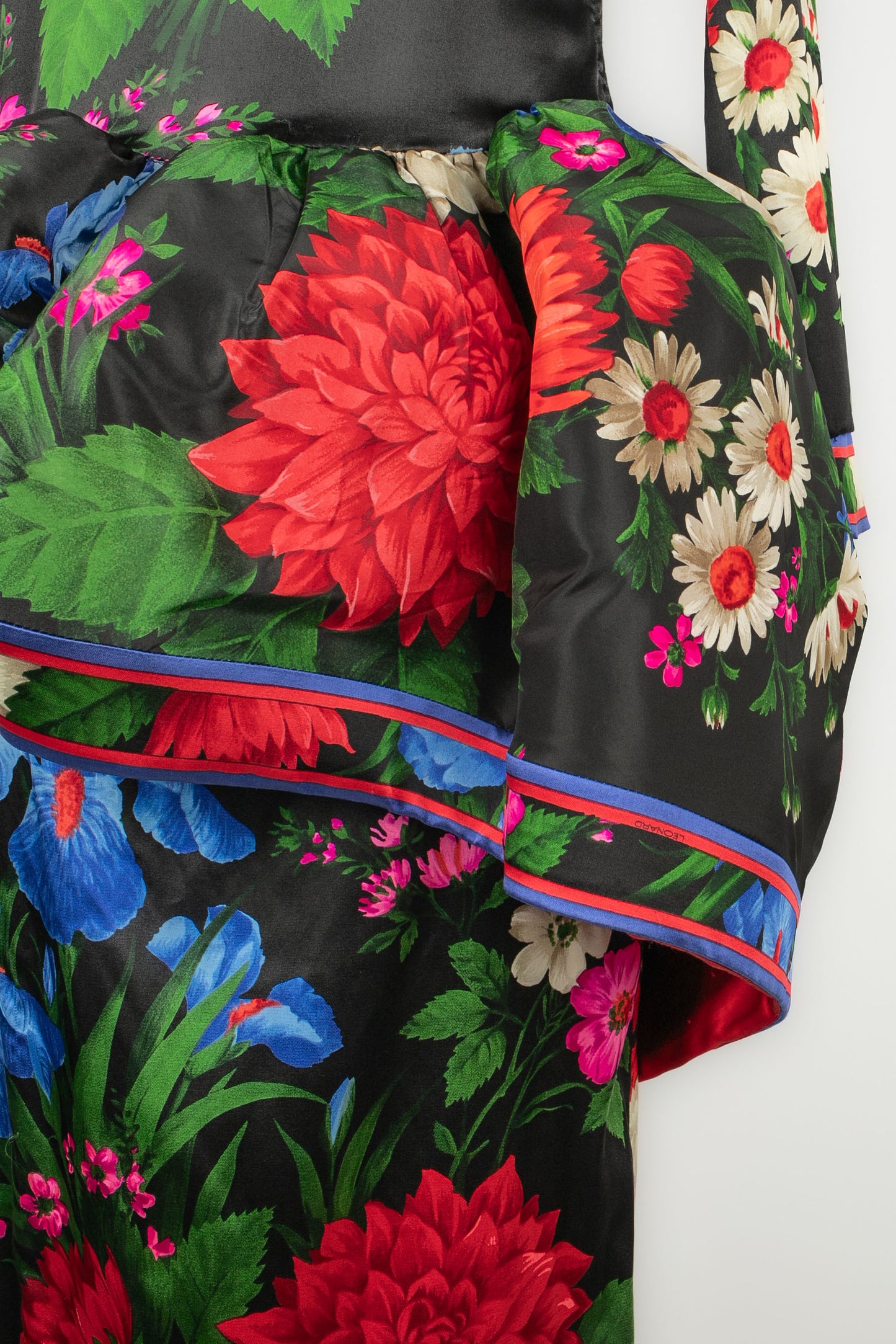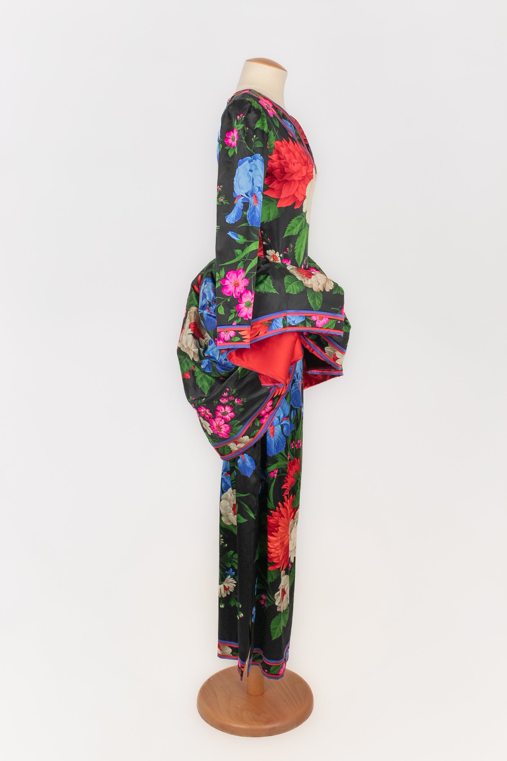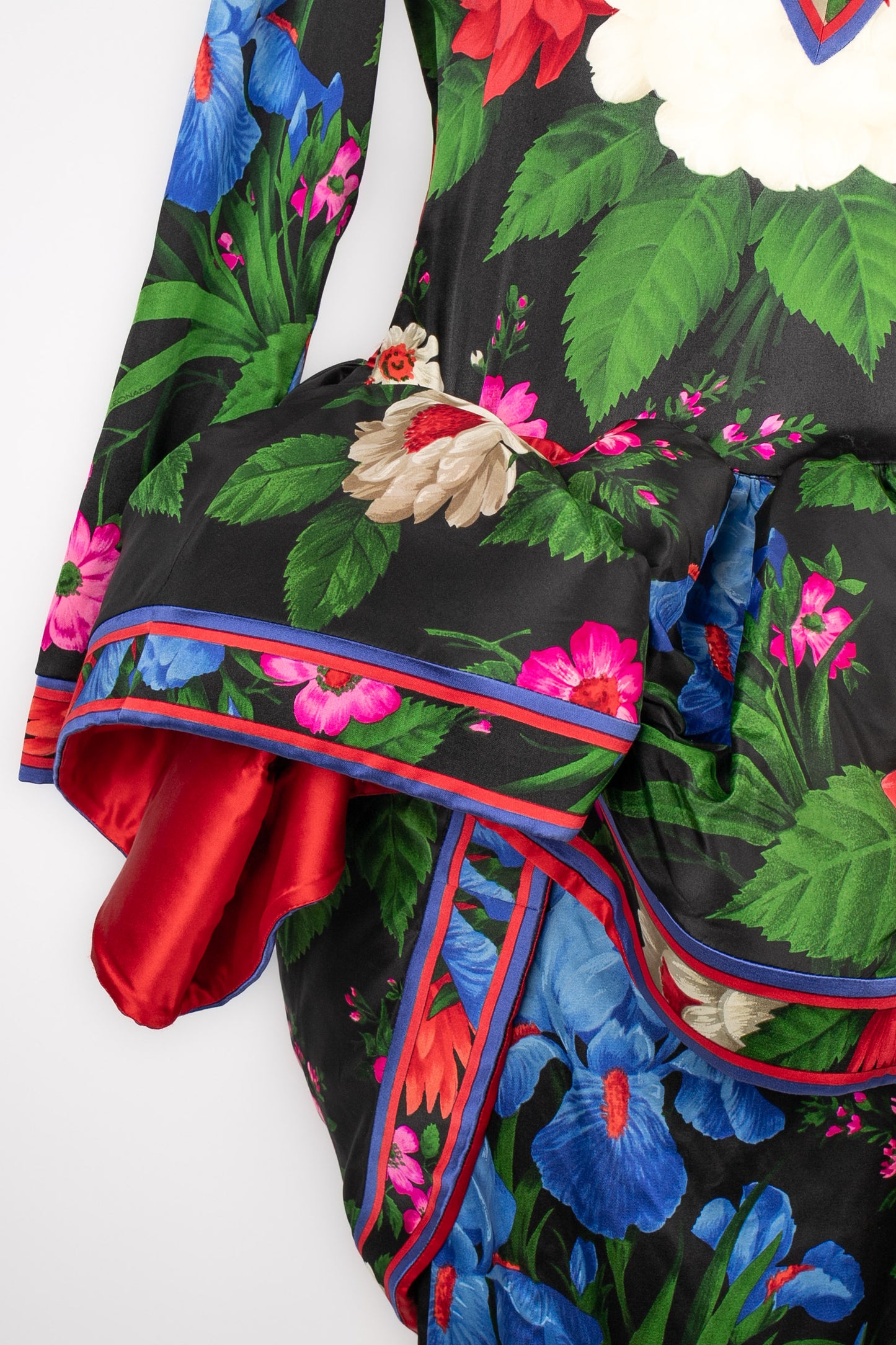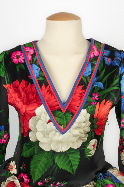 LEONARD -(Made in France) Robe en soie mélangée à volants architecturés et motif floral dans les tons de noir, de rouge et de bleu. Pas de taille indiquée, elle convient à un 36FR/38FR. Collection Automne-Hiver 1992.