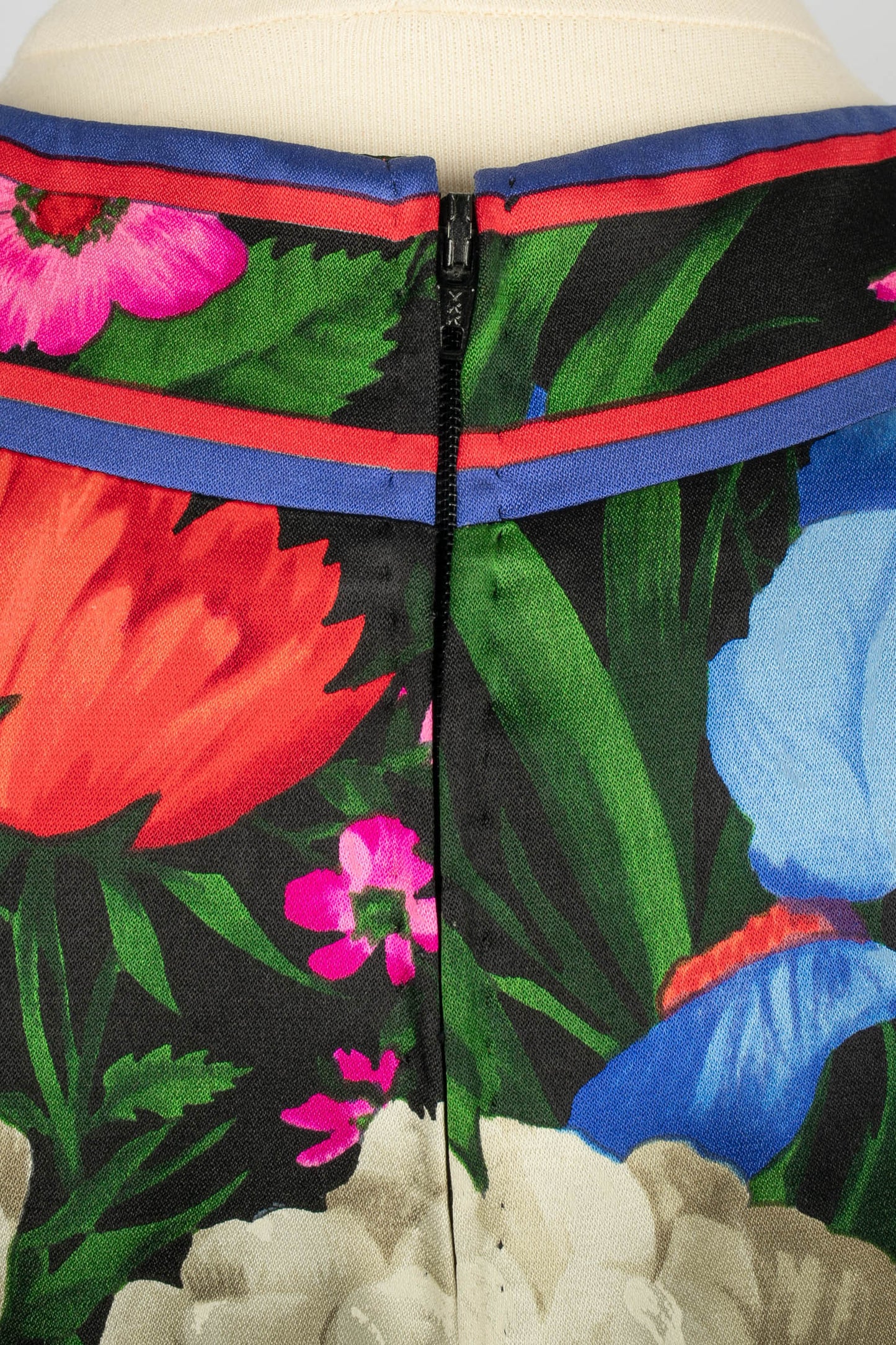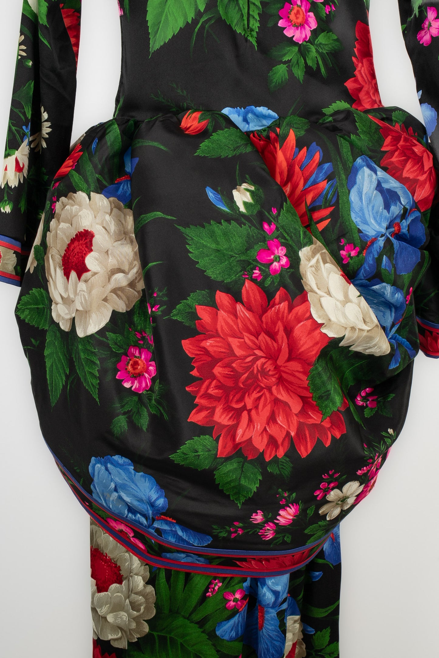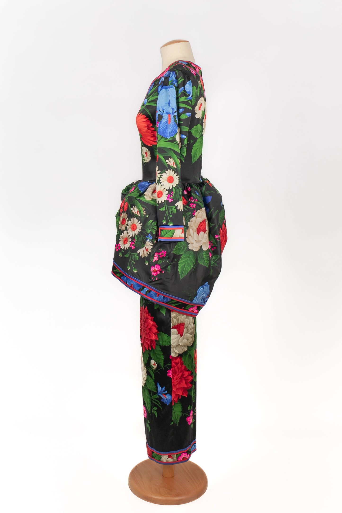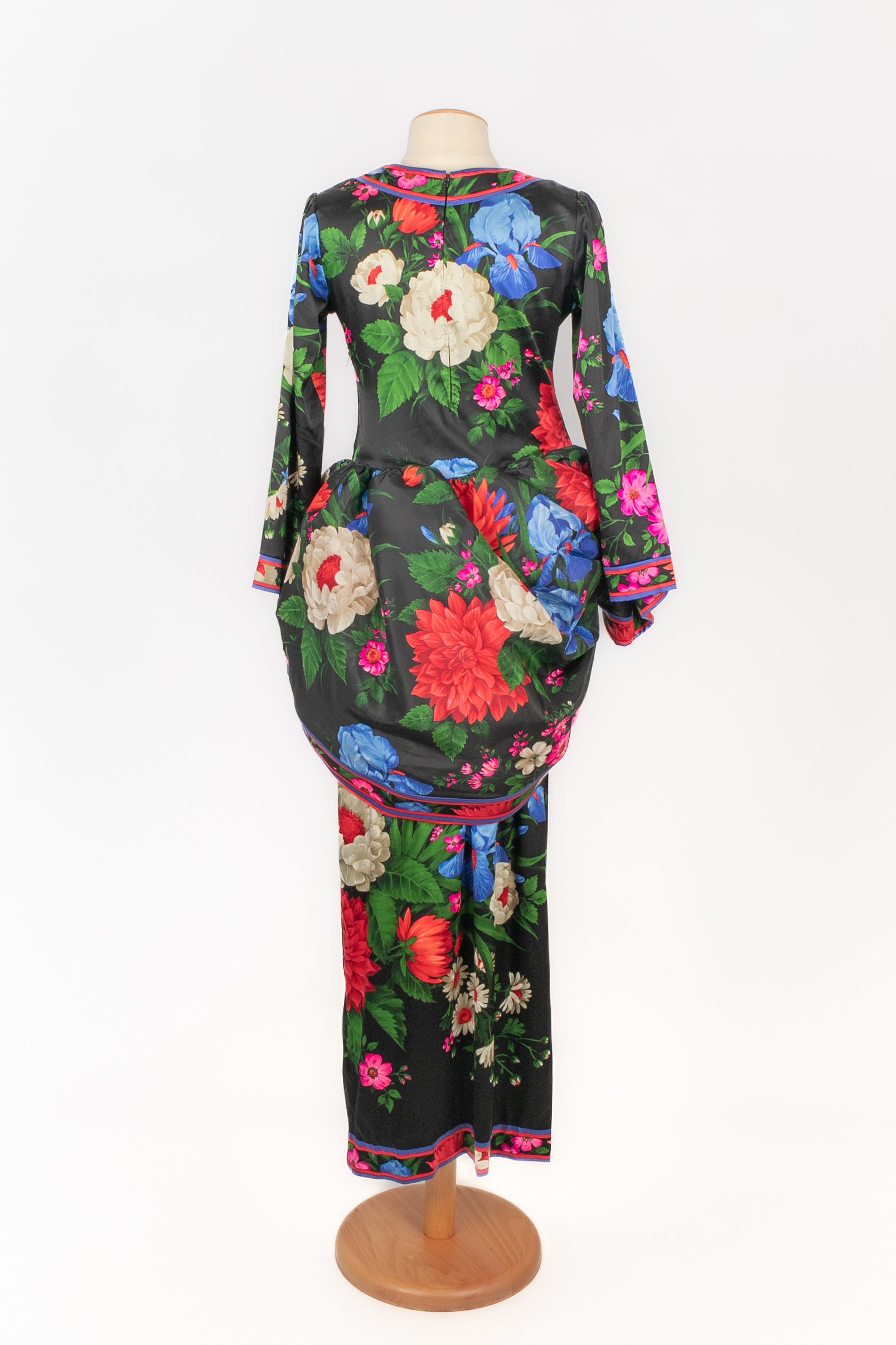 LEONARD -(Made in France) Robe en soie mélangée à volants architecturés et motif floral dans les tons de noir, de rouge et de bleu. Pas de taille indiquée, elle convient à un 36FR/38FR. Collection Automne-Hiver 1992.