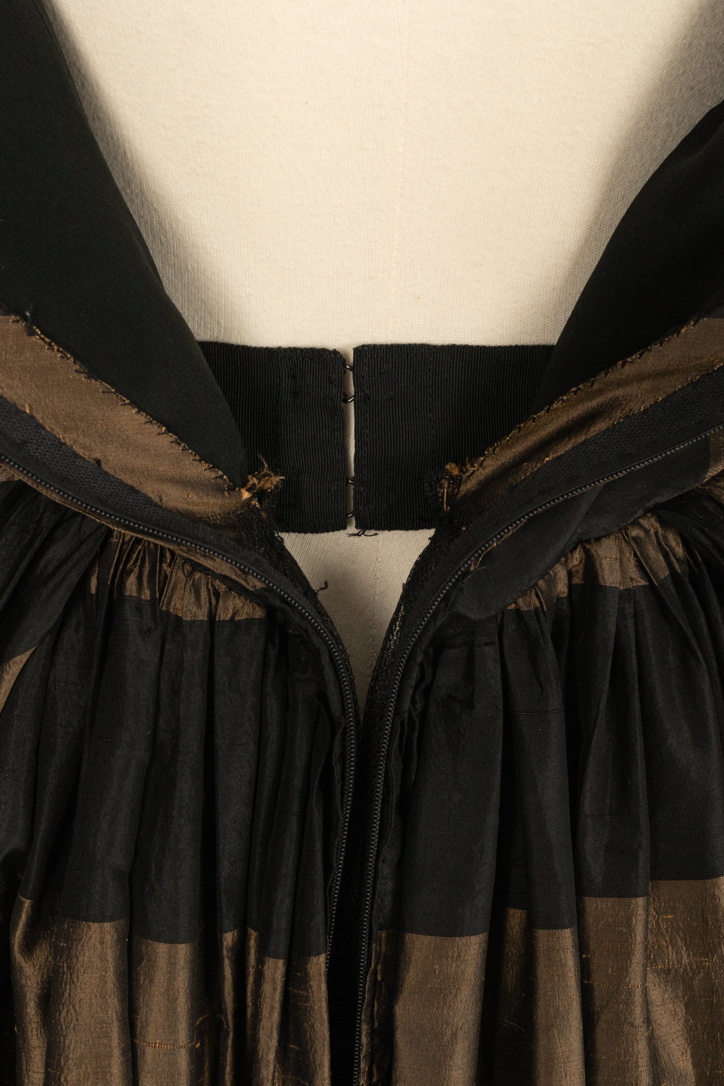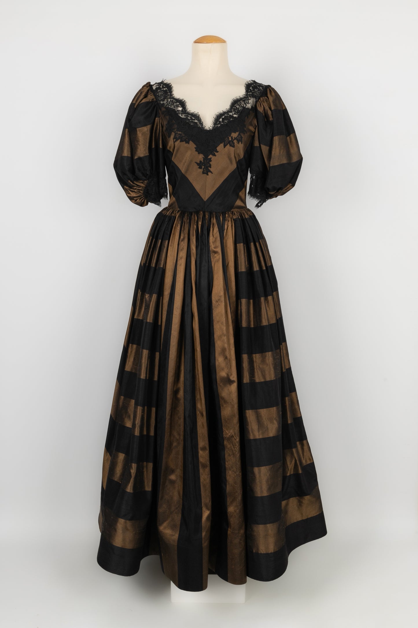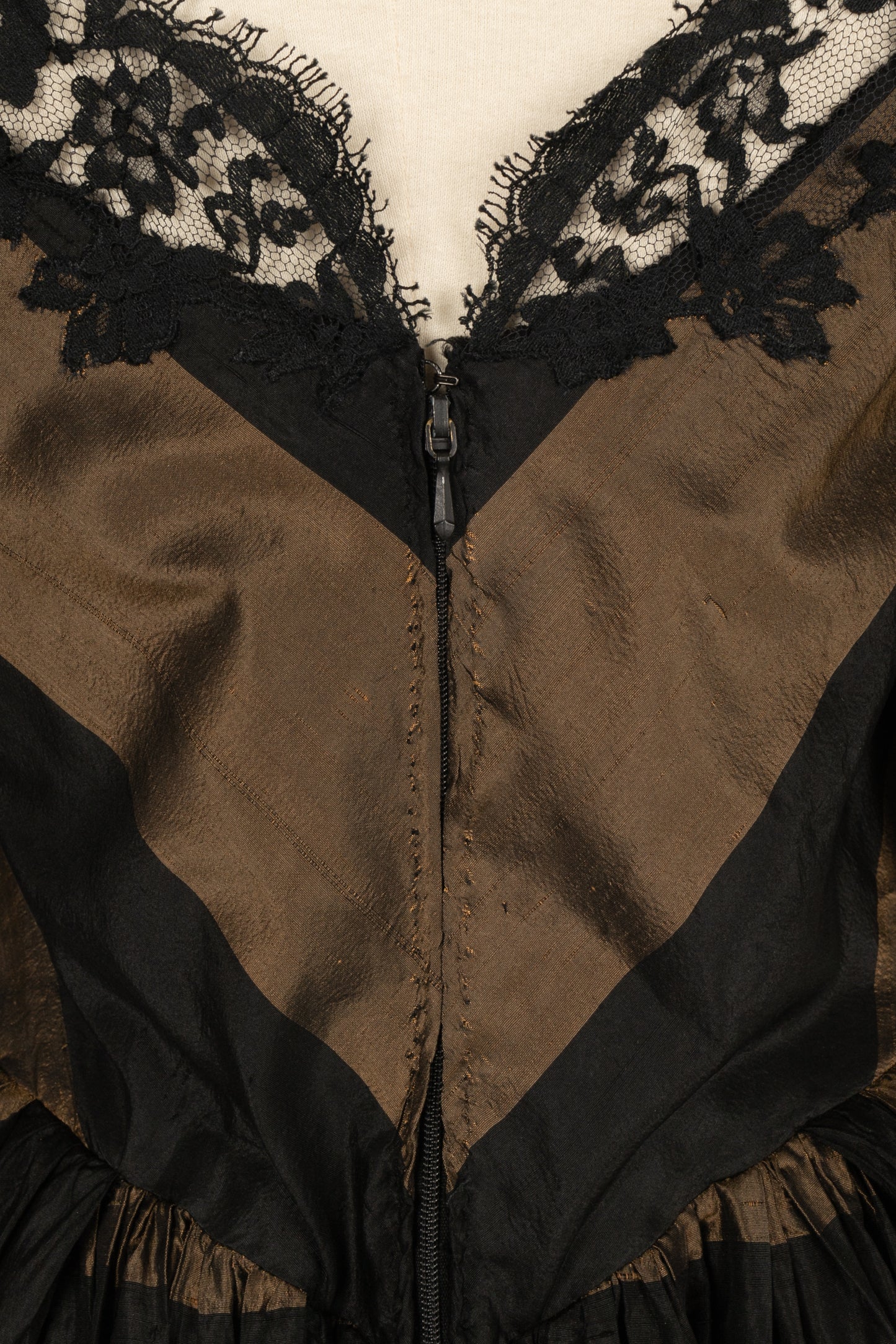 LOUIS FERAUD -(Made in France) Robe Haute Couture en taffetas de soie marron et noir cousue de dentelle. Aucune étiquette de taille ou de composition, elle convient à un 36FR/38FR.