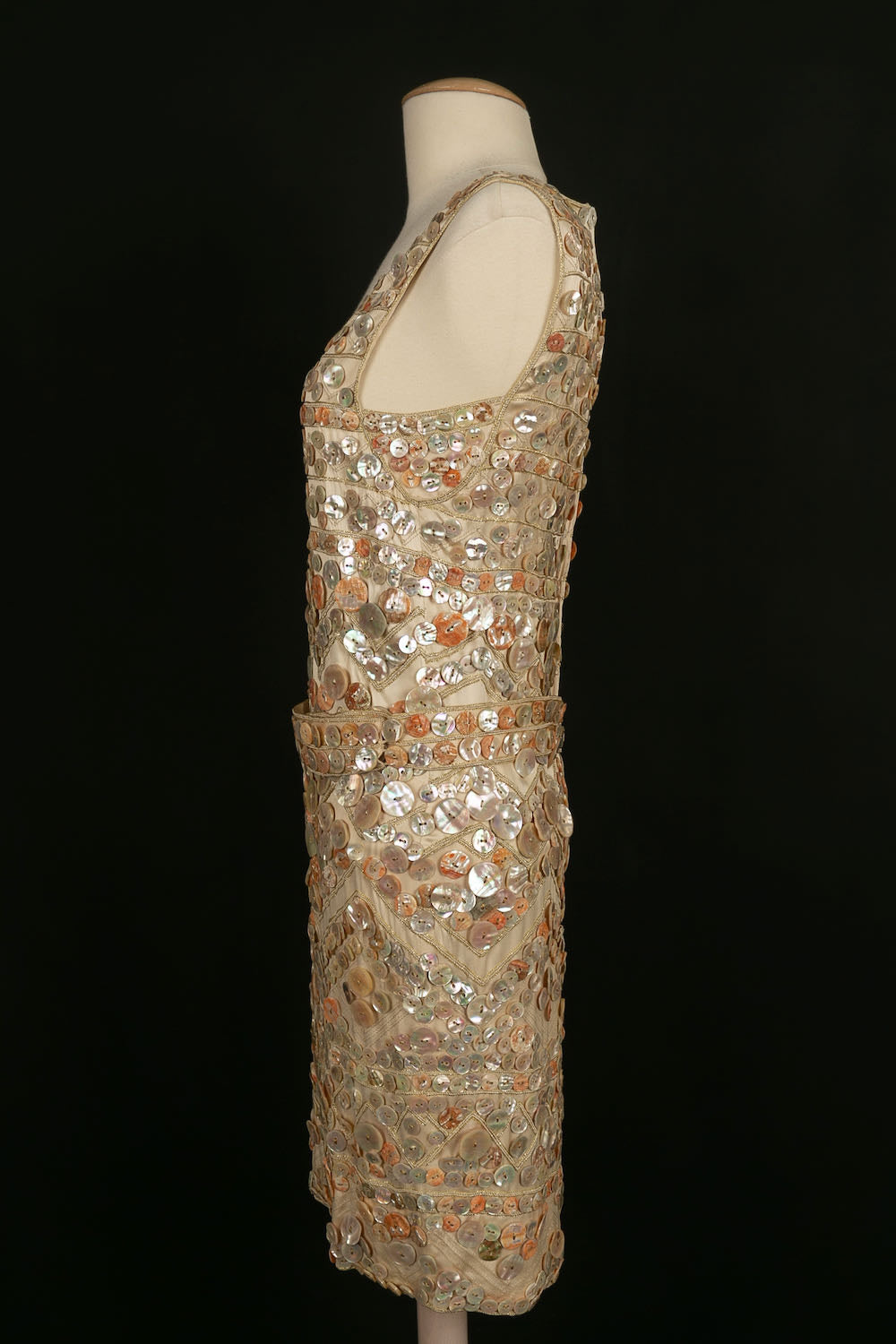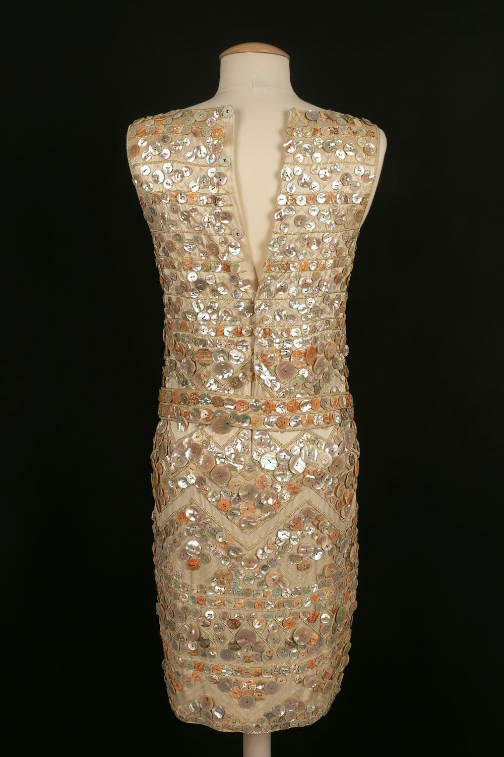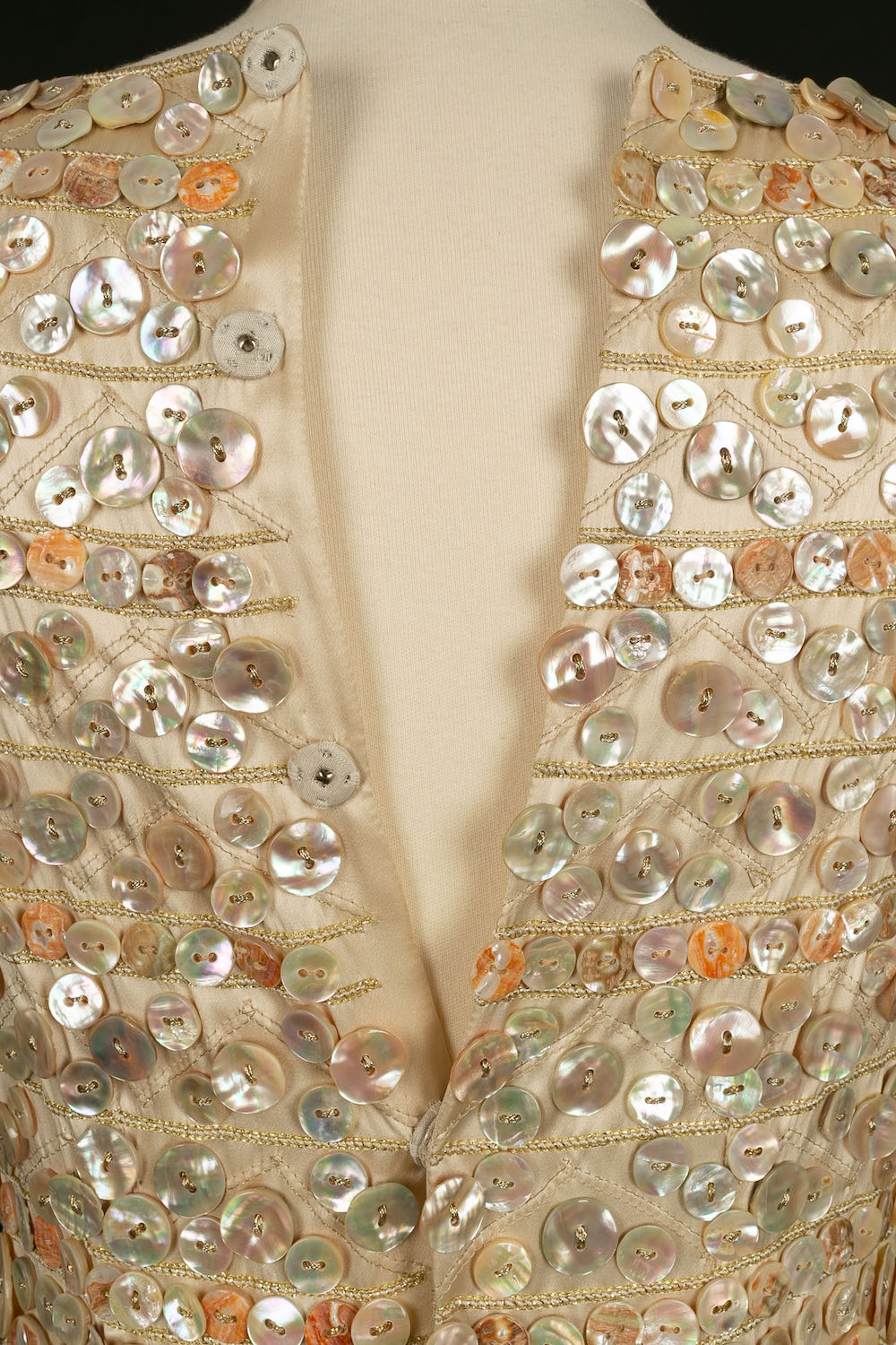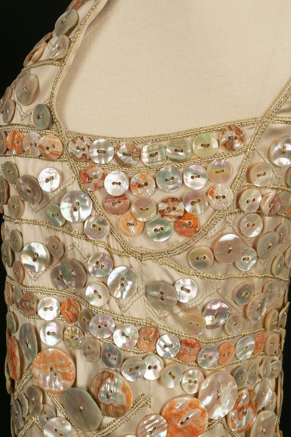 LOUIS FERAUD -Robe du soir en satin brodé de boutons de nacre. Pas de taille indiquée, elle correspond à un 34FR/36FR. Collection "Pretty Woman" Haute Couture Printemps-Été 1991.