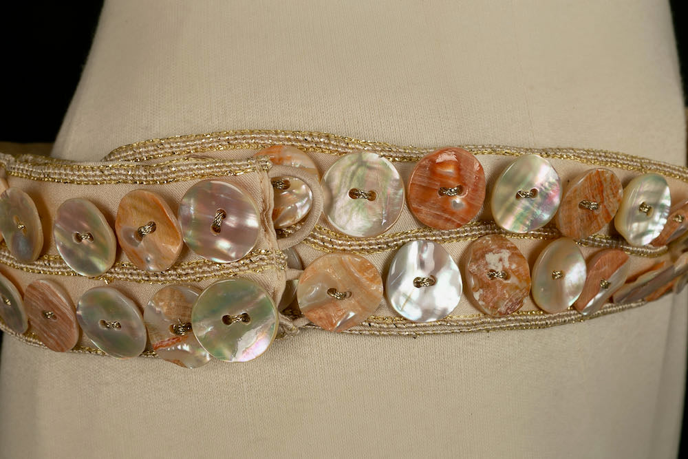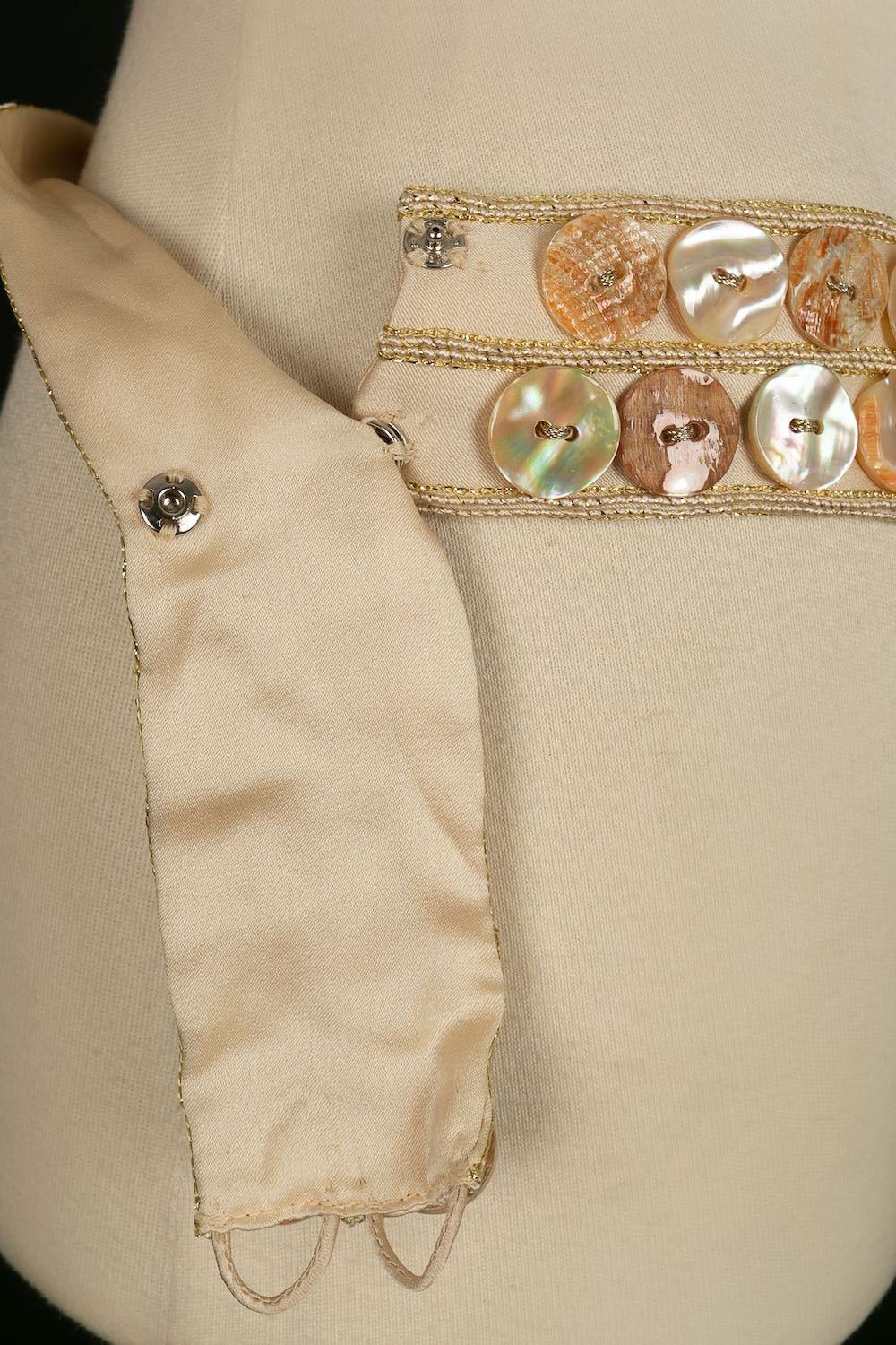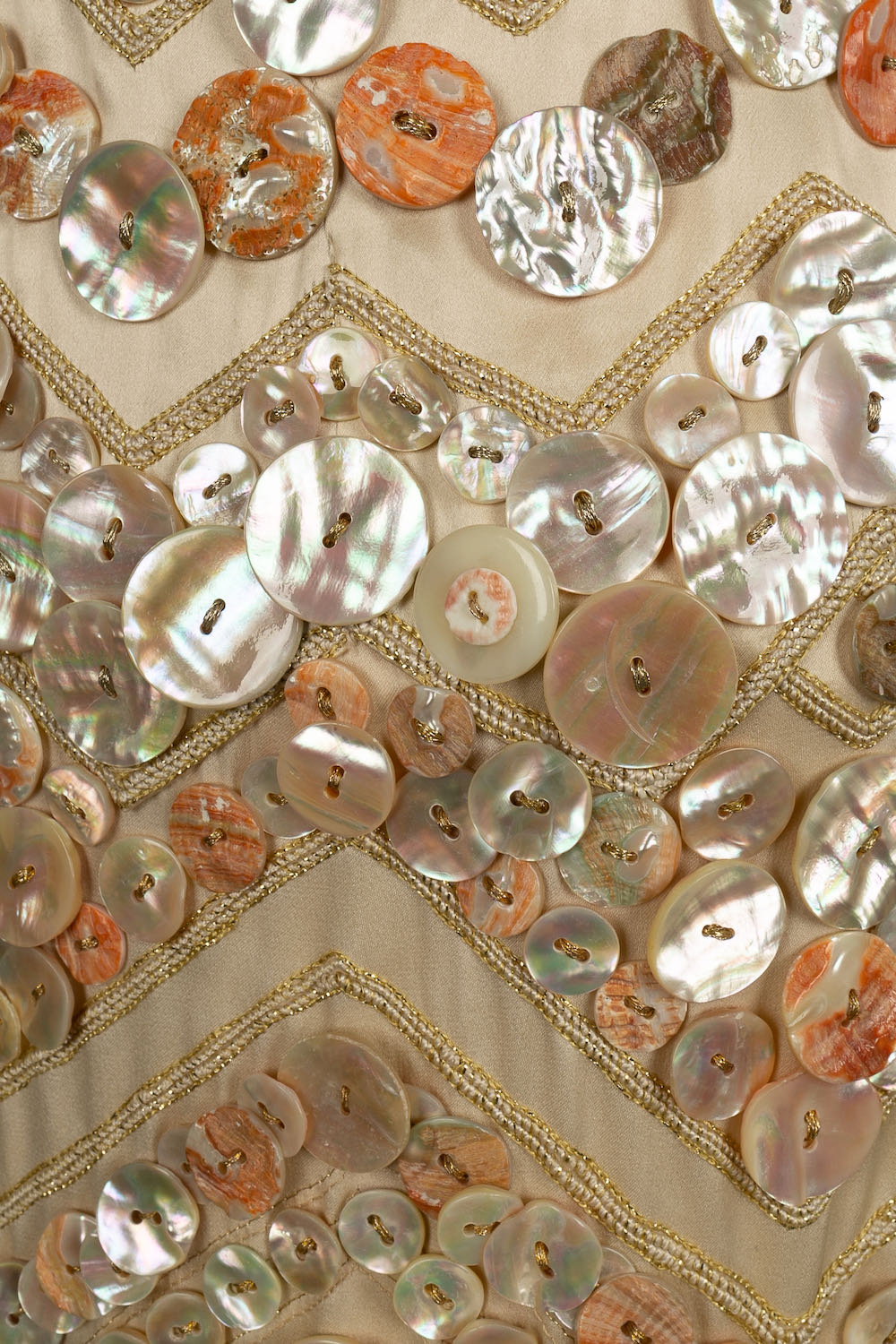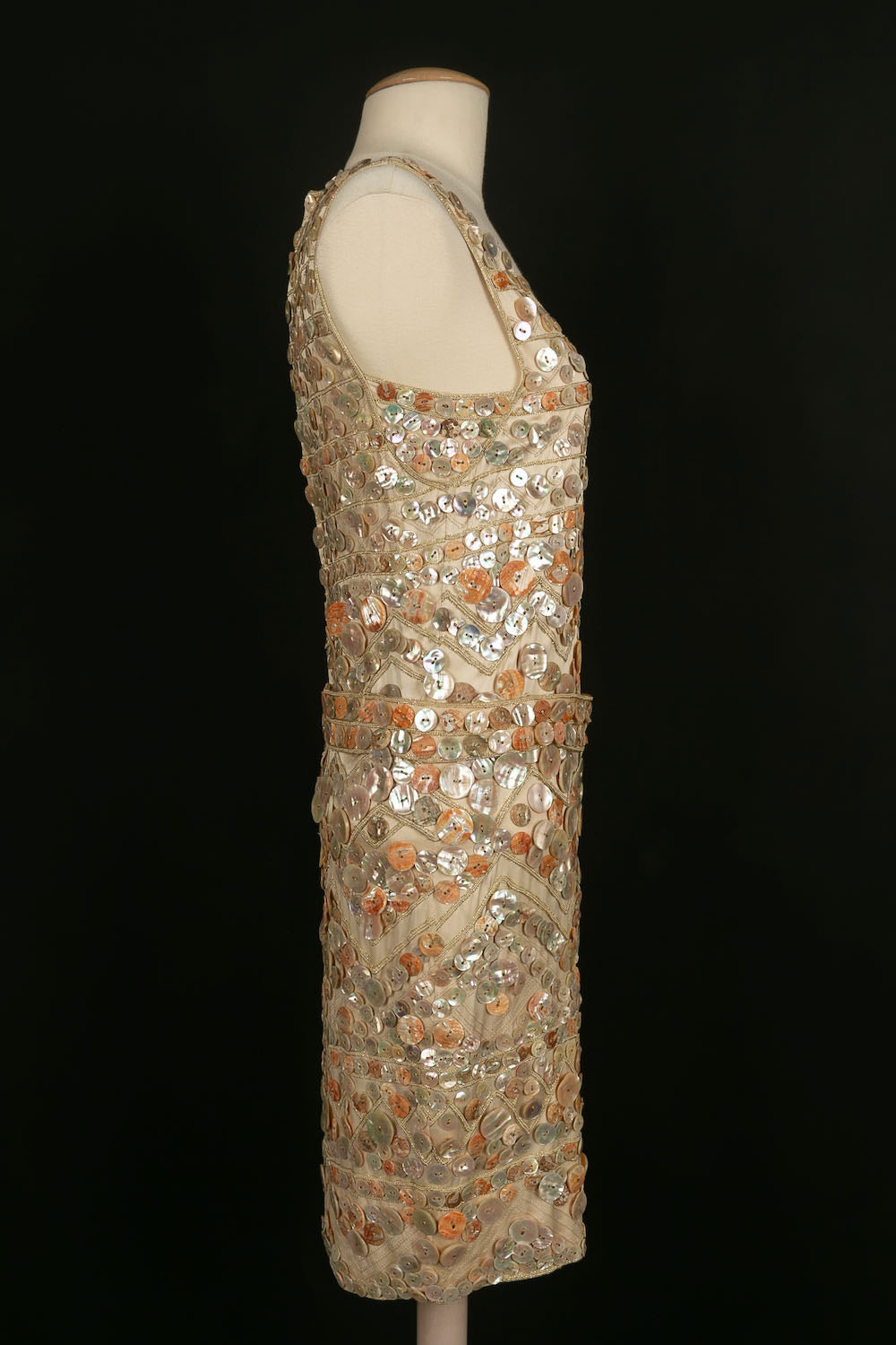 LOUIS FERAUD -Robe du soir en satin brodé de boutons de nacre. Pas de taille indiquée, elle correspond à un 34FR/36FR. Collection "Pretty Woman" Haute Couture Printemps-Été 1991.