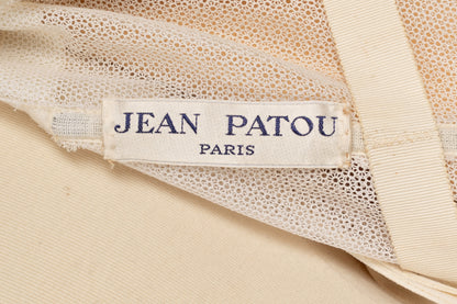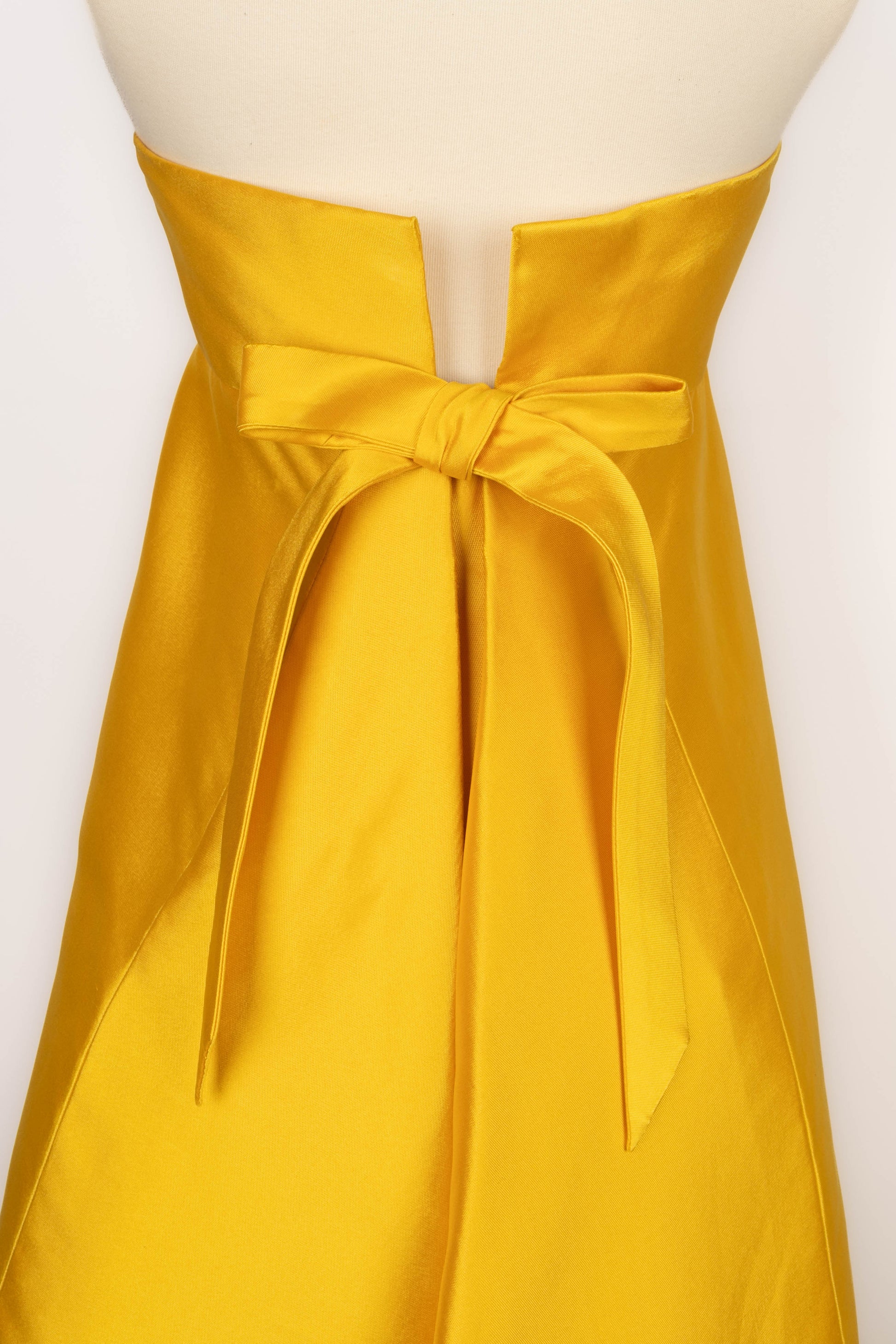 NINA RICCI - (Made in France) Ensemble du soir en ziberline dans les tons de jaune. Le haut de la robe est bustier, effet taille haute, recouvert d'une casaque brodée de perles translucides. Le dos est ouvert et laisse apparaitre le noeud de la robe. Jupe ample sur jupon à large plis creux ouvert dans le dos. Etiquette de taille absente, elle convient à un 34FR/36FR. Collection Haute Couture circa 1960.