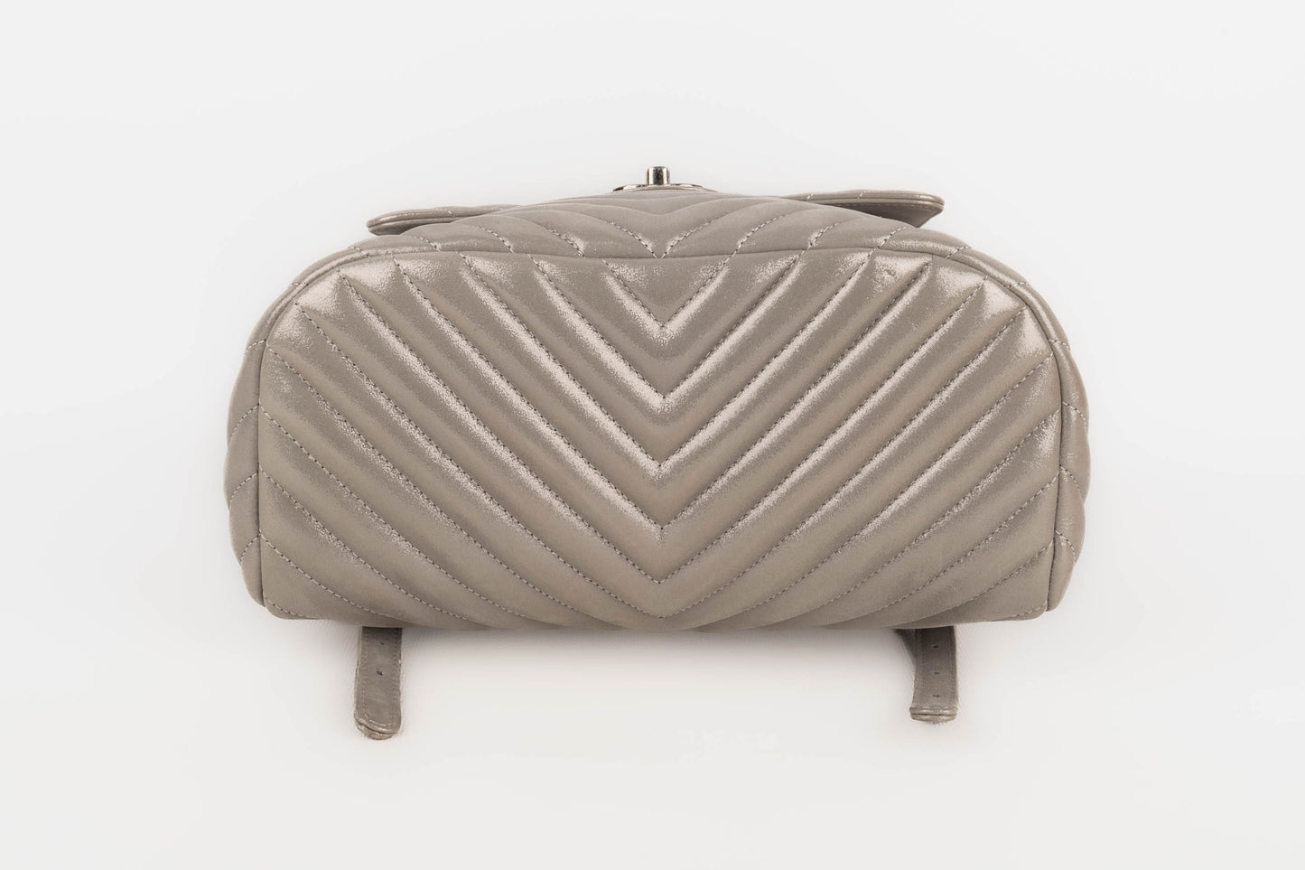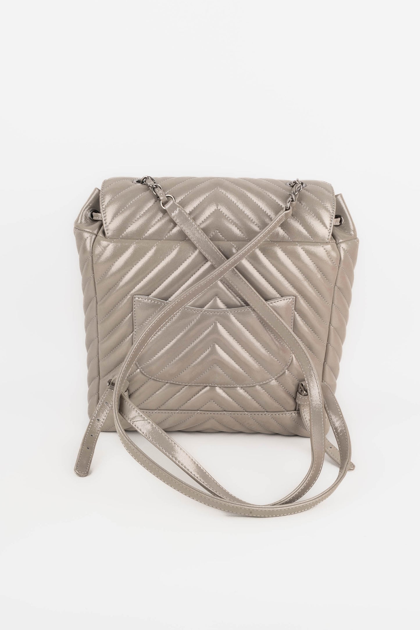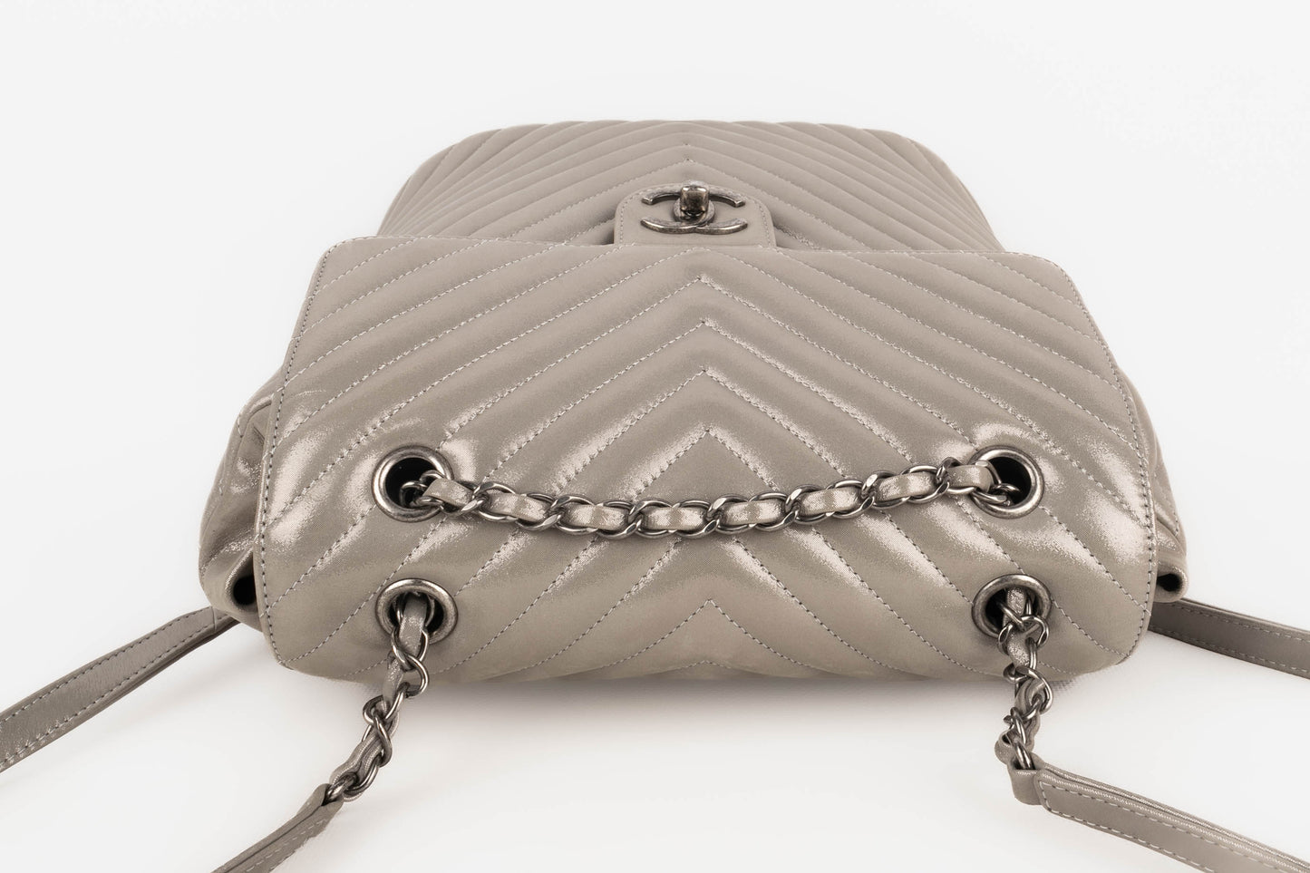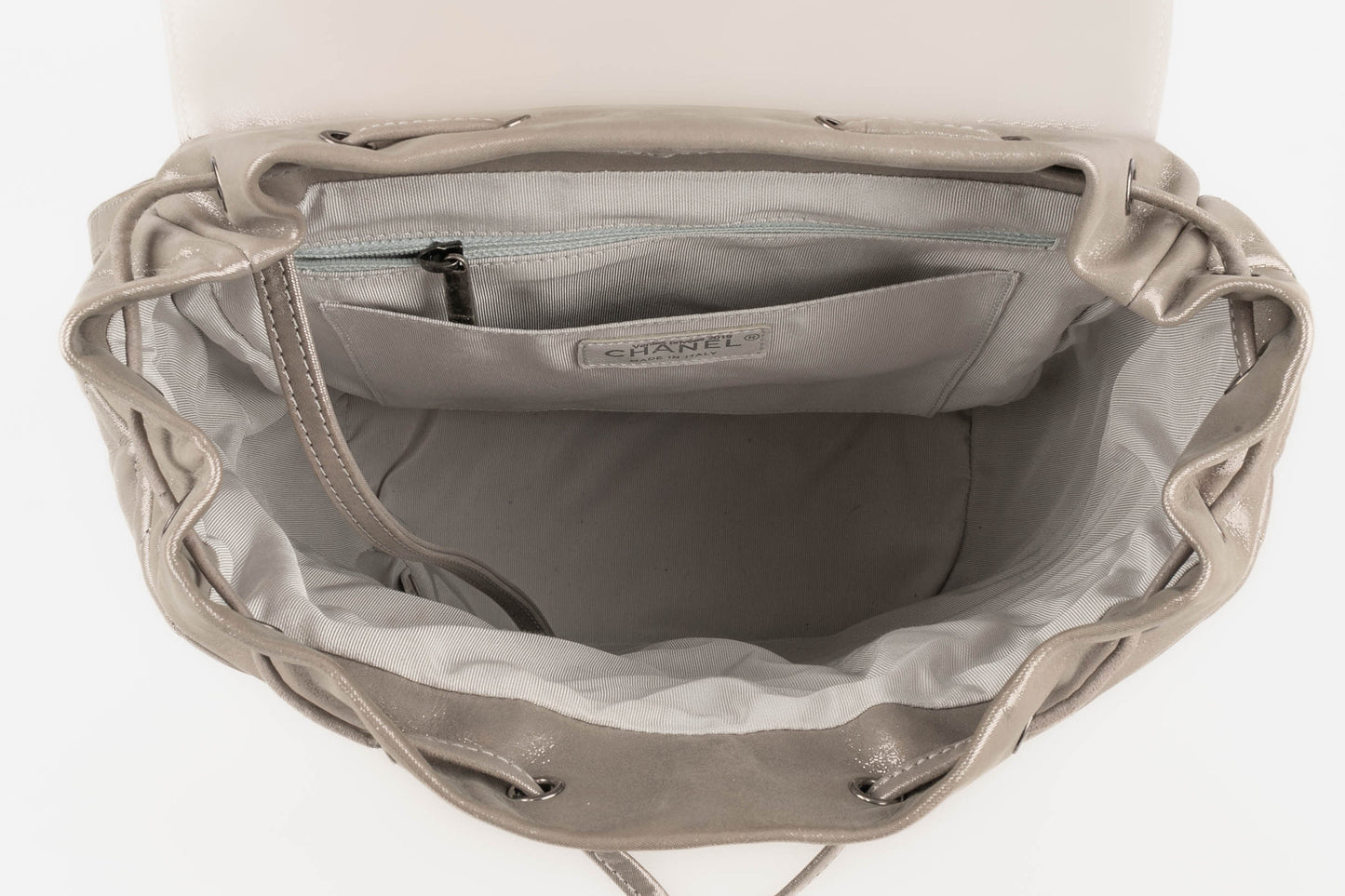 CHANEL -(Made in Italy) Sac à dos en cuir enduit iridescent à surpiqures chevron. Fermoir cc sur rabat, bretelles réglables se transformant en anse. Numéro de série et certificat présent. Collection 2016/2017. Pièce achetée lors des ventes privées.