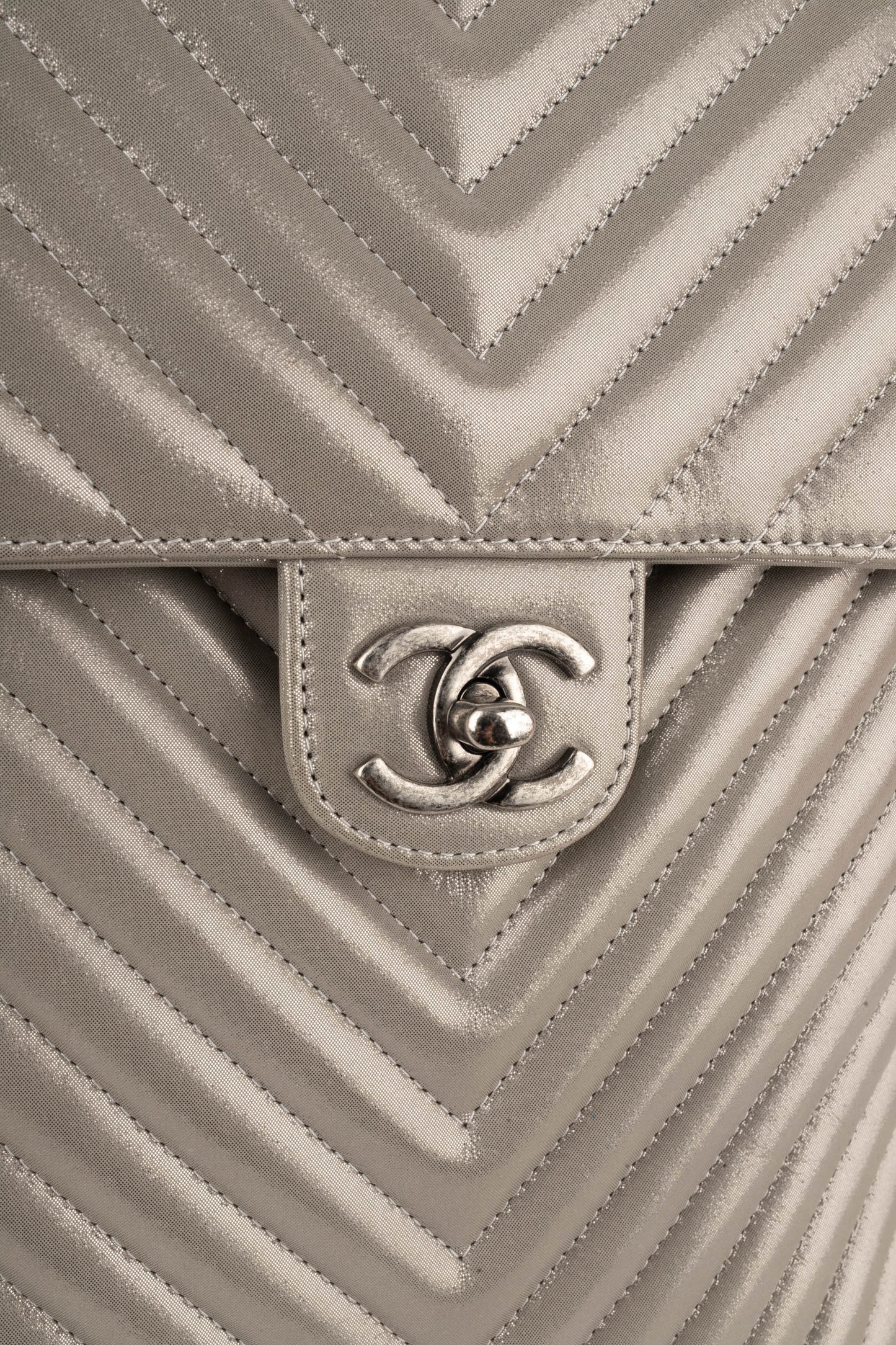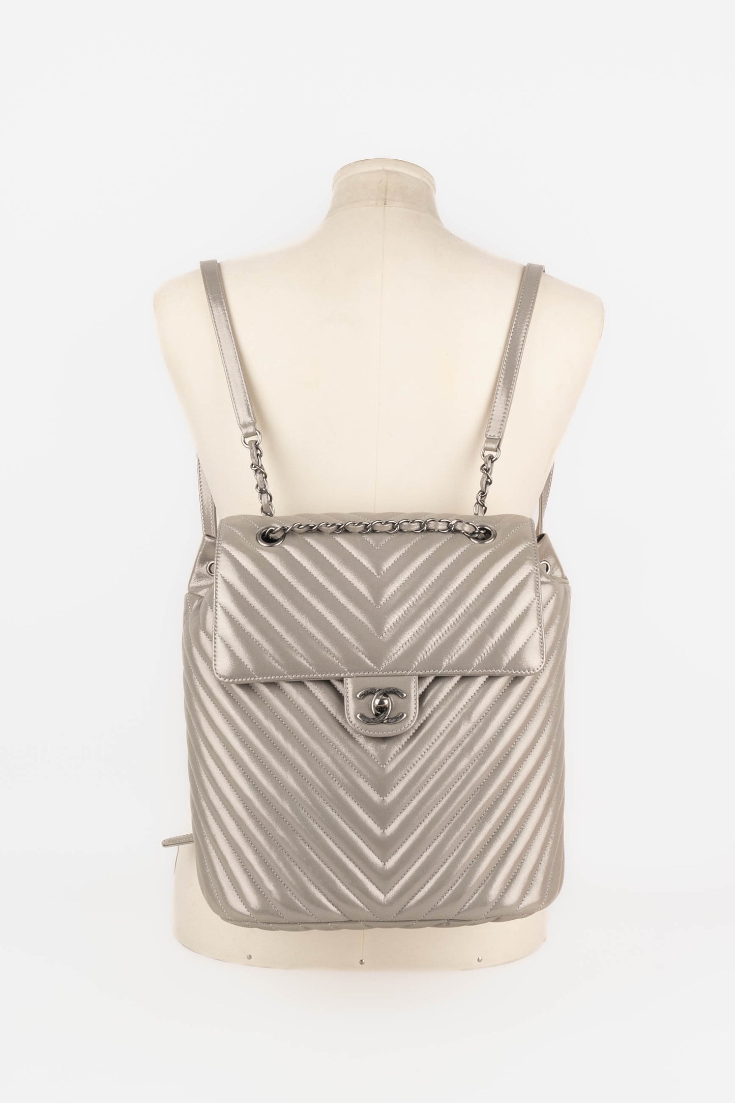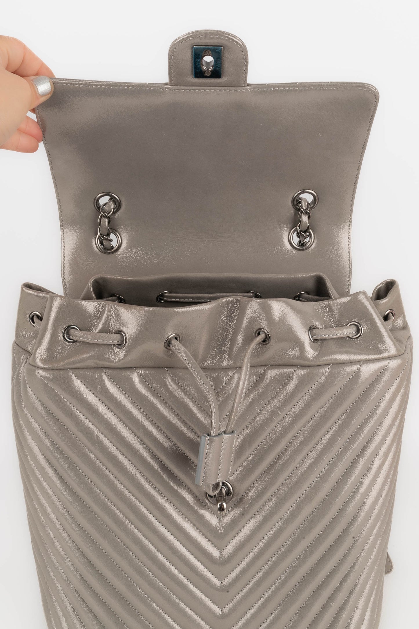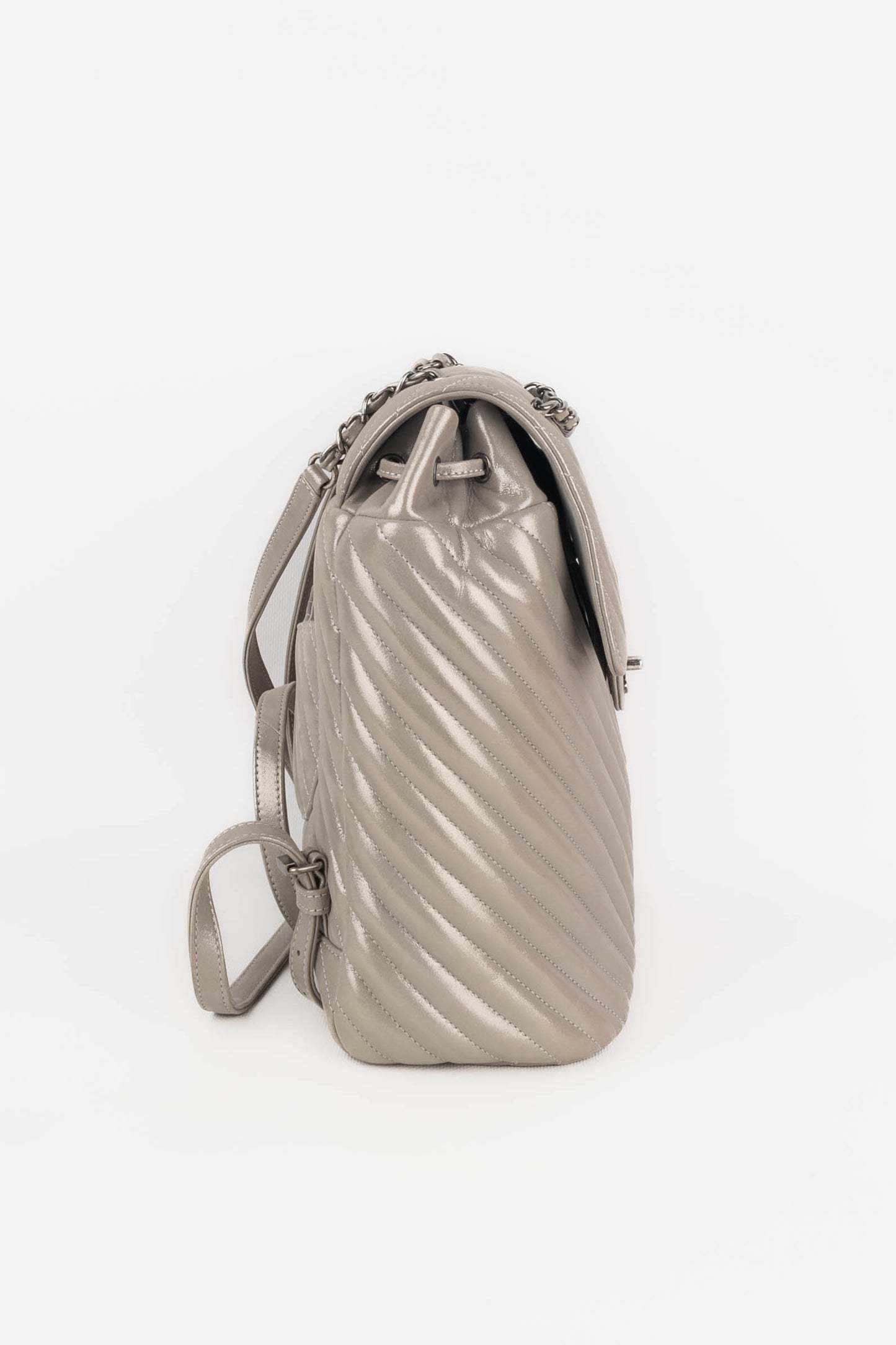 CHANEL -(Made in Italy) Sac à dos en cuir enduit iridescent à surpiqures chevron. Fermoir cc sur rabat, bretelles réglables se transformant en anse. Numéro de série et certificat présent. Collection 2016/2017. Pièce achetée lors des ventes privées.