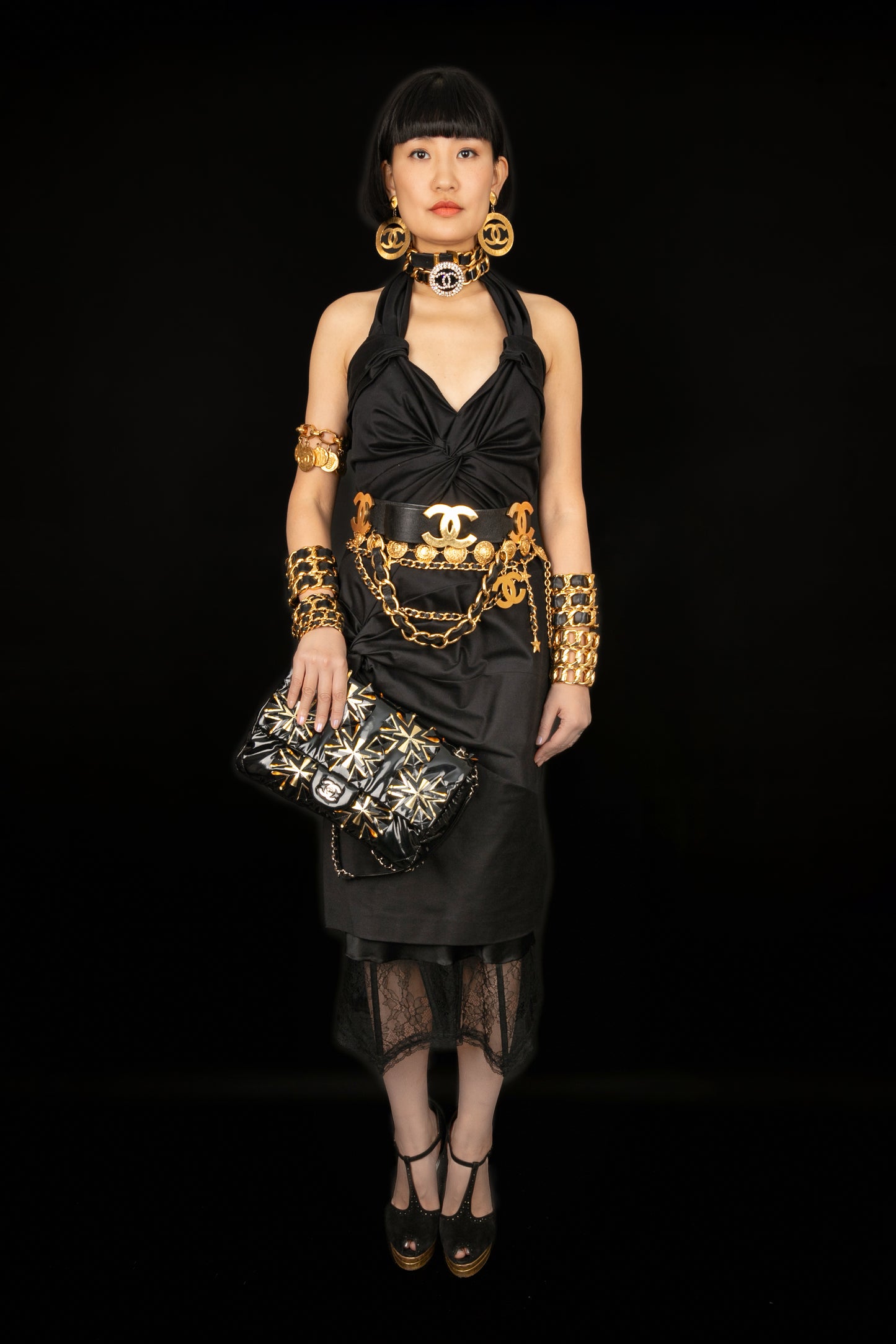 CHANEL -(Made in France) Sac en cuir souple vernis noir et doré. Attributs en métal doré. Numéro de série et carte d'authenticité présents. Collection Automne-Hiver 2019.