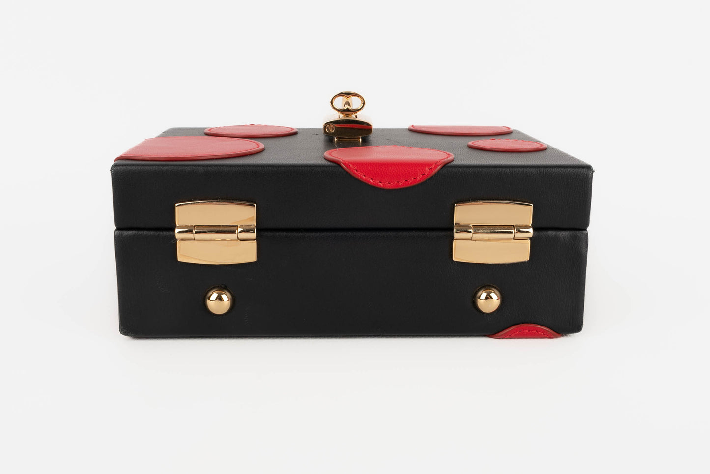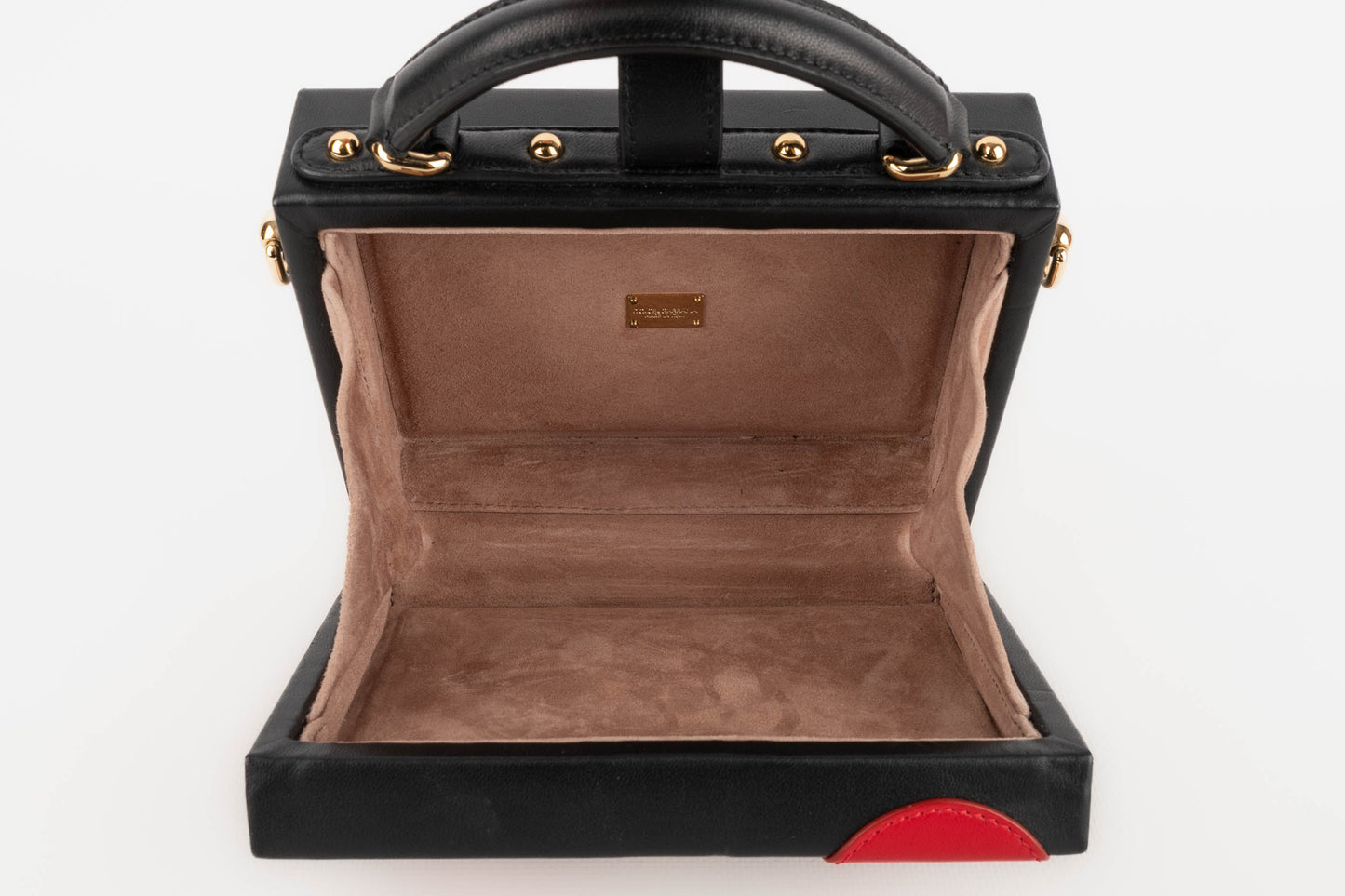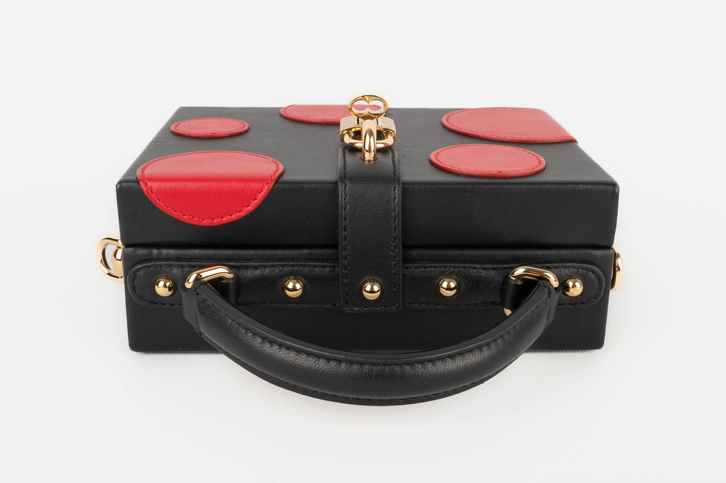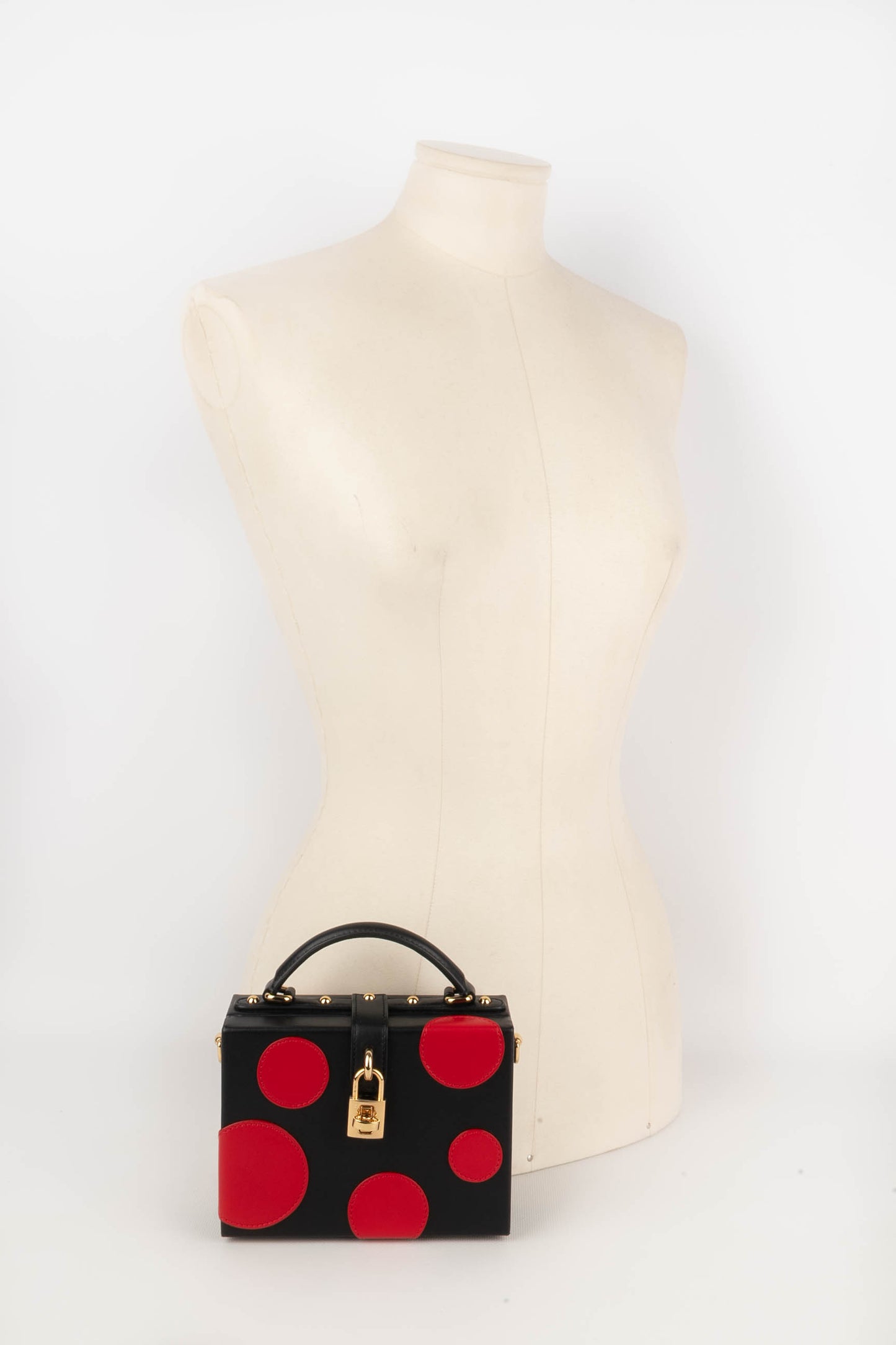 DOLCE & GABBANA -(Made in Italy) Petit sac mallette en cuir d'agneau noir et cercles en cuir d'agneau rouge, attributs en métal doré.