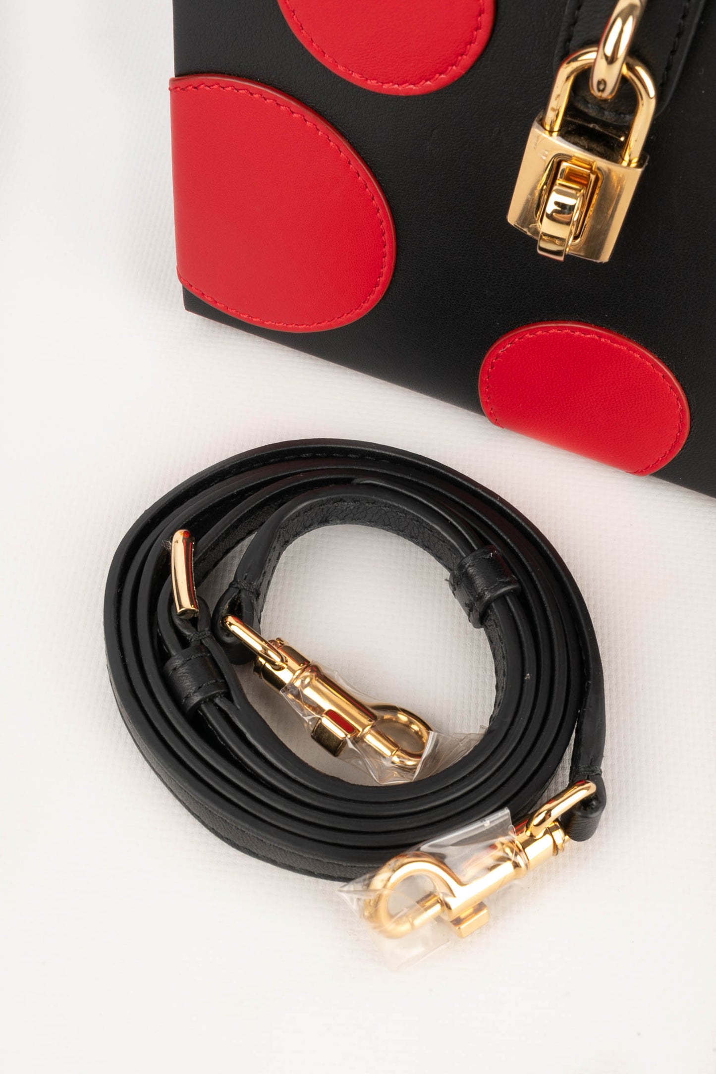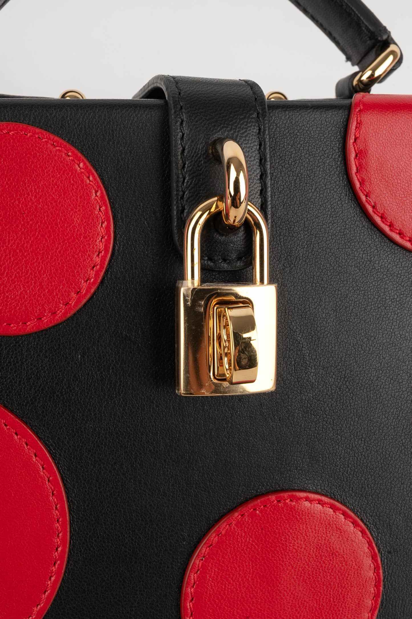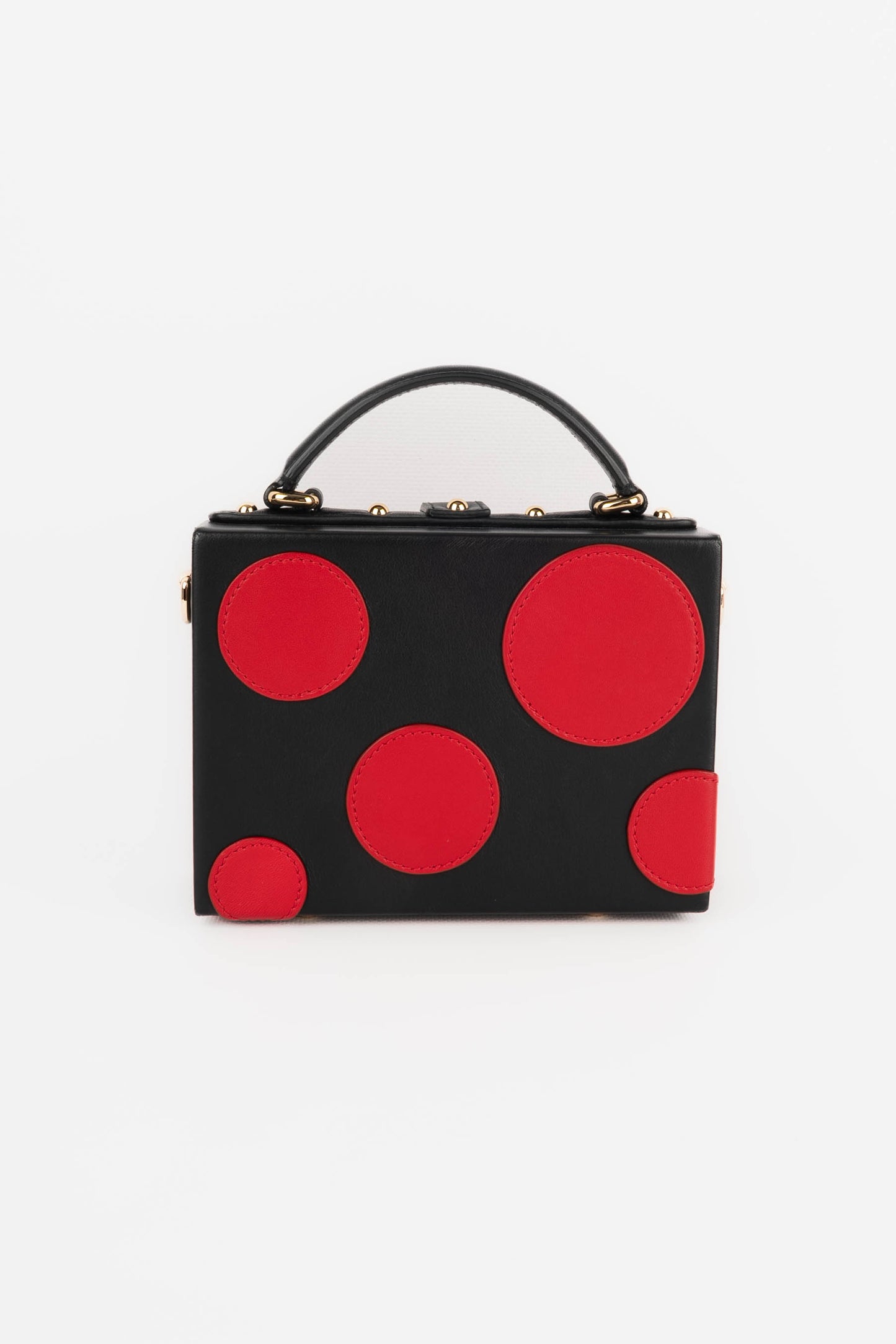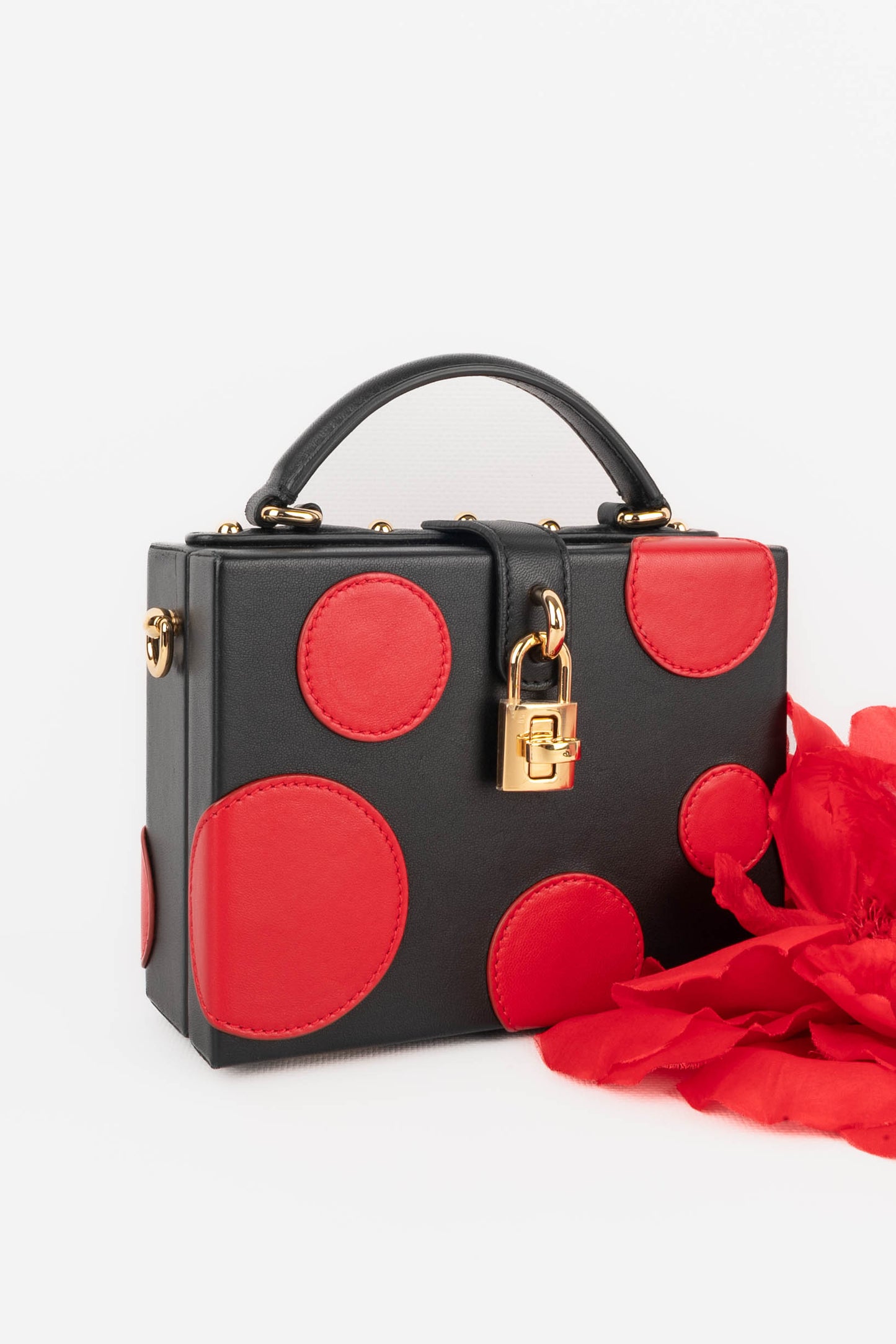 DOLCE & GABBANA -(Made in Italy) Petit sac mallette en cuir d'agneau noir et cercles en cuir d'agneau rouge, attributs en métal doré.