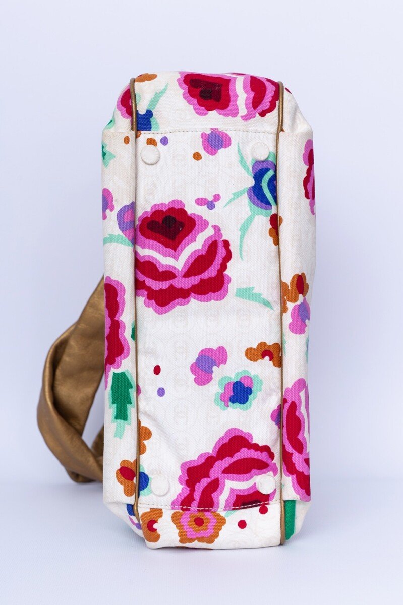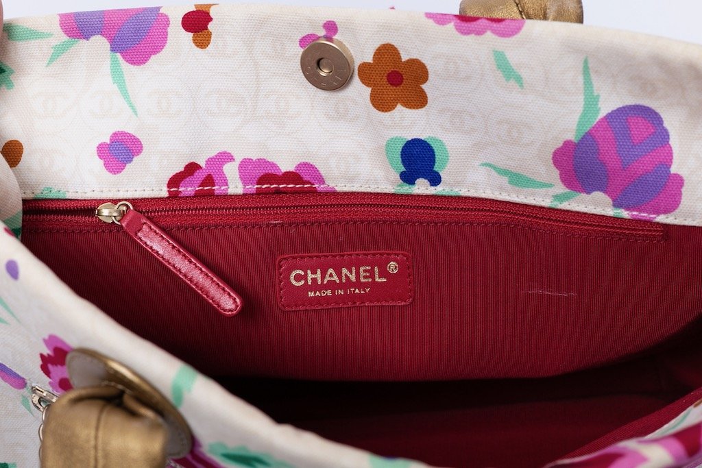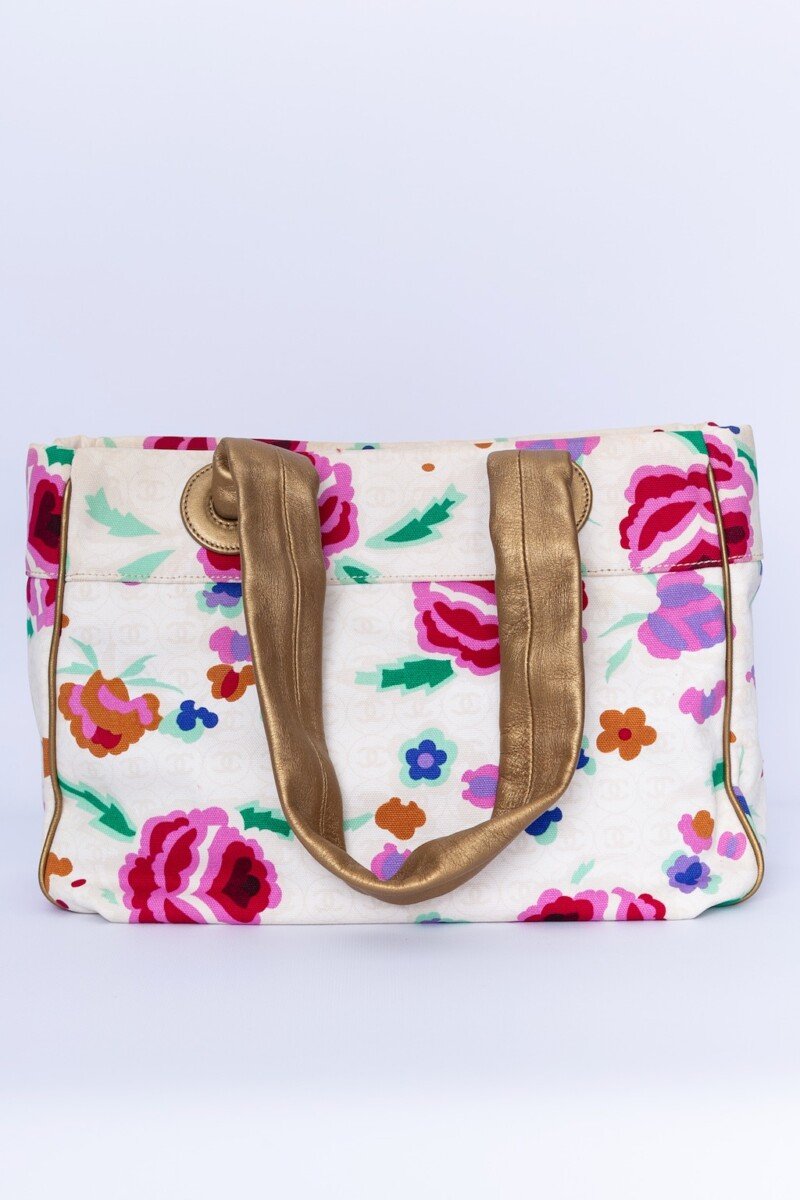 CHANEL -(Made in Italy) Sac en toile et cuir doré. Numéro de série et carte d'authenticité présente. Collection Prêt-à-Porter Printemps Été 2004 sous la direction de Karl Lagerfeld. A signaler, de rares marques sur la toile intérieure.