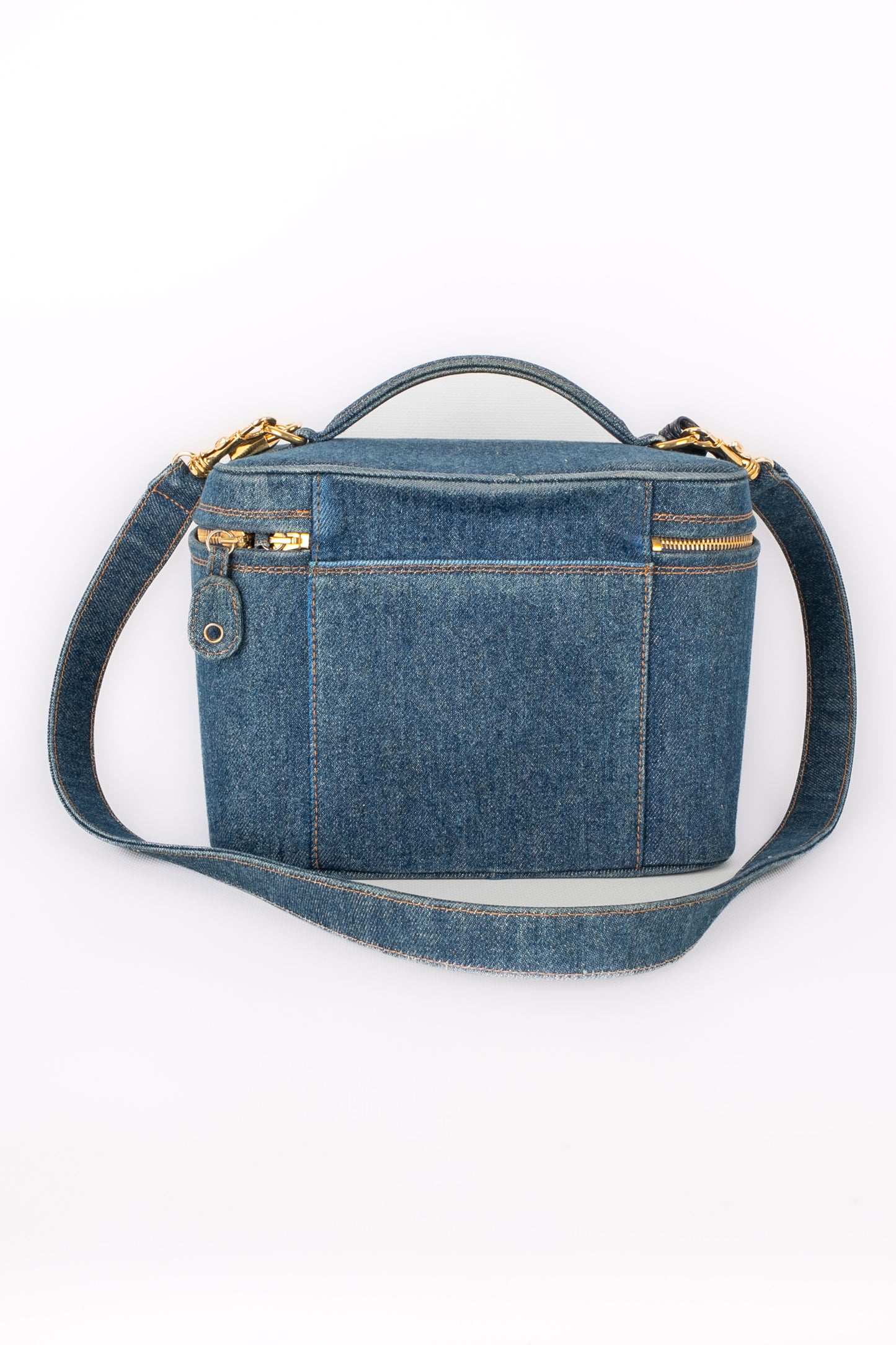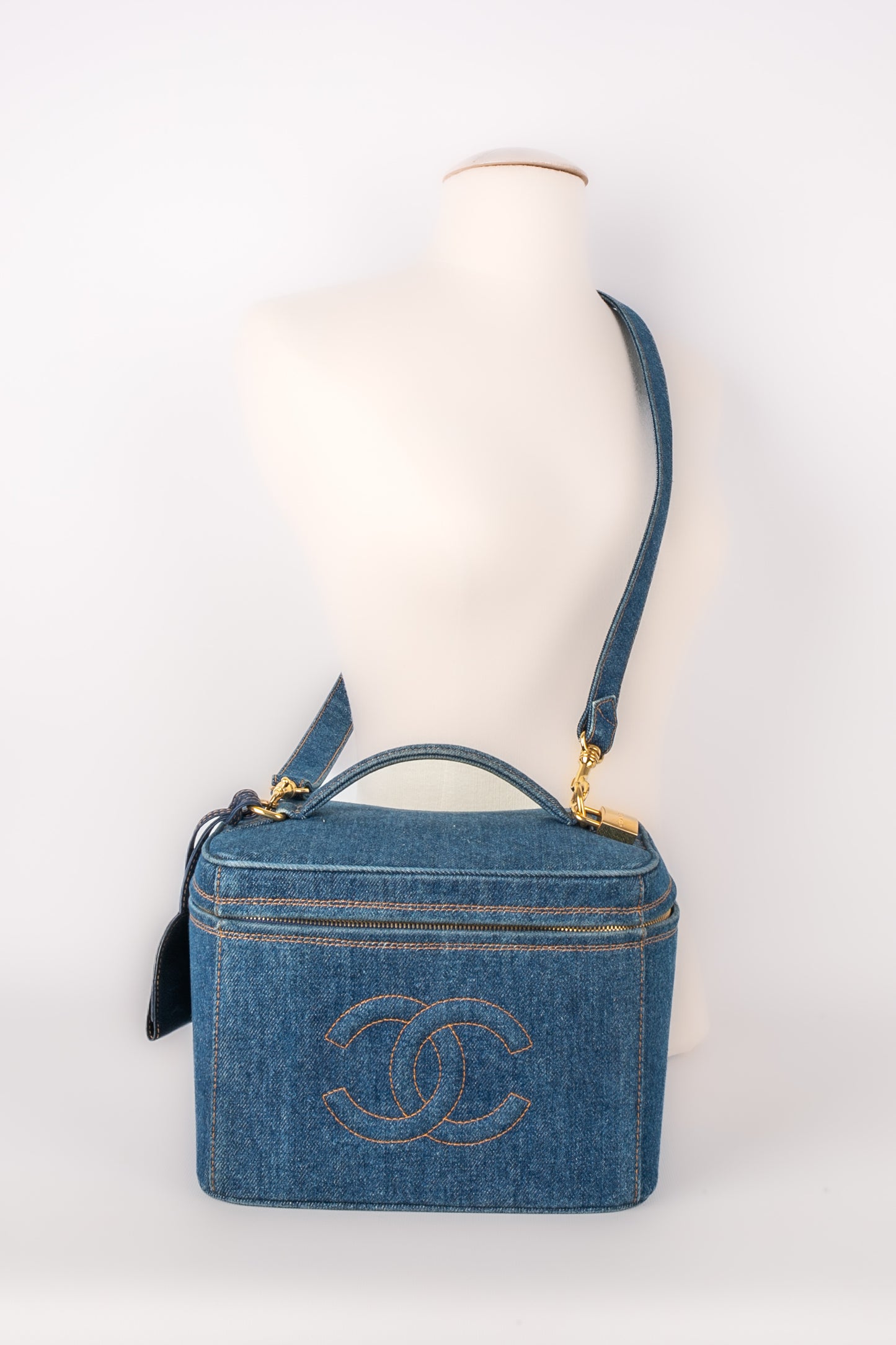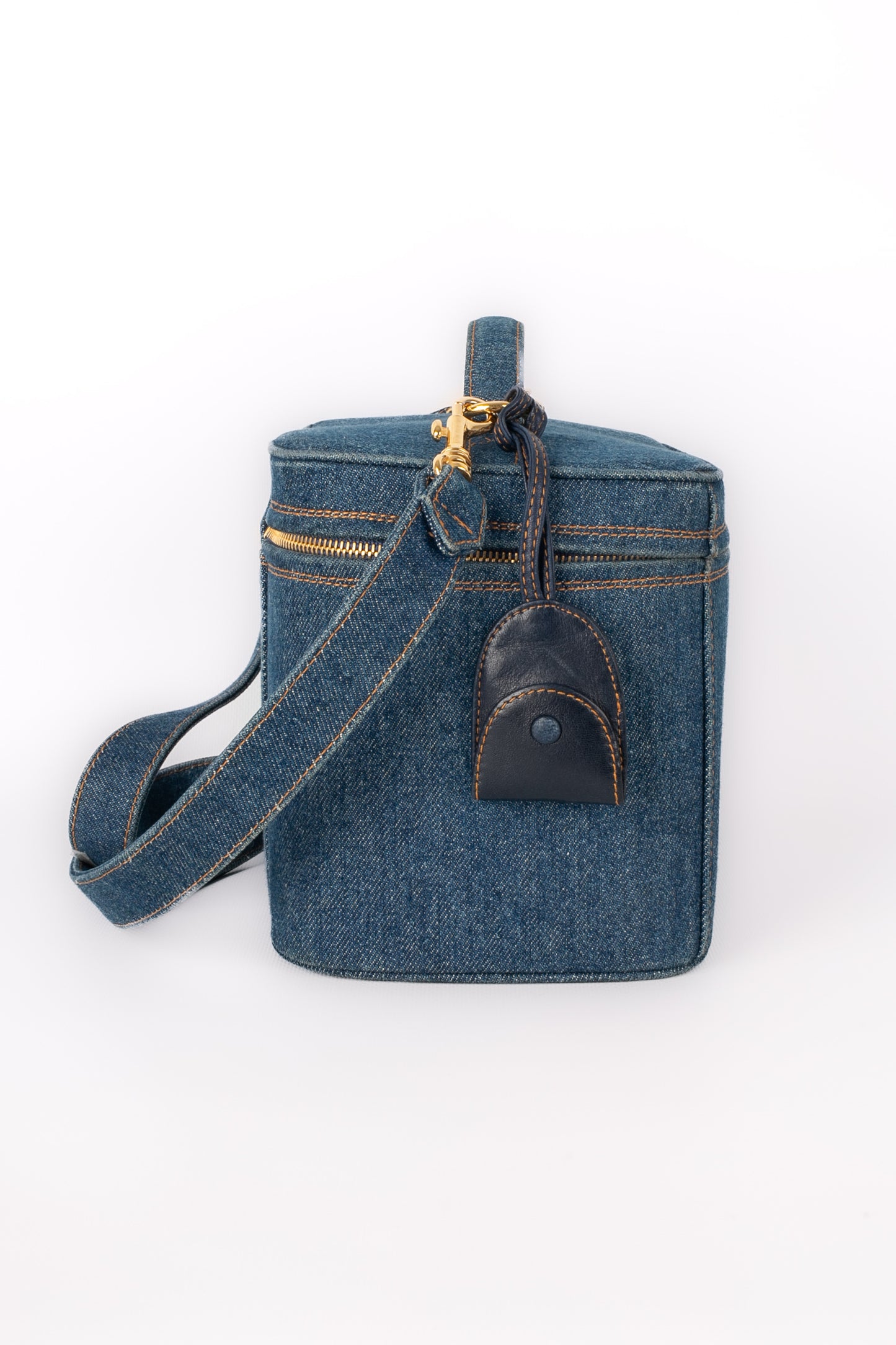 CHANEL -(Made in Italy) Sac Vanity en denim bleu et métal doré. Anse amovible et cadenas. Numéro de série présent. Collection 1996/1997.