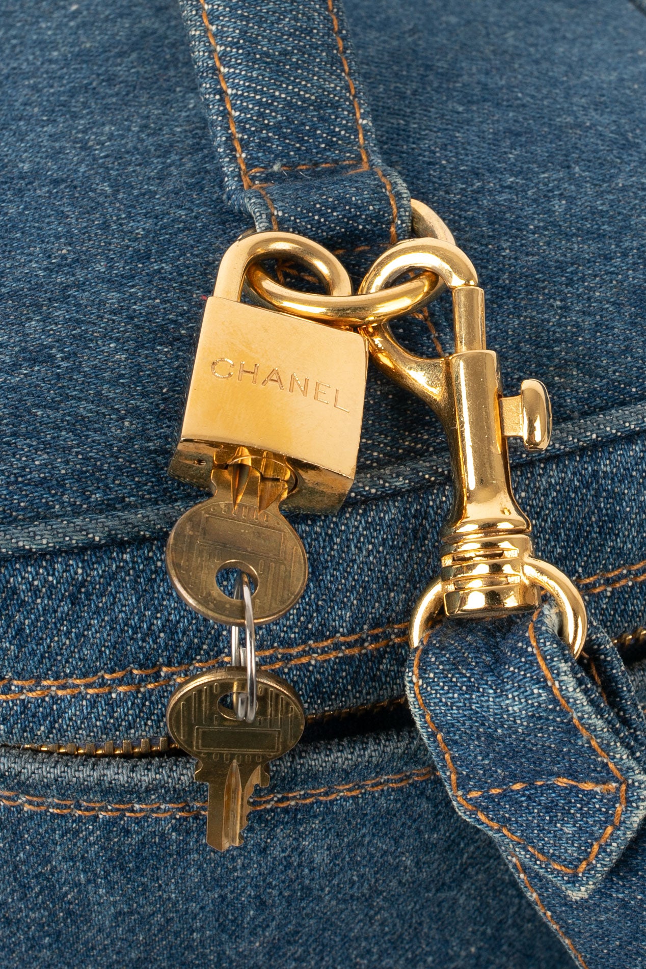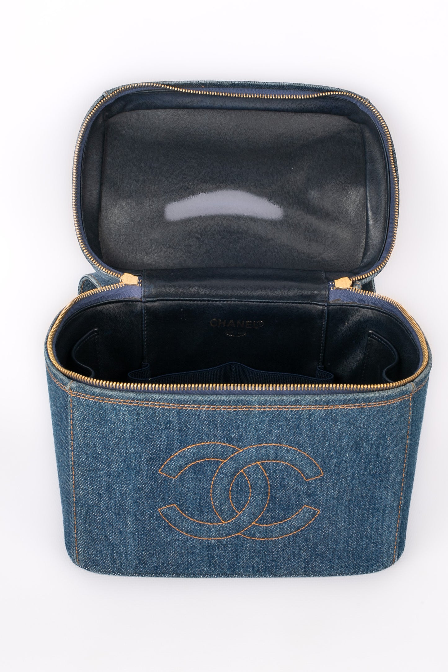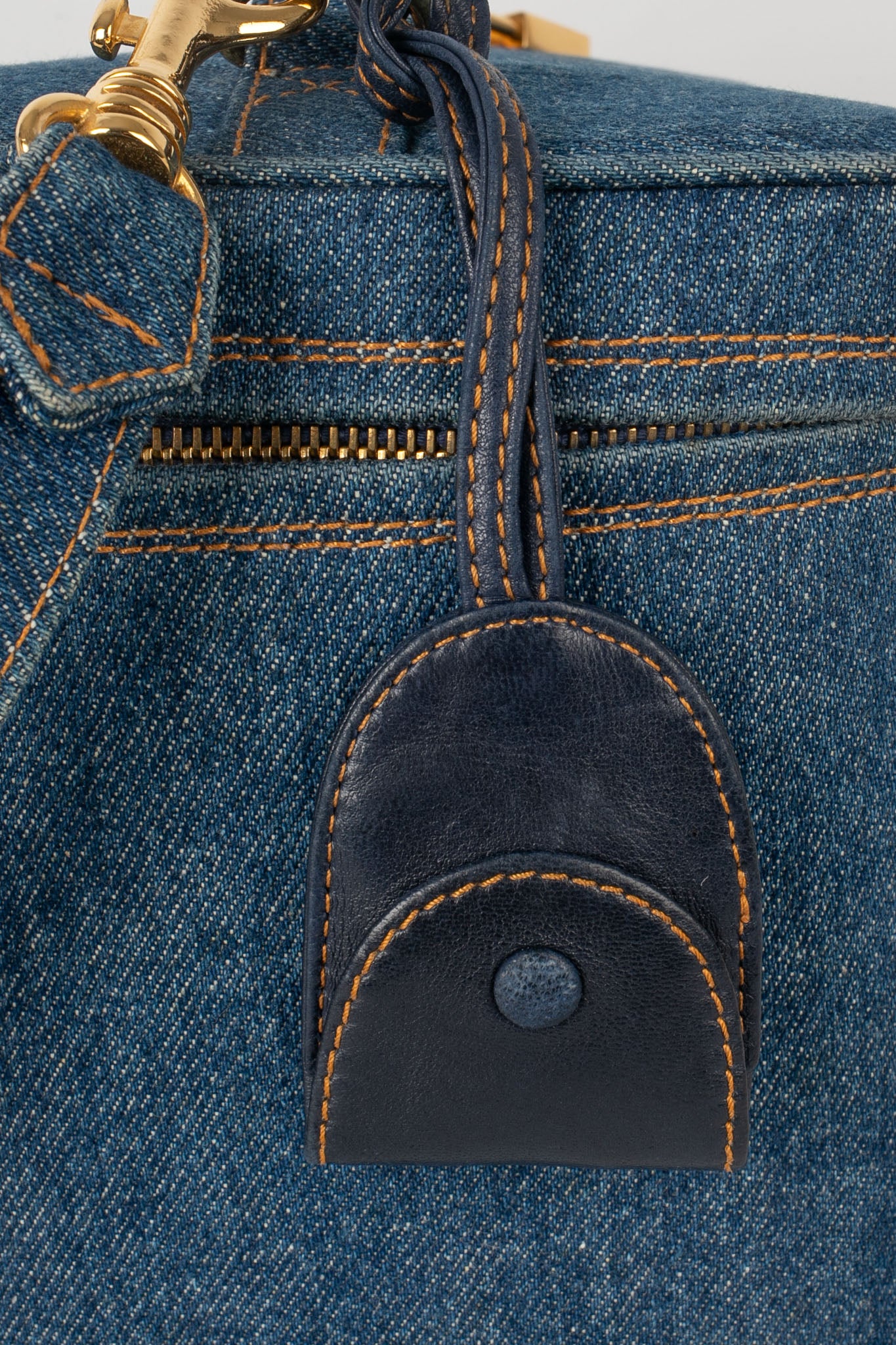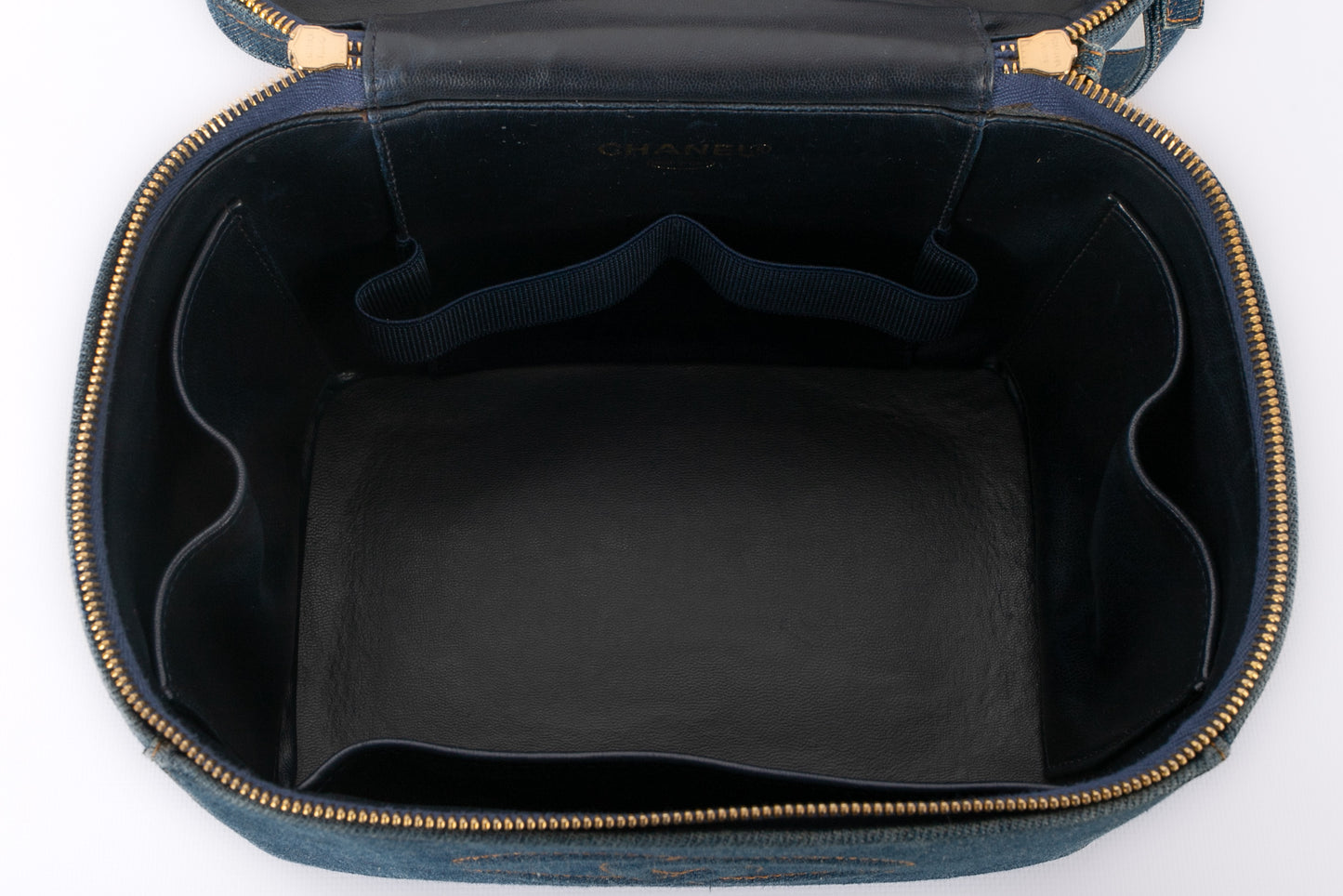 CHANEL -(Made in Italy) Sac Vanity en denim bleu et métal doré. Anse amovible et cadenas. Numéro de série présent. Collection 1996/1997.