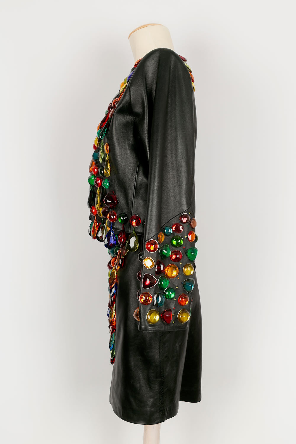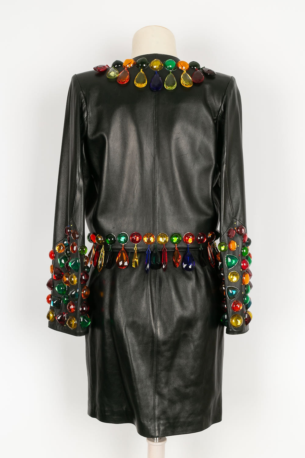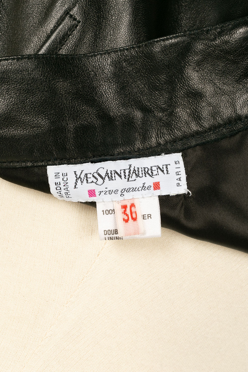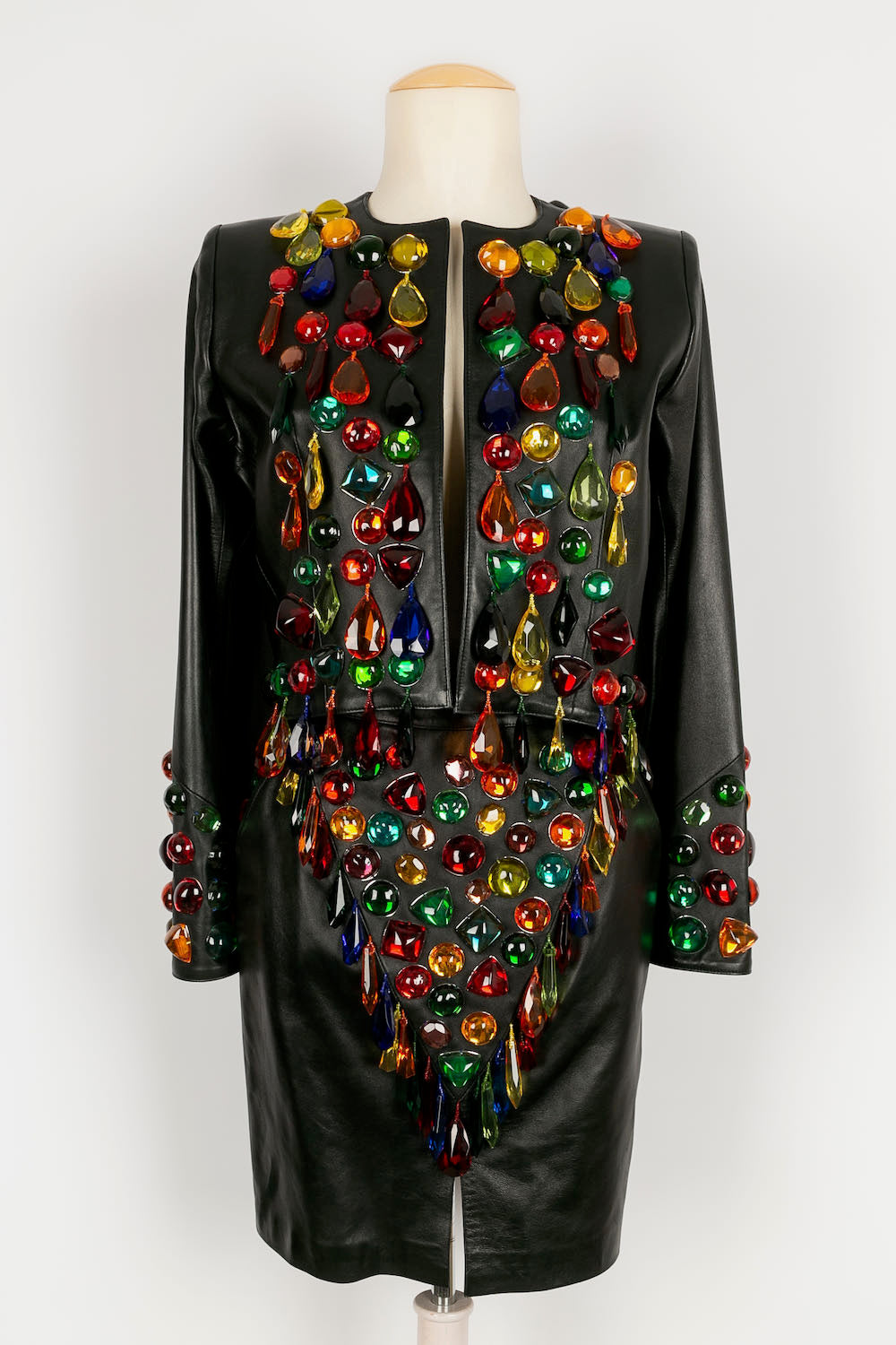 YVES SAINT LAURENT -(Made in France) Tailleur en cuir noir et pampilles. Collection Prêt-à-Porter Printemps-Eté 1990. Taille 36FR.