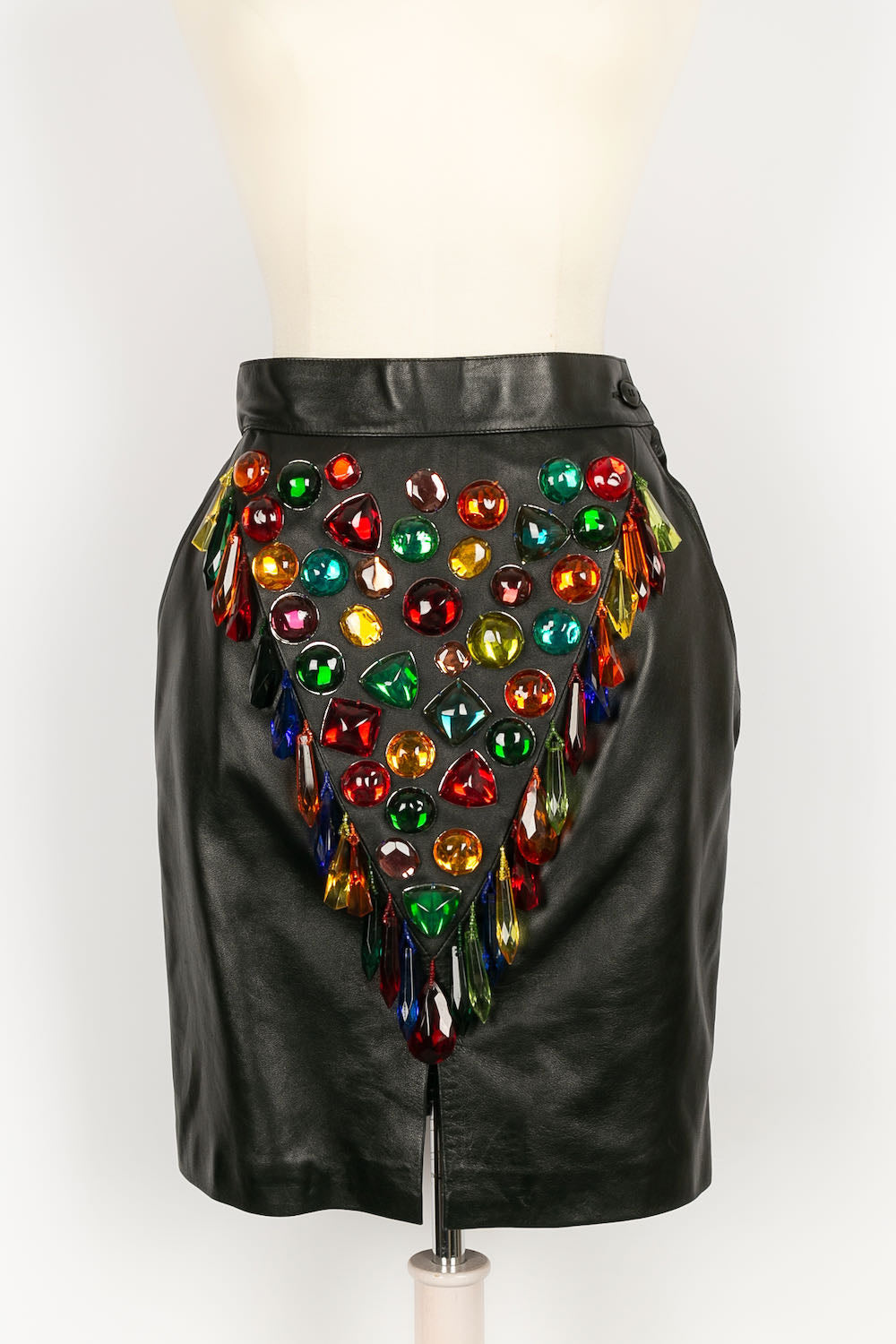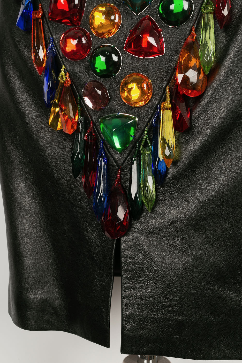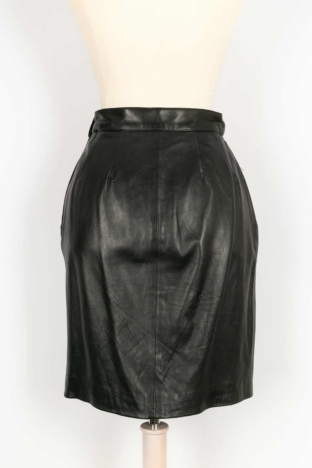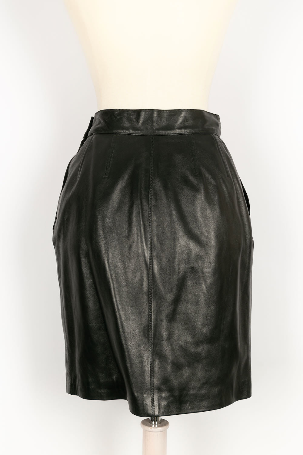 YVES SAINT LAURENT -(Made in France) Tailleur en cuir noir et pampilles. Collection Prêt-à-Porter Printemps-Eté 1990. Taille 36FR.