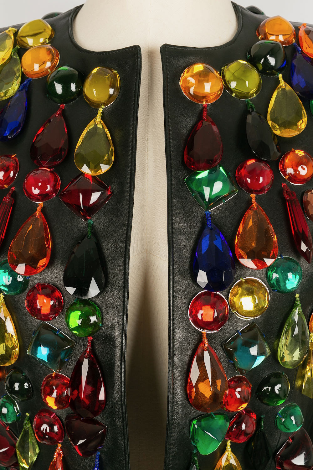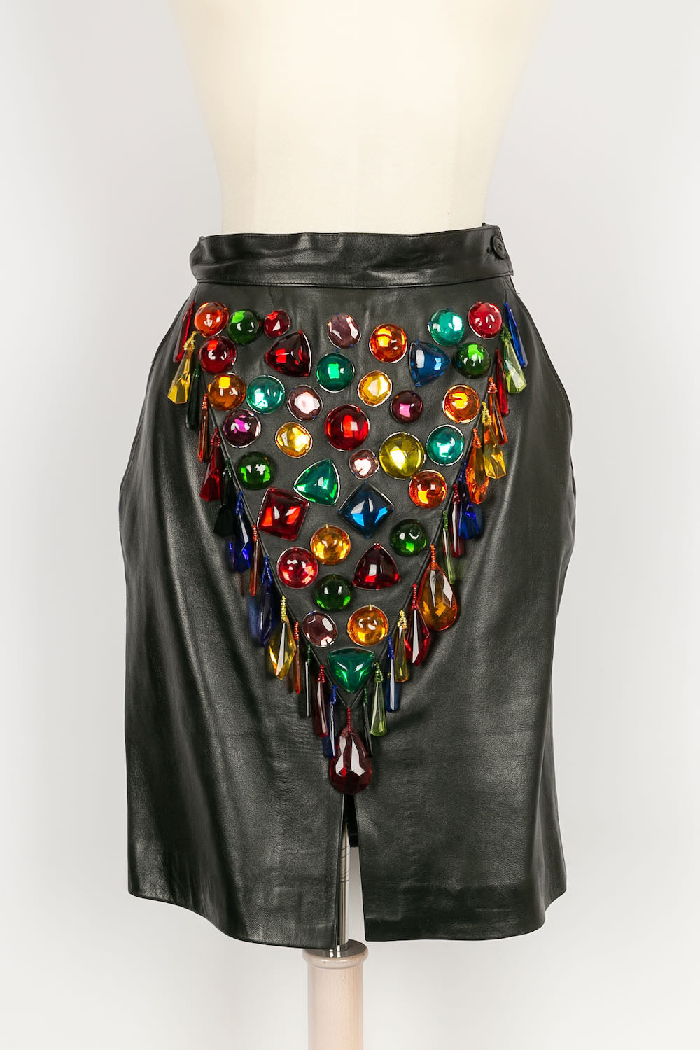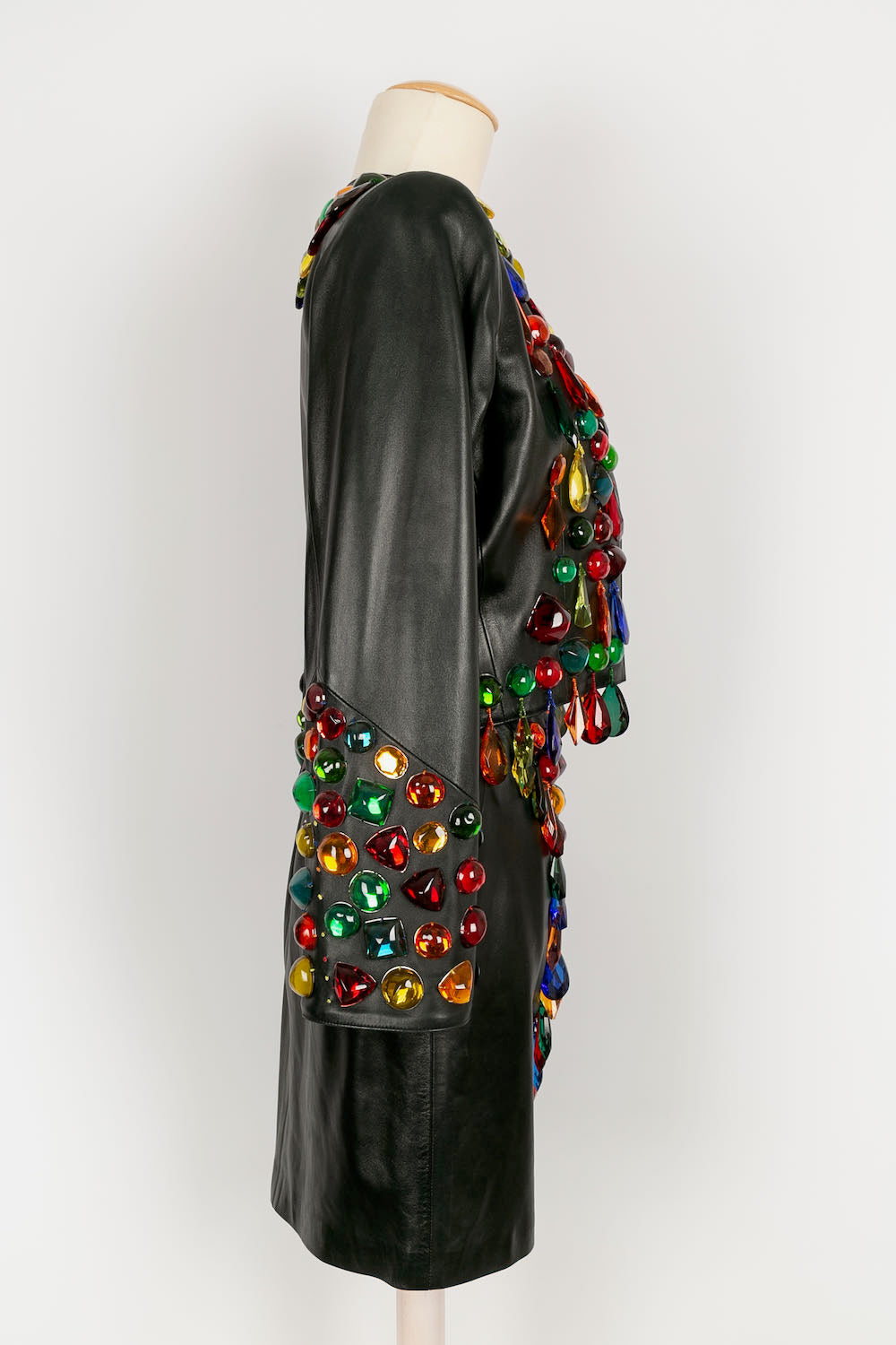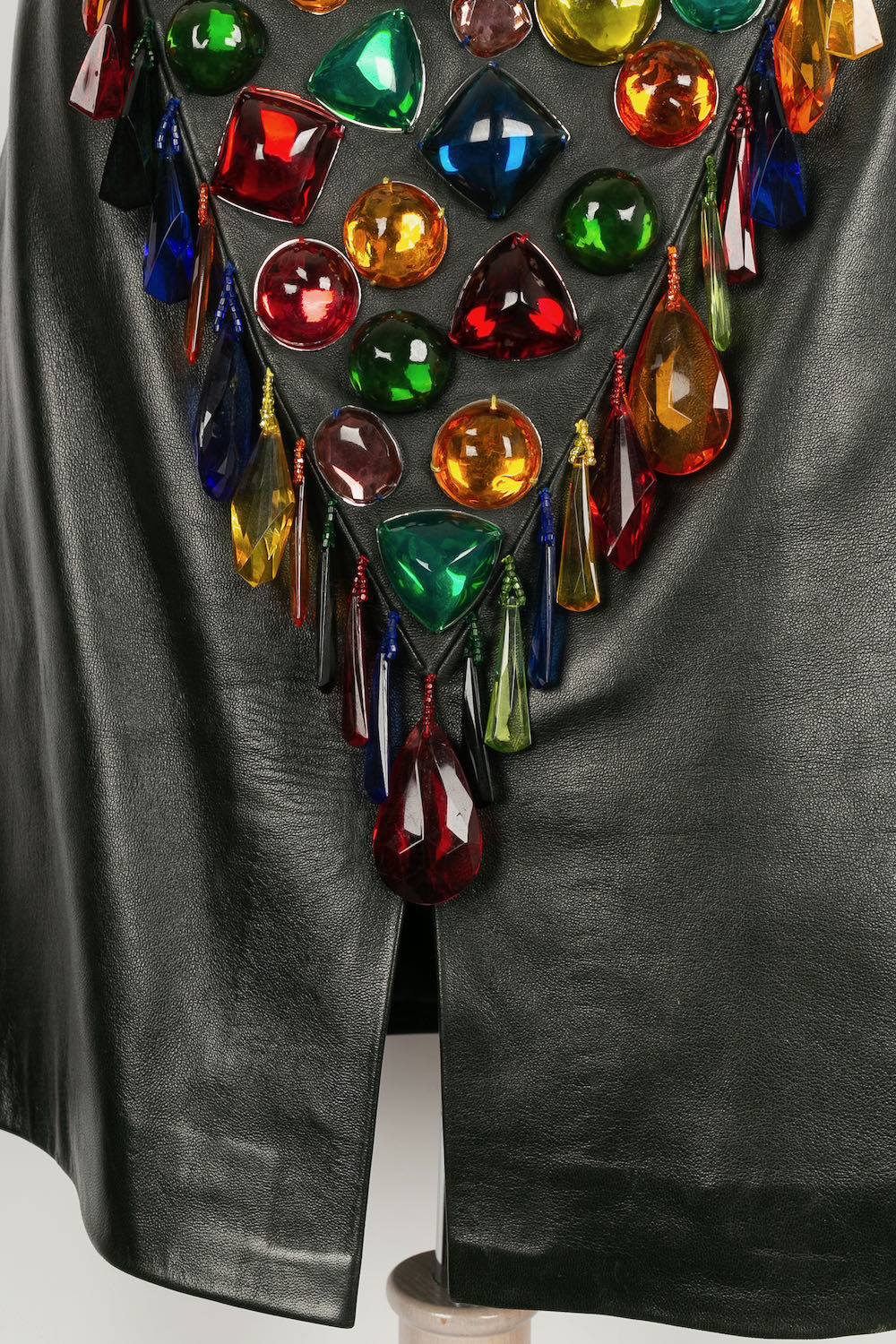 YVES SAINT LAURENT -(Made in France) Tailleur en cuir noir et pampilles. Collection Prêt-à-Porter Printemps-Eté 1990. Taille 36FR.