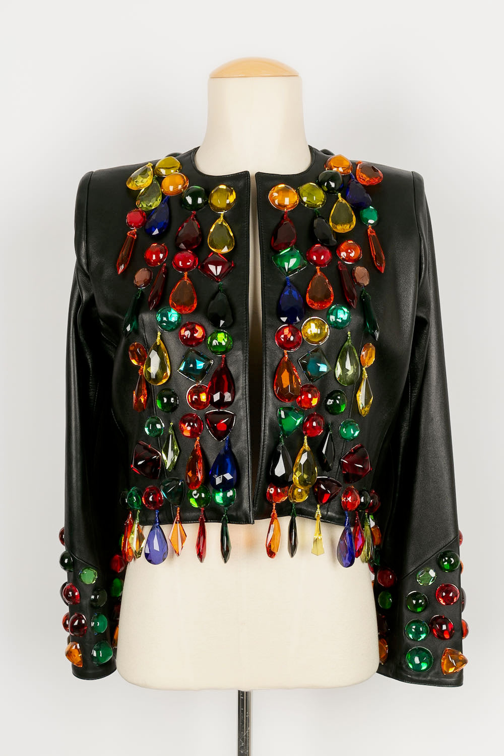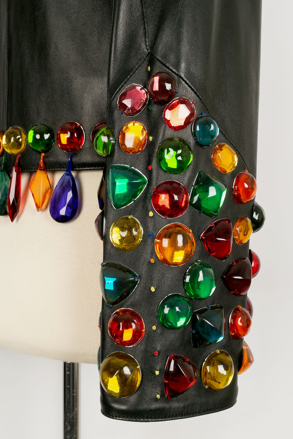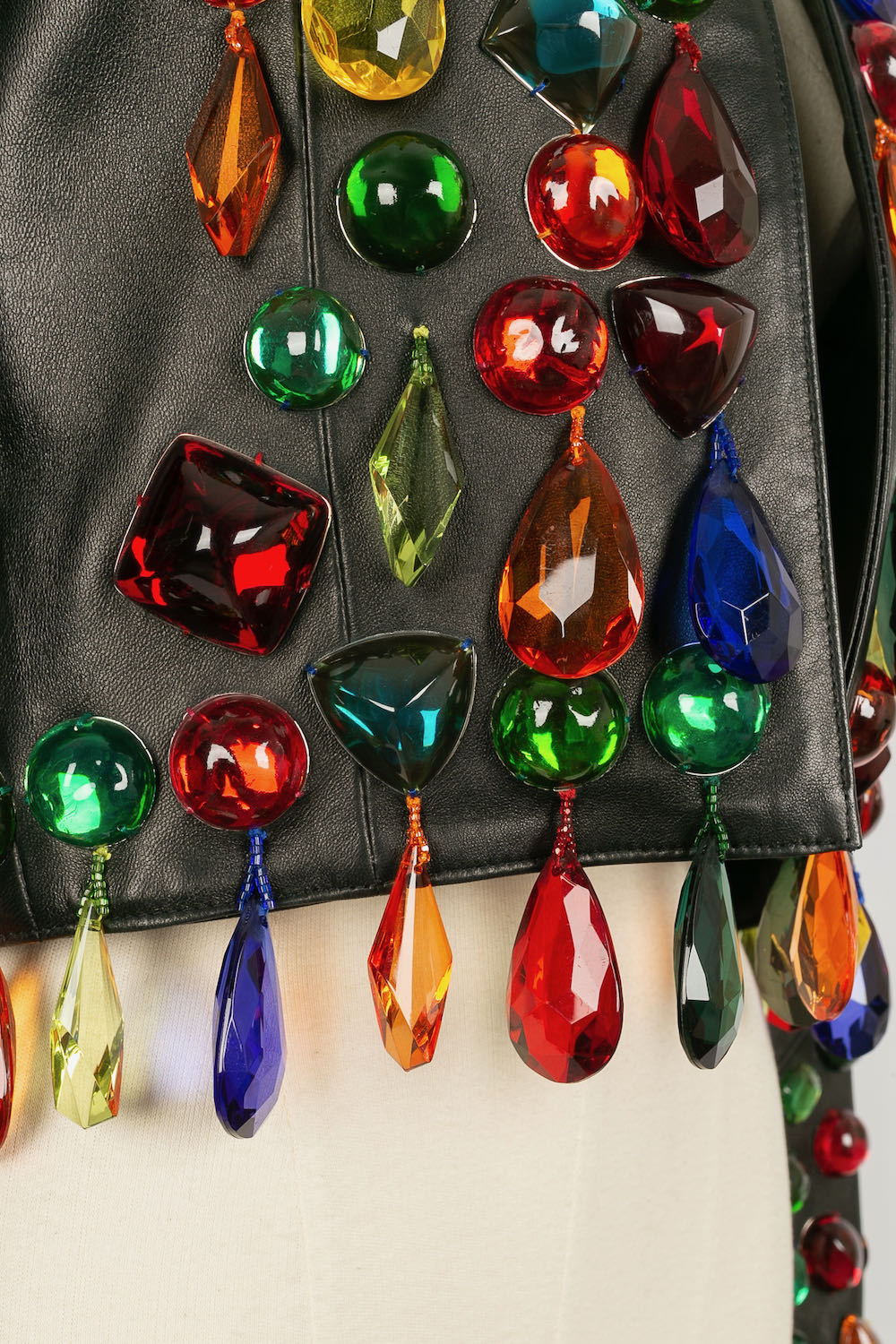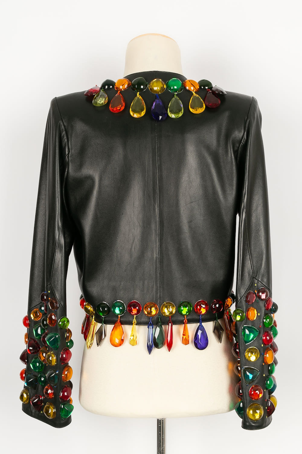 YVES SAINT LAURENT -(Made in France) Tailleur en cuir noir et pampilles. Collection Prêt-à-Porter Printemps-Eté 1990. Taille 36FR.