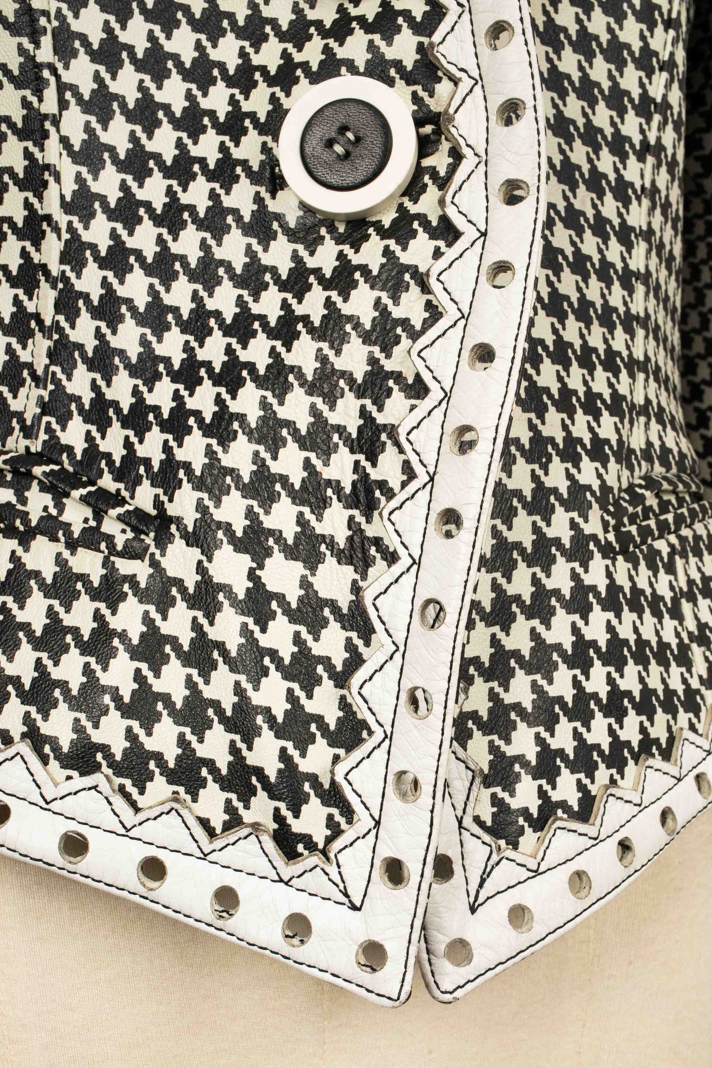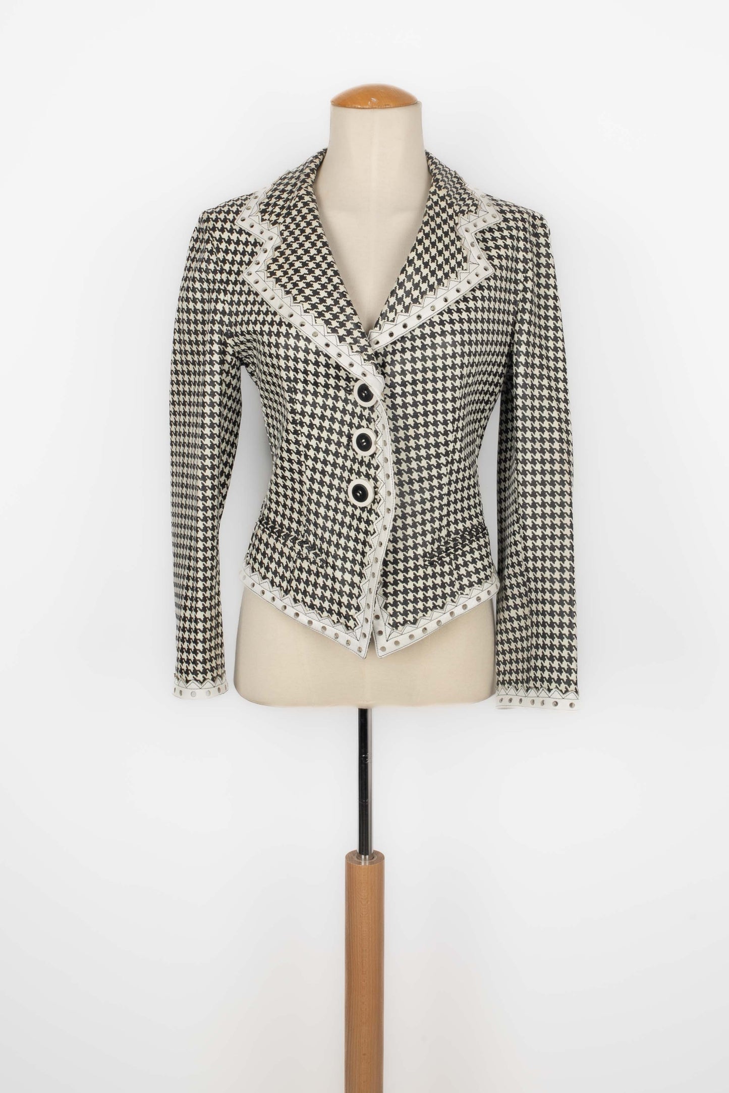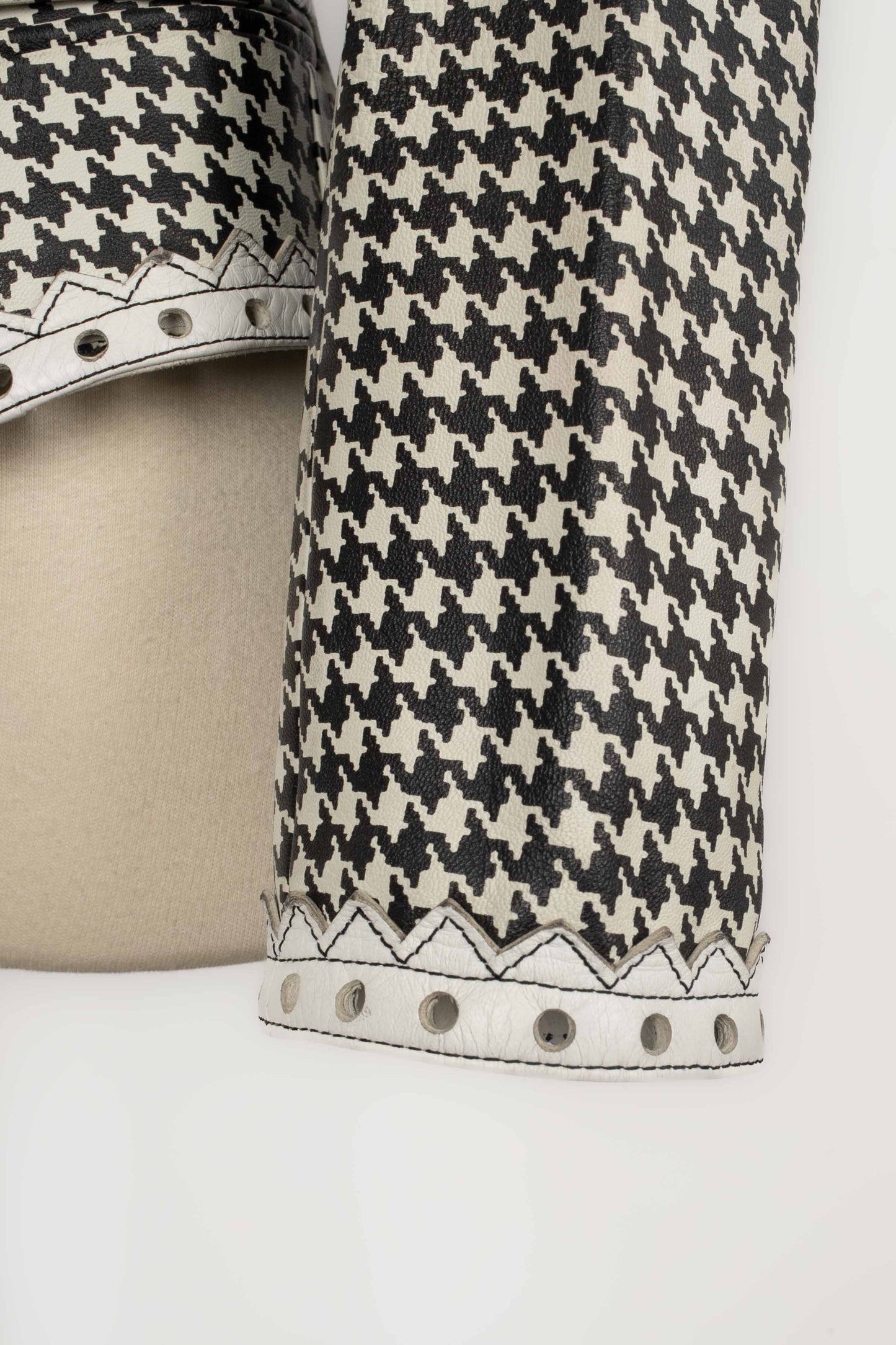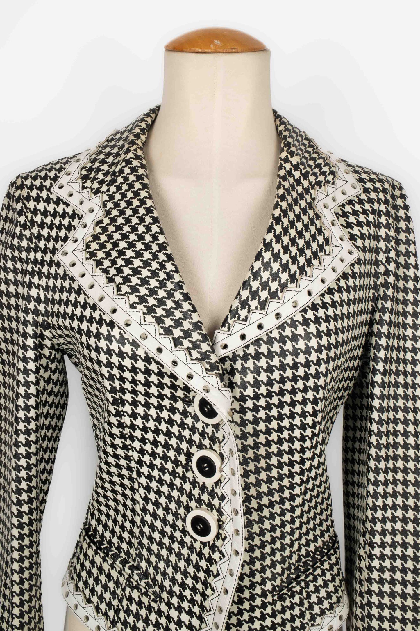 DIOR -(Made in France) Veste en cuir à motifs pied de poule noir et blanc. Pas taille indiquée, elle convient à un 36FR. Collection Printemps-Eté 1995, sous la direction de GianFranco Ferré. Bon état général, à signaler intérieur taché.
