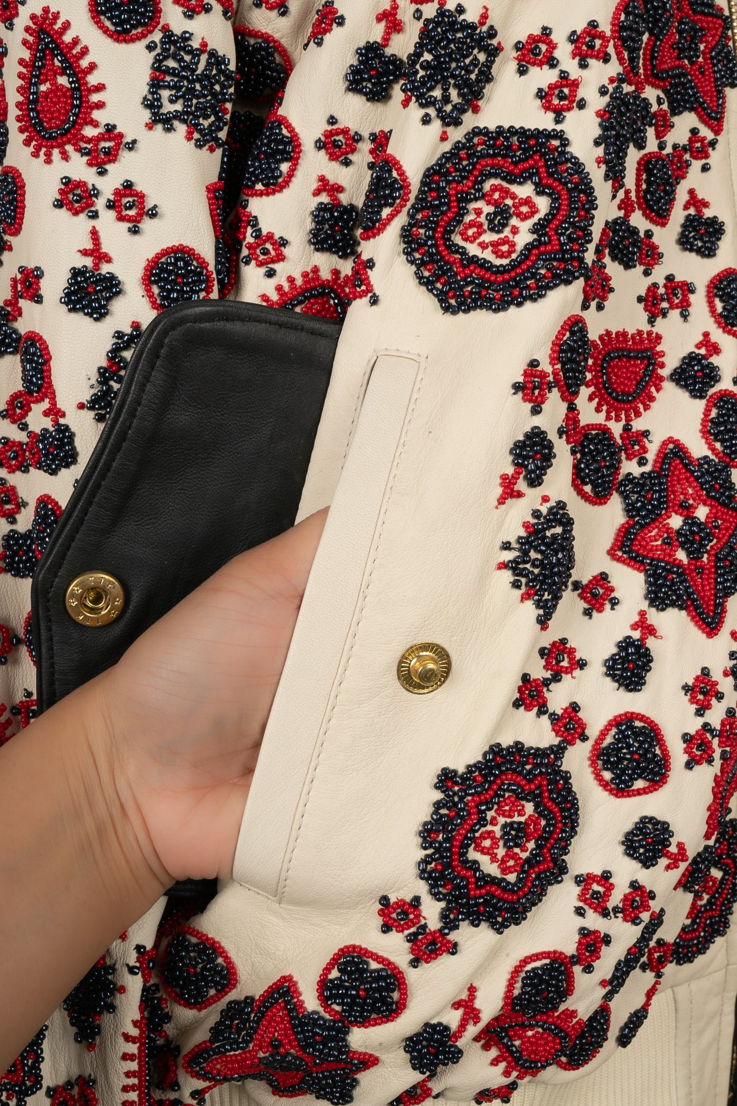 CHER MICHEL KLEIN - Veste en cuir d'agneau beige brodée de perles rouges et bleues. Taille 36FR.
