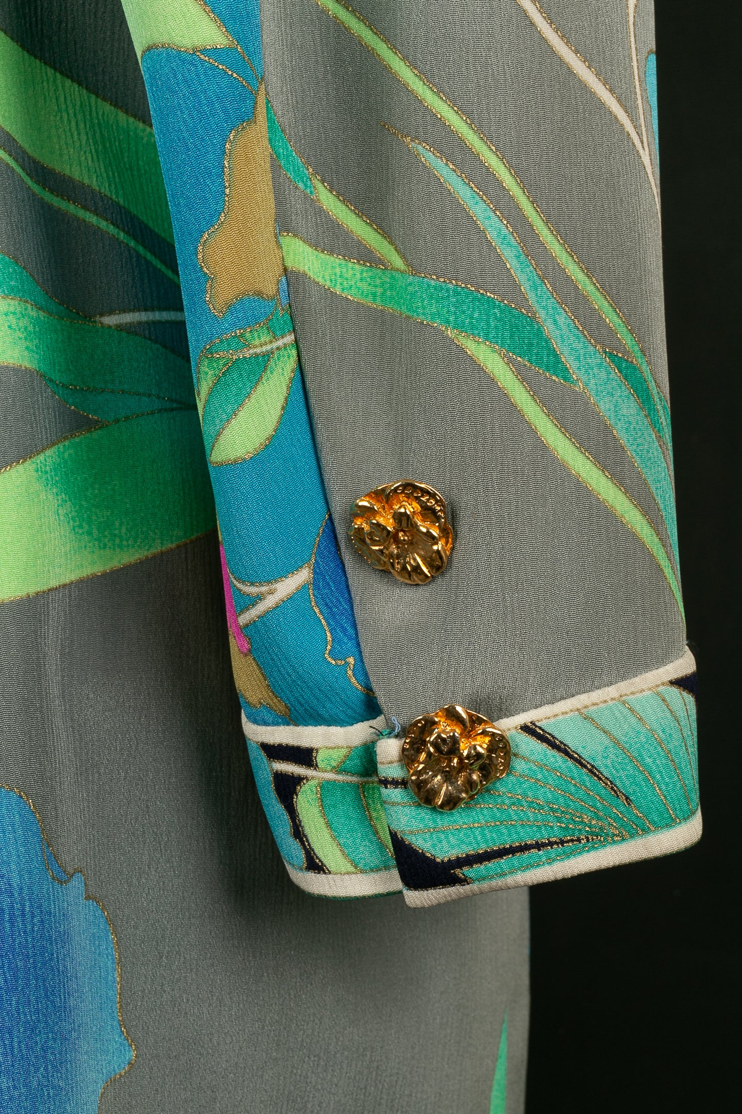LÉONARD -(Made in France) Veste en soie dans les tons de bleu et vert. Marquée taille 3, elle correspond à un 42FR. A signaler, rares traces sur la doublure.