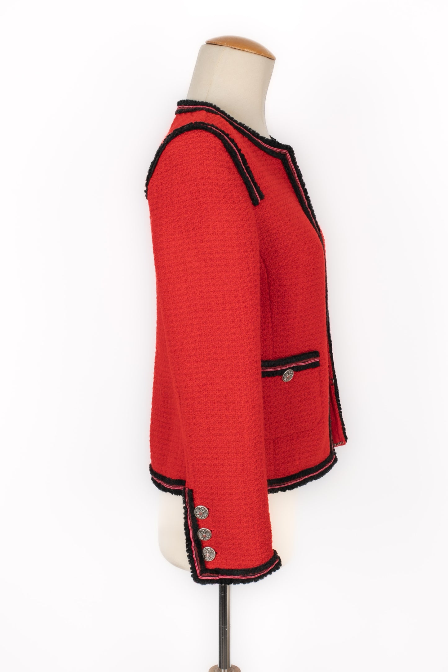 CHANEL - (Made in France) Veste courte en laine rouge, galons noir et rose, boutons en métal argenté ajouré. Taille indiquée 38FR. Collection Paris-Moscou Pre-Fall 2009, sous la direction artistique de Karl Lagerfeld.